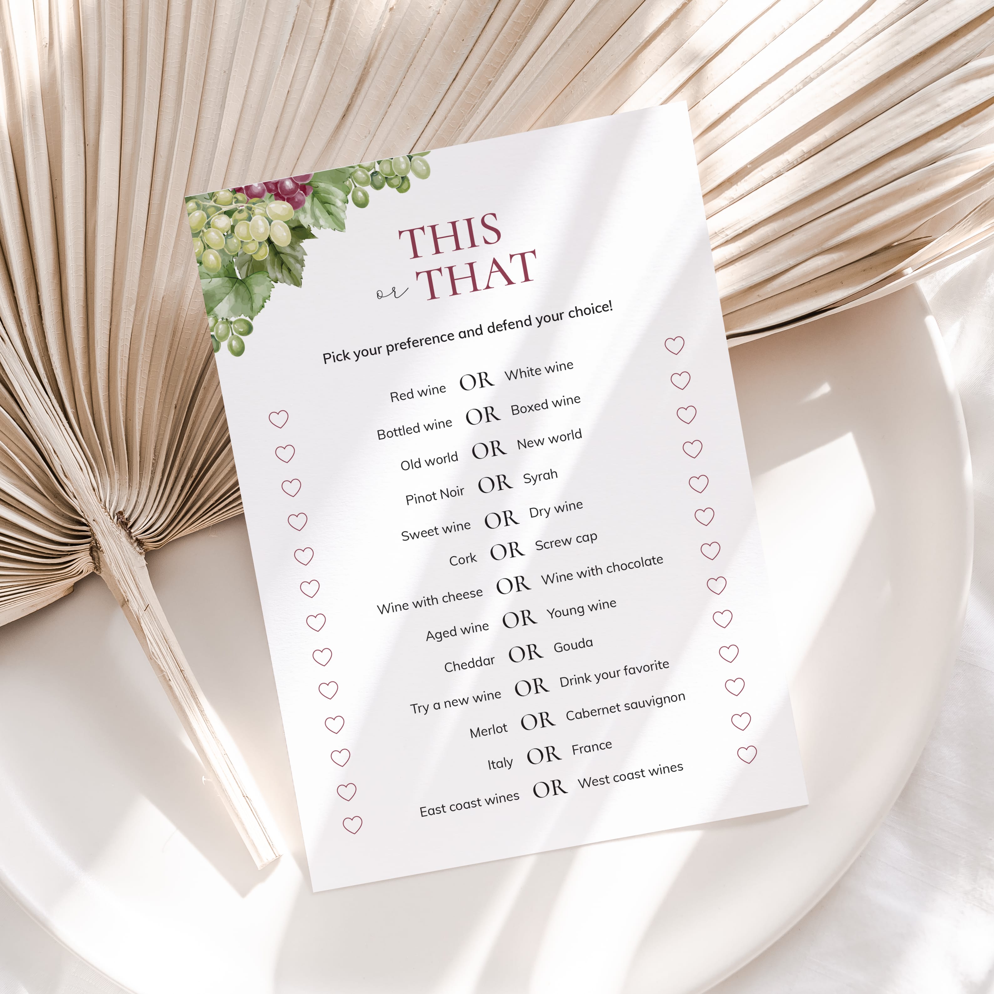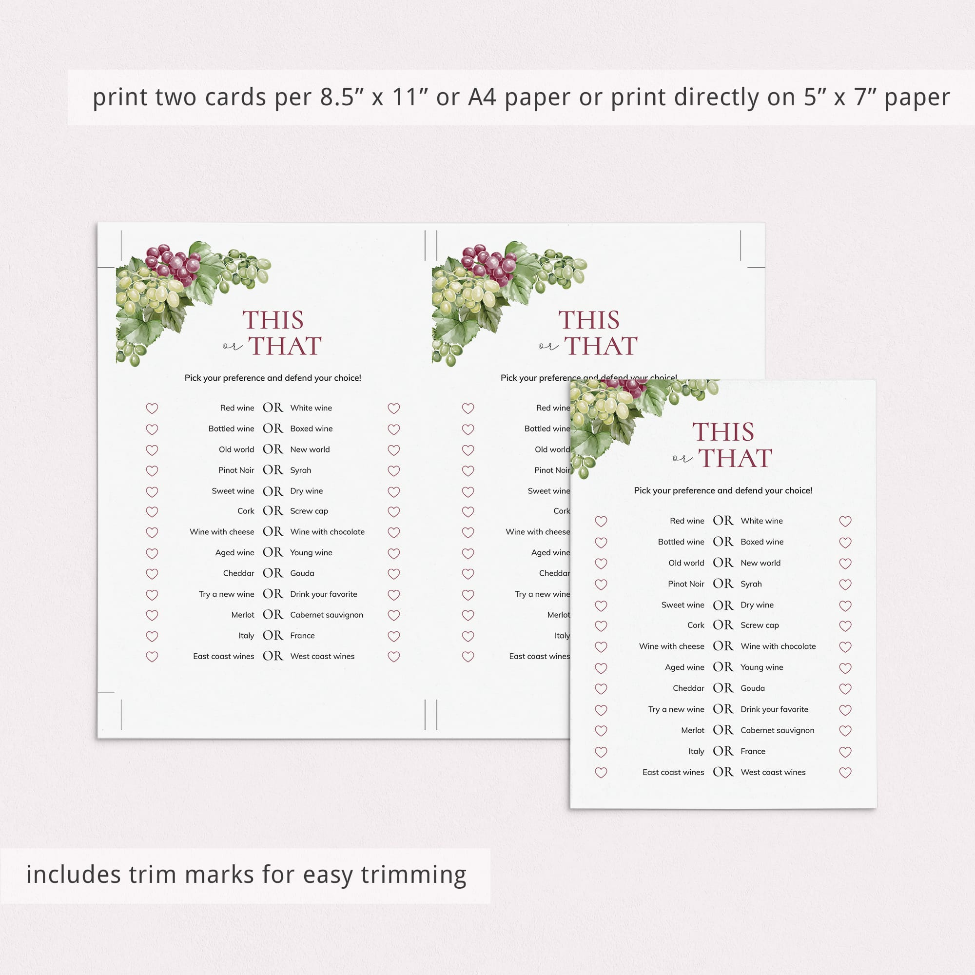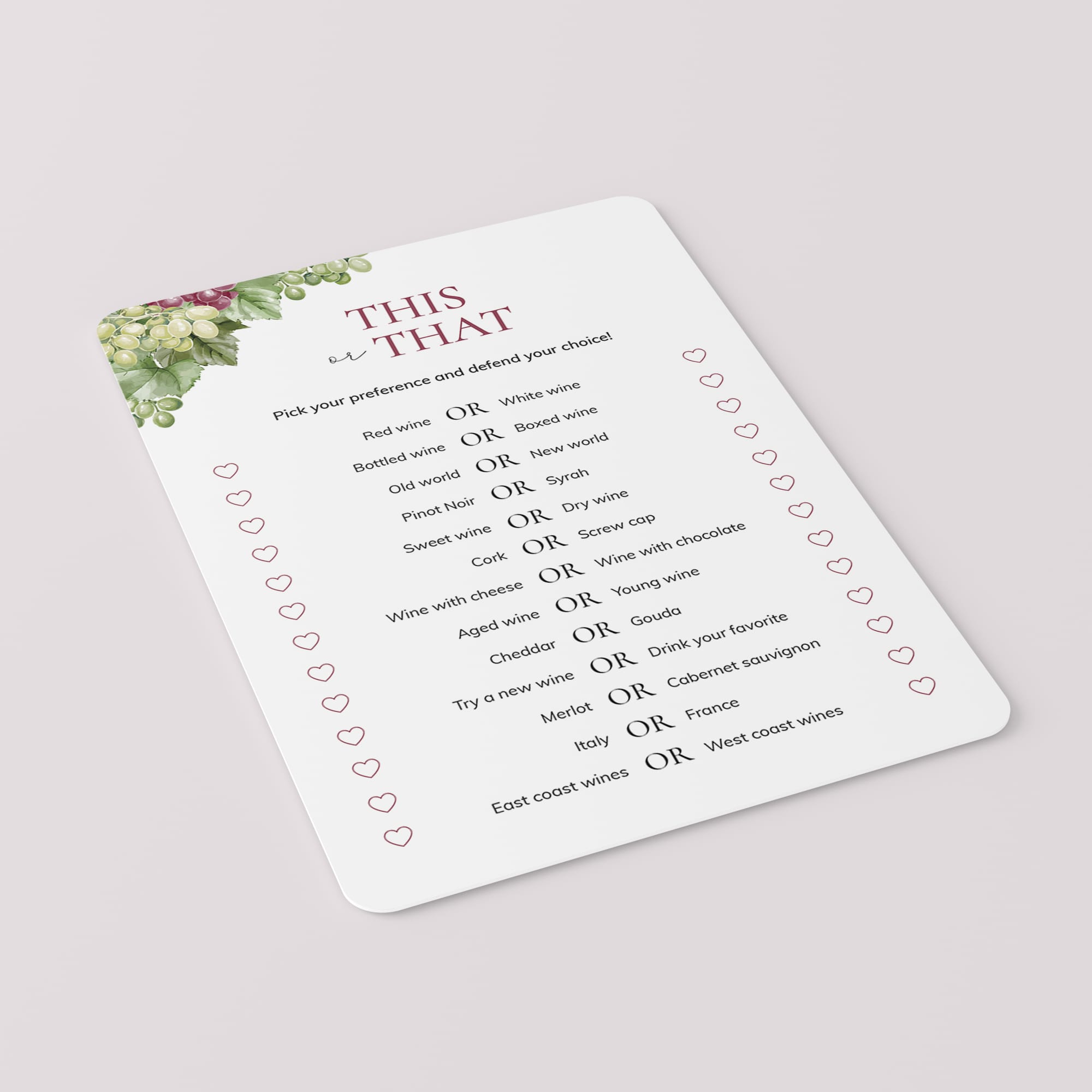 Are you looking for a fun icebreaker game for your next wine party? Play This or That. It's is a great conversation starter for groups. This watercolor game card has 13 Wine Party This or That questions. Have your friends pick their preferences and defend their choice. Would you rather drink your favorite or try a new wine?
