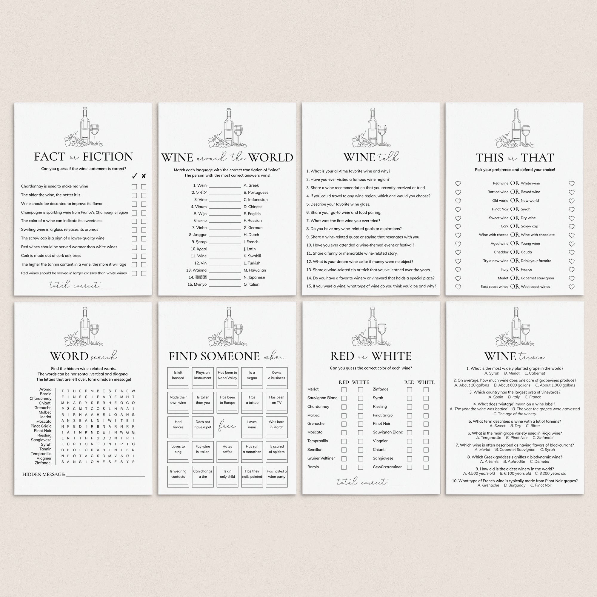Hosting a wine tasting party has never been easier with this fun Wine Games Bundle. Whether you're a seasoned host or planning your first wine-themed event, these 8 games will ensure your party is a hit. All of the games are easy to set up, even at the last minute, so you’ll have everything you need to keep your guests entertained and engaged.