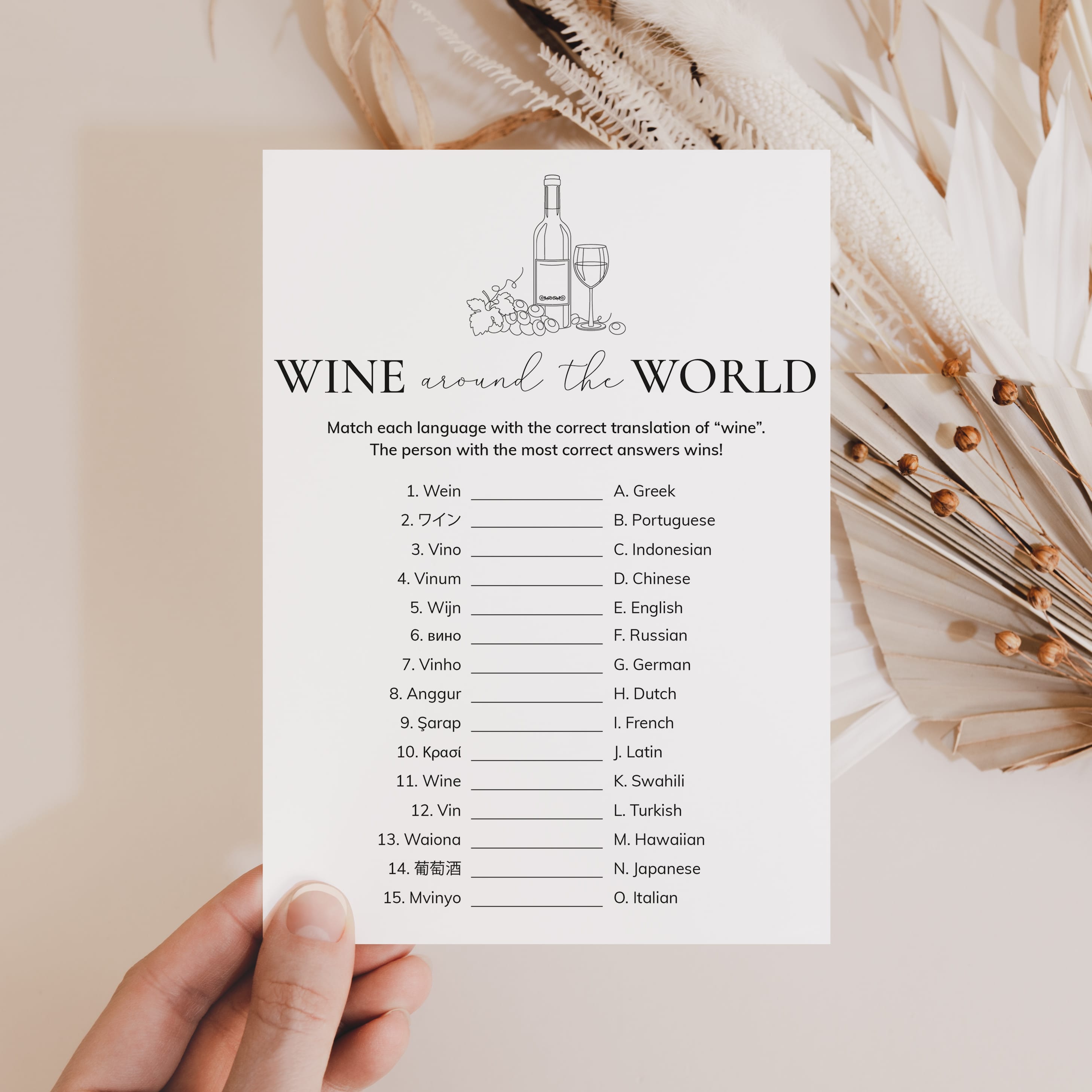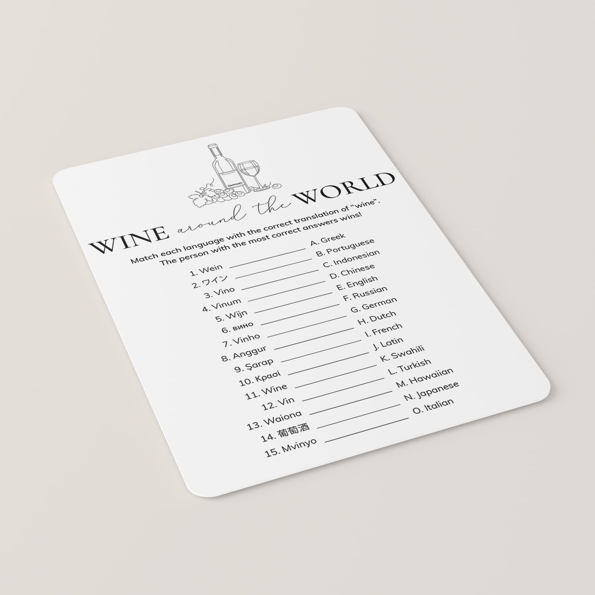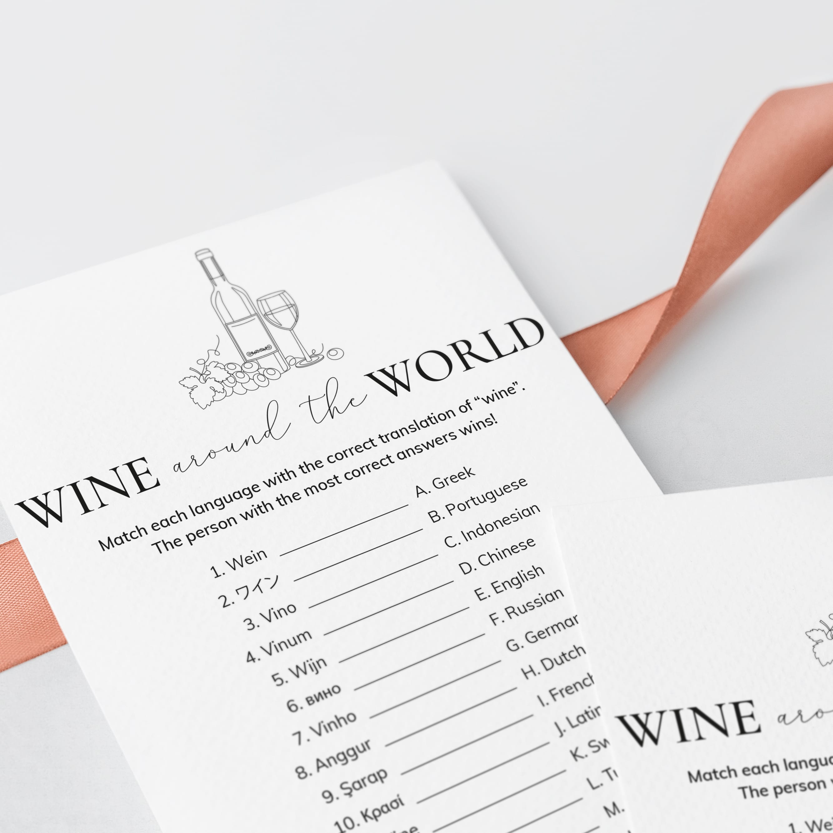 The game is very easy to play. Print and distribute these minimalist, yet elegant, Wine Around The World game cards and a pen to each of your guests. They have to match each version of the word “Wine” with its language of origin. The person with the most correct answers wins.