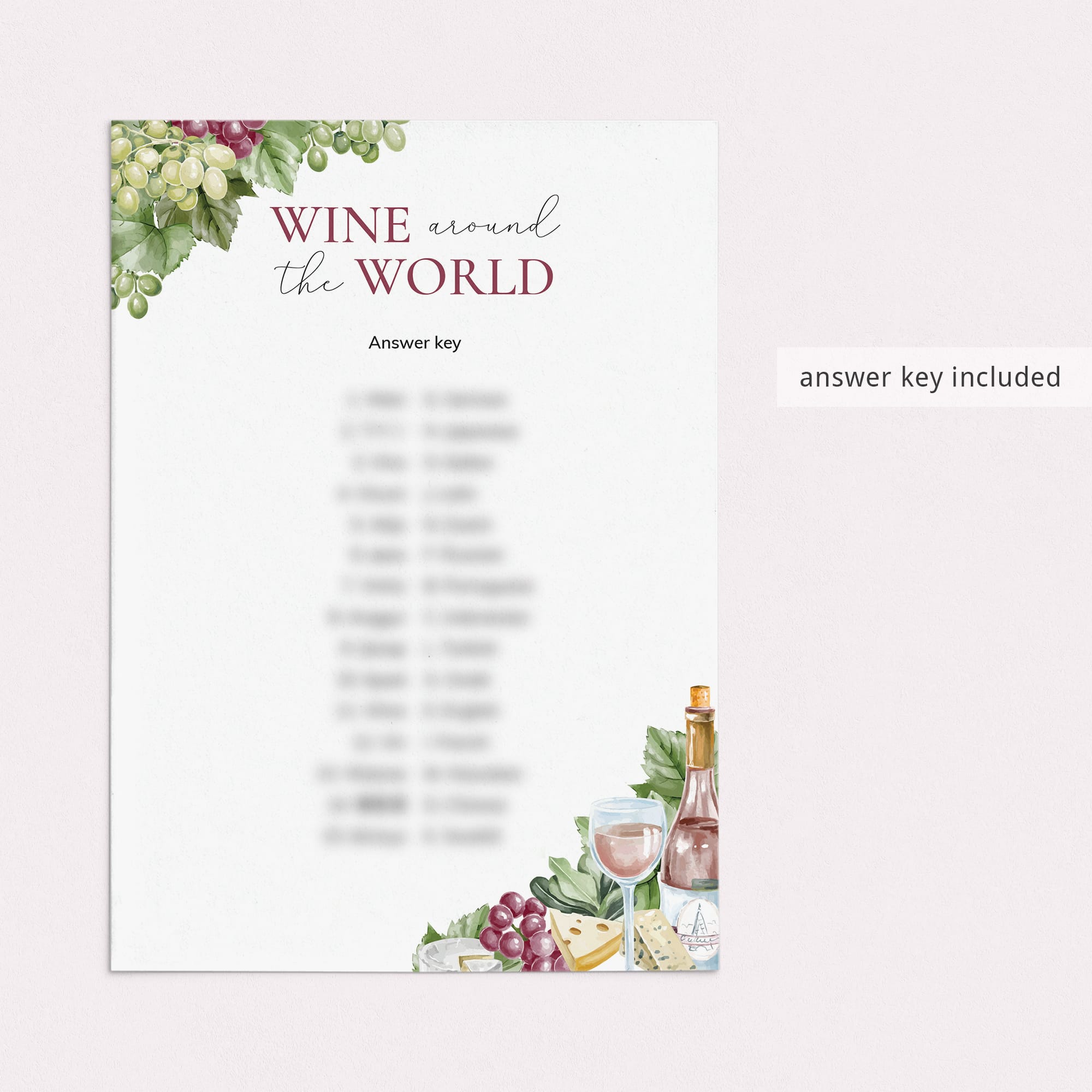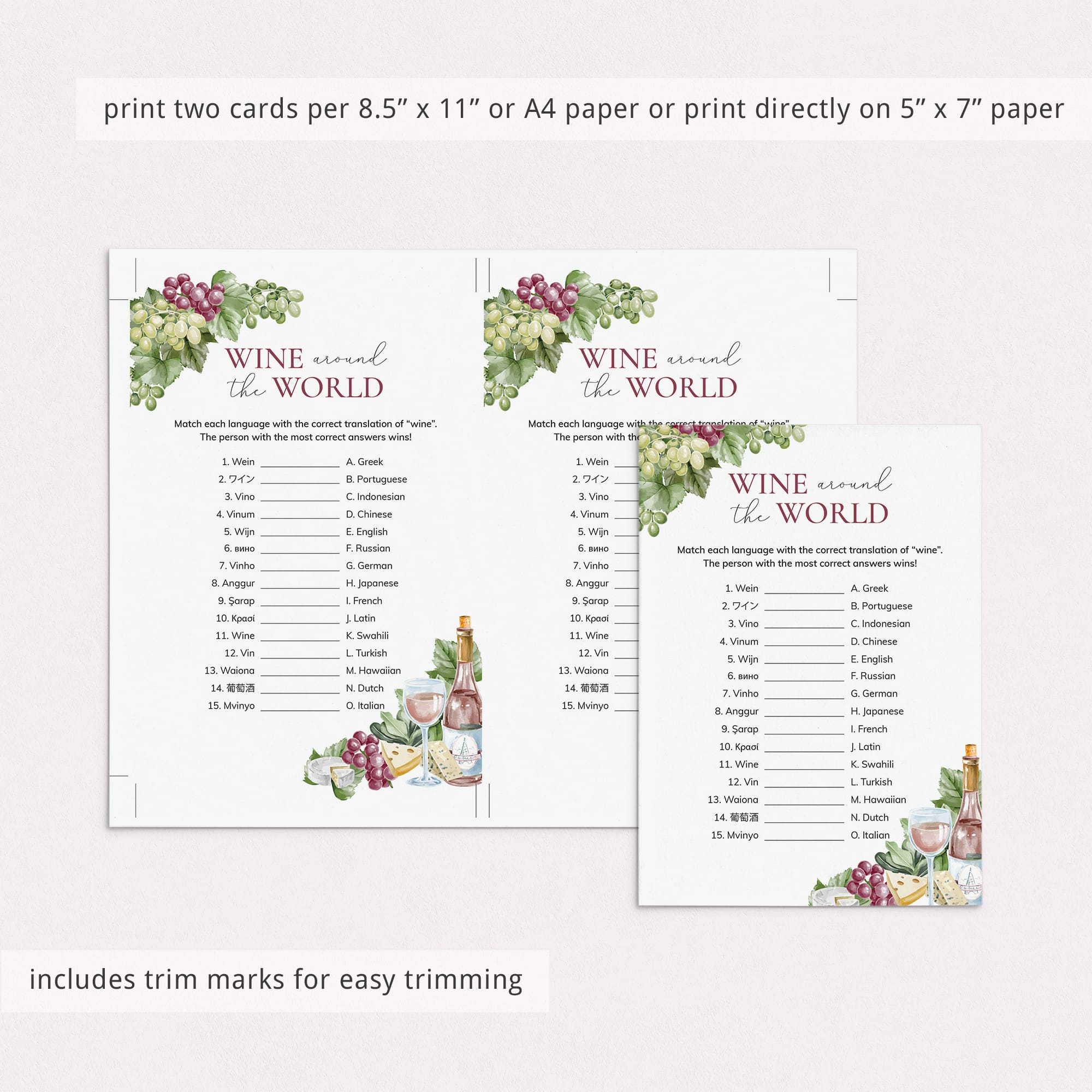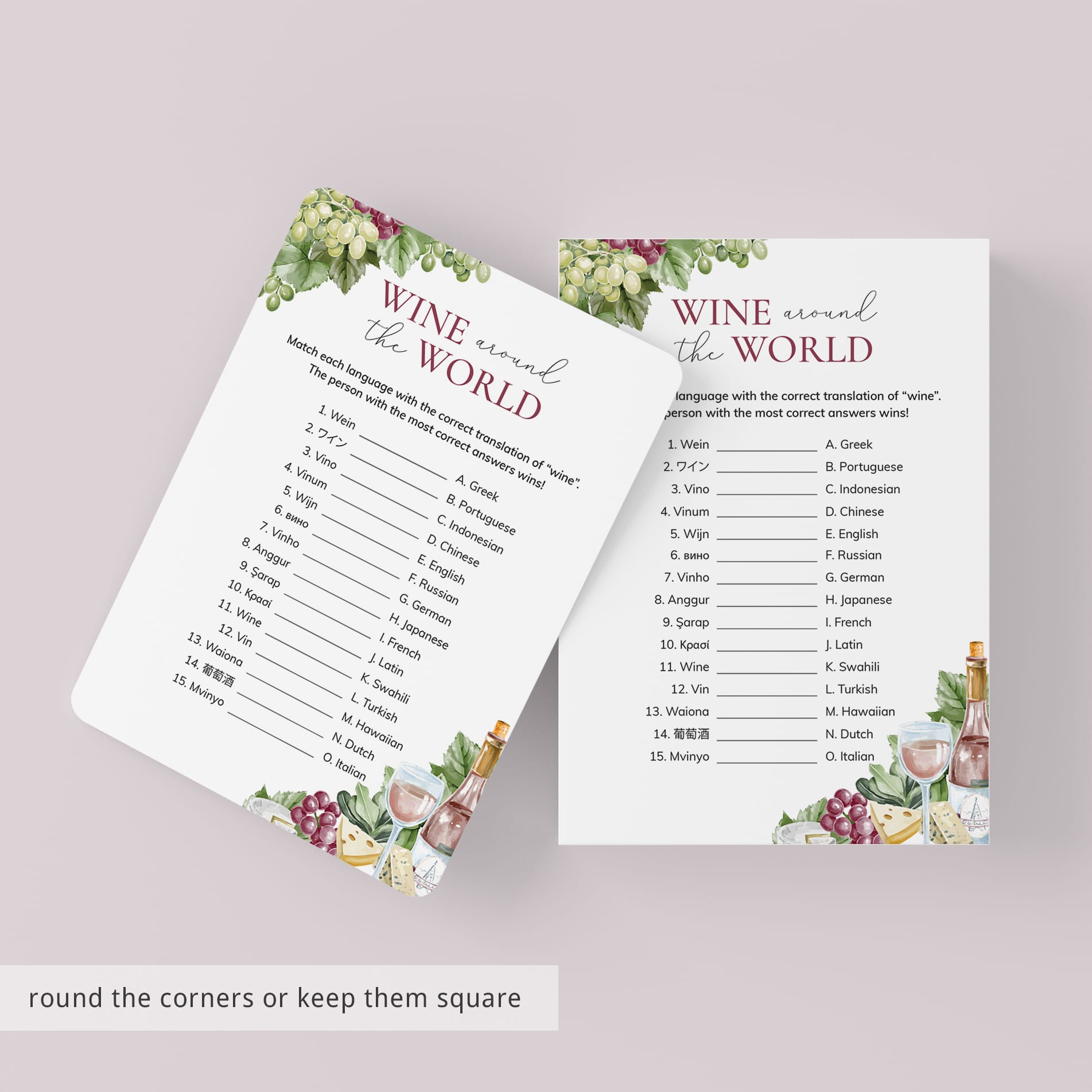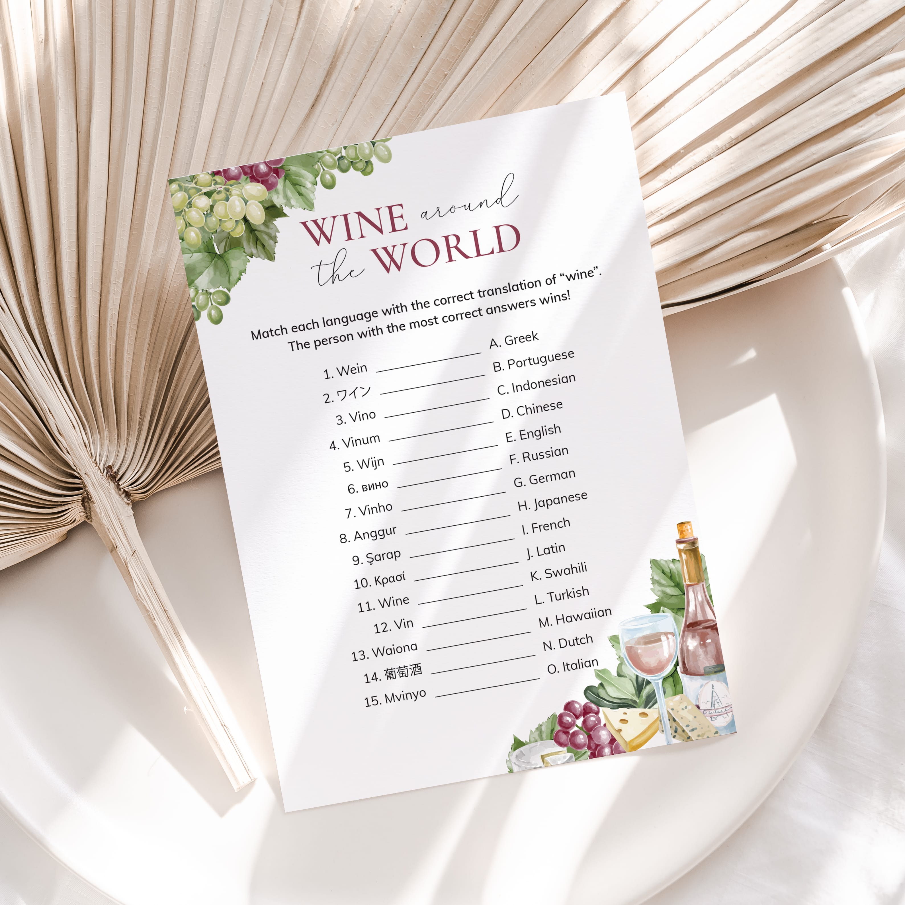 The game is very easy to play. Print and distribute these watercolor Wine Around The World game cards and a pen to each of your guests. They have to match each version of the word “Wine” with its language of origin. The person with the most correct answers wins.