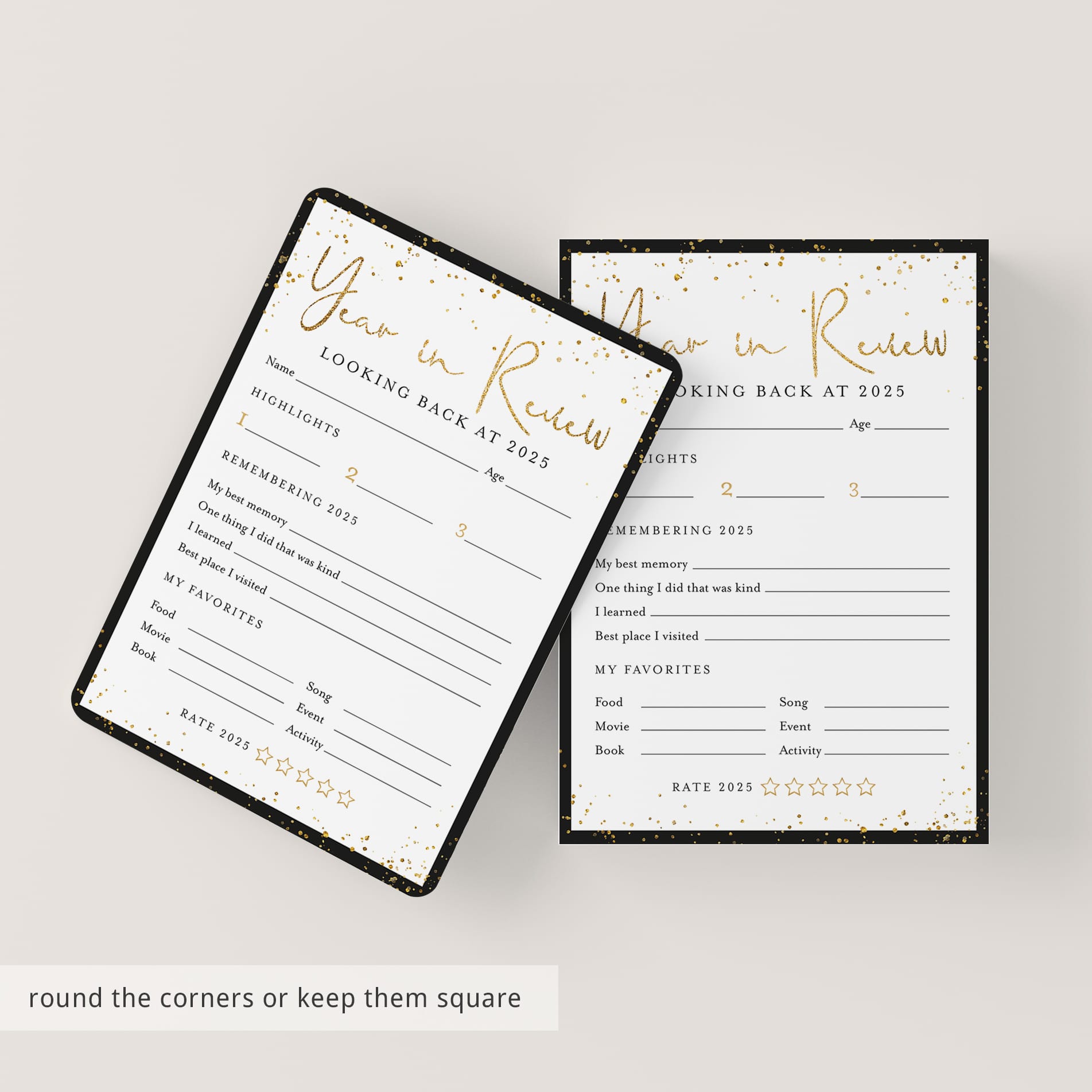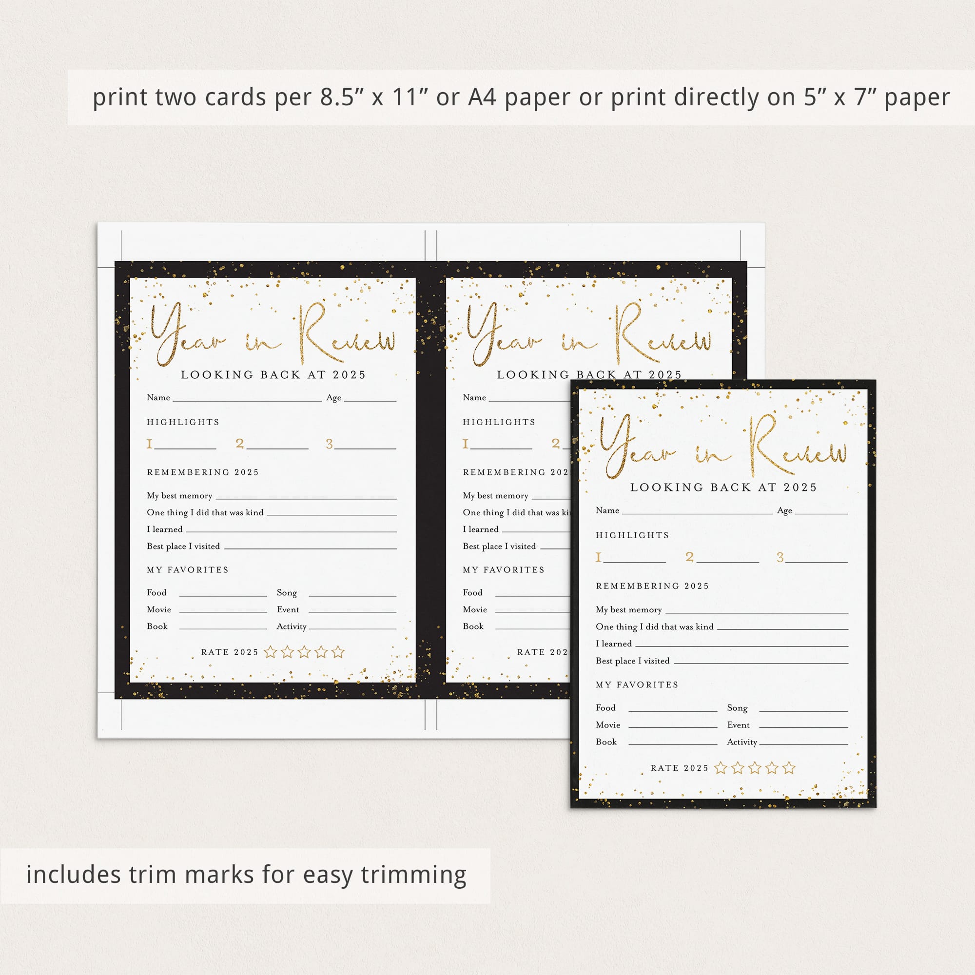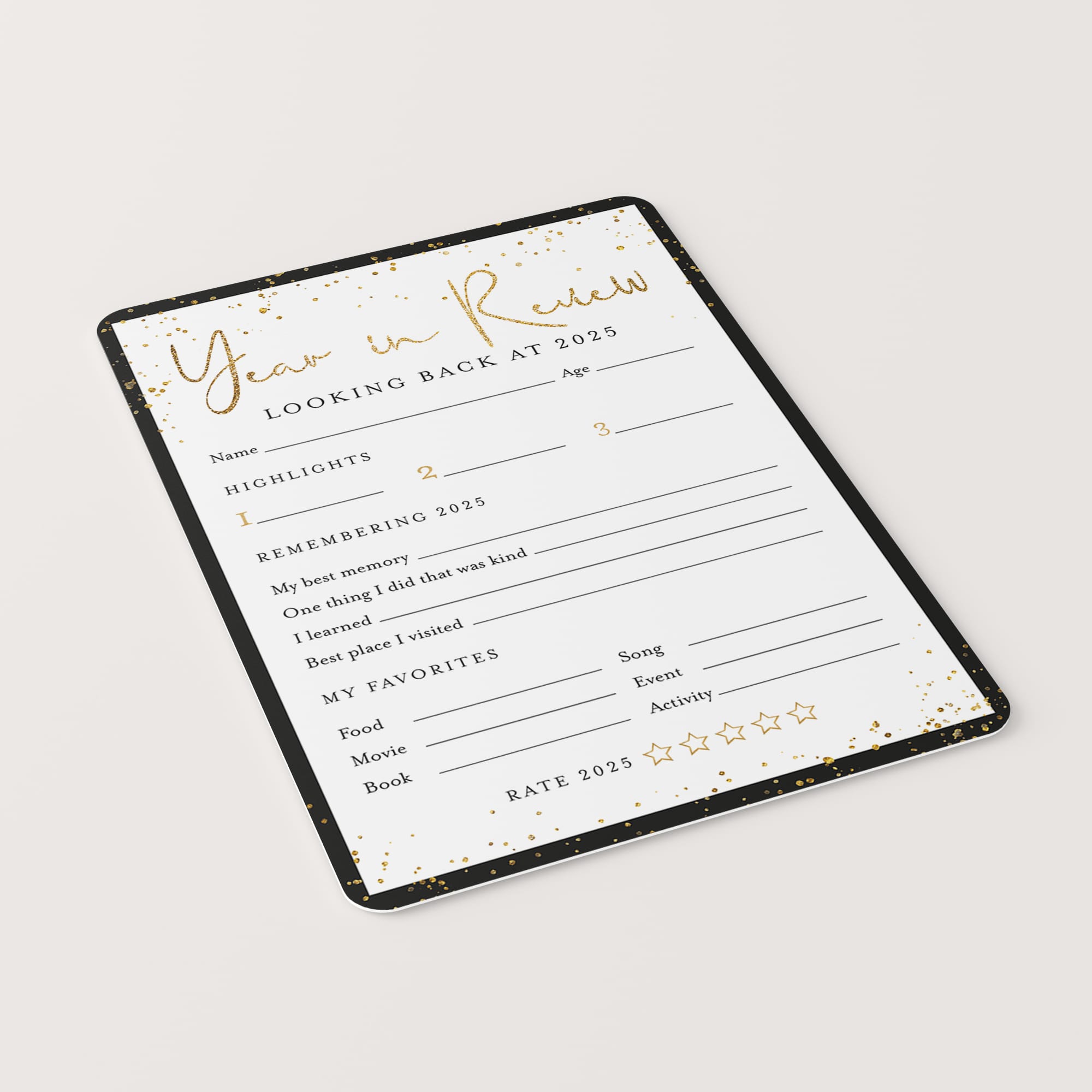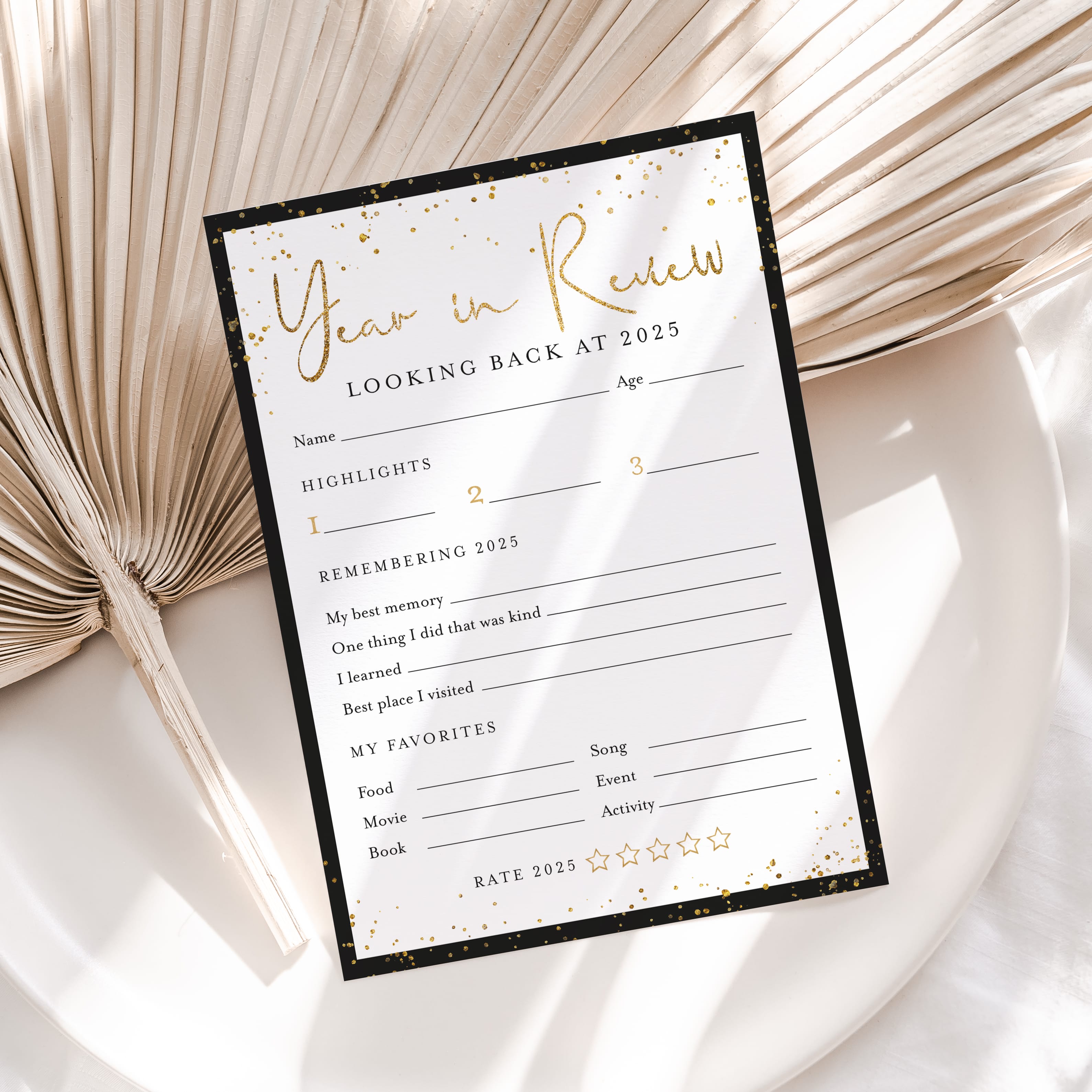Take a look back at 2025 with this black and gold 2025 Year in Review card. This printable Year in Review will help you reflect on the past year. It's a great activity for both kids and adults and a wonderful keepsake. Write down your highlights of 2025, your best memories and your favorites of the year.