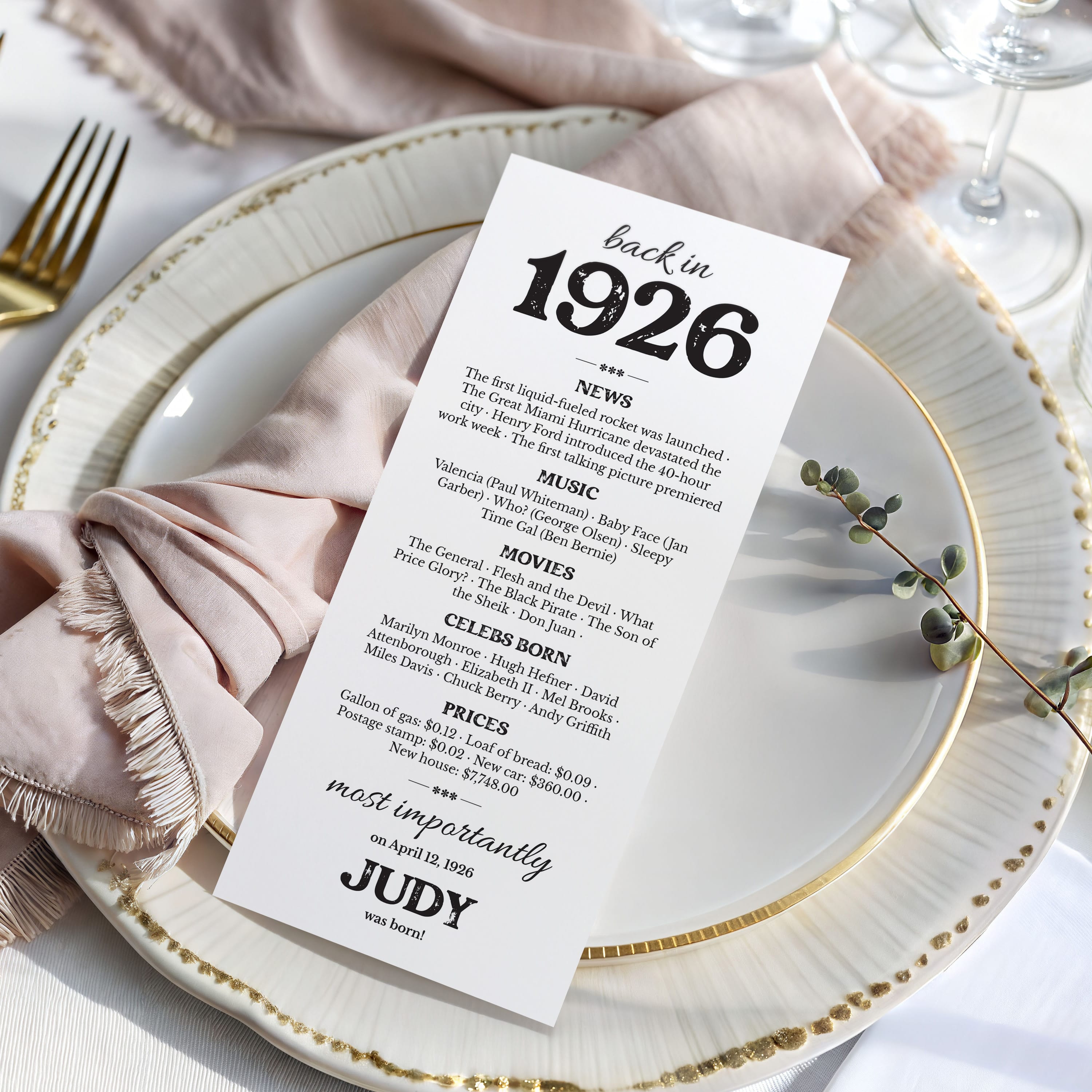 Looking for a nostalgic way to add a personal touch to a 100th birthday? This “Back in 1926” table card brings a charming vintage vibe to any 100th birthday celebration in 2026! The retro-inspired card, personalized with the honoree’s name and birth date, highlights fun and memorable facts from 1926.