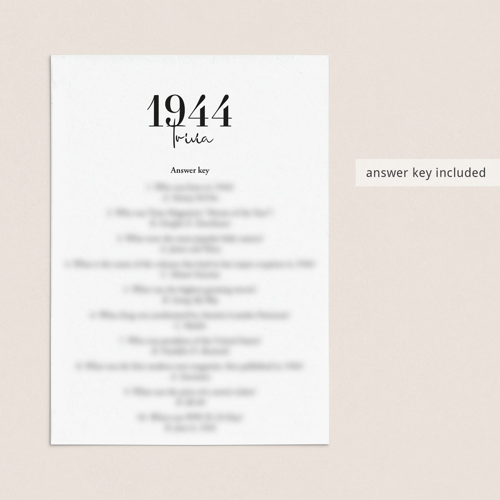 Just in case you are having trouble figuring out the answers, an answer key with the 1944 trivia answers is included.
