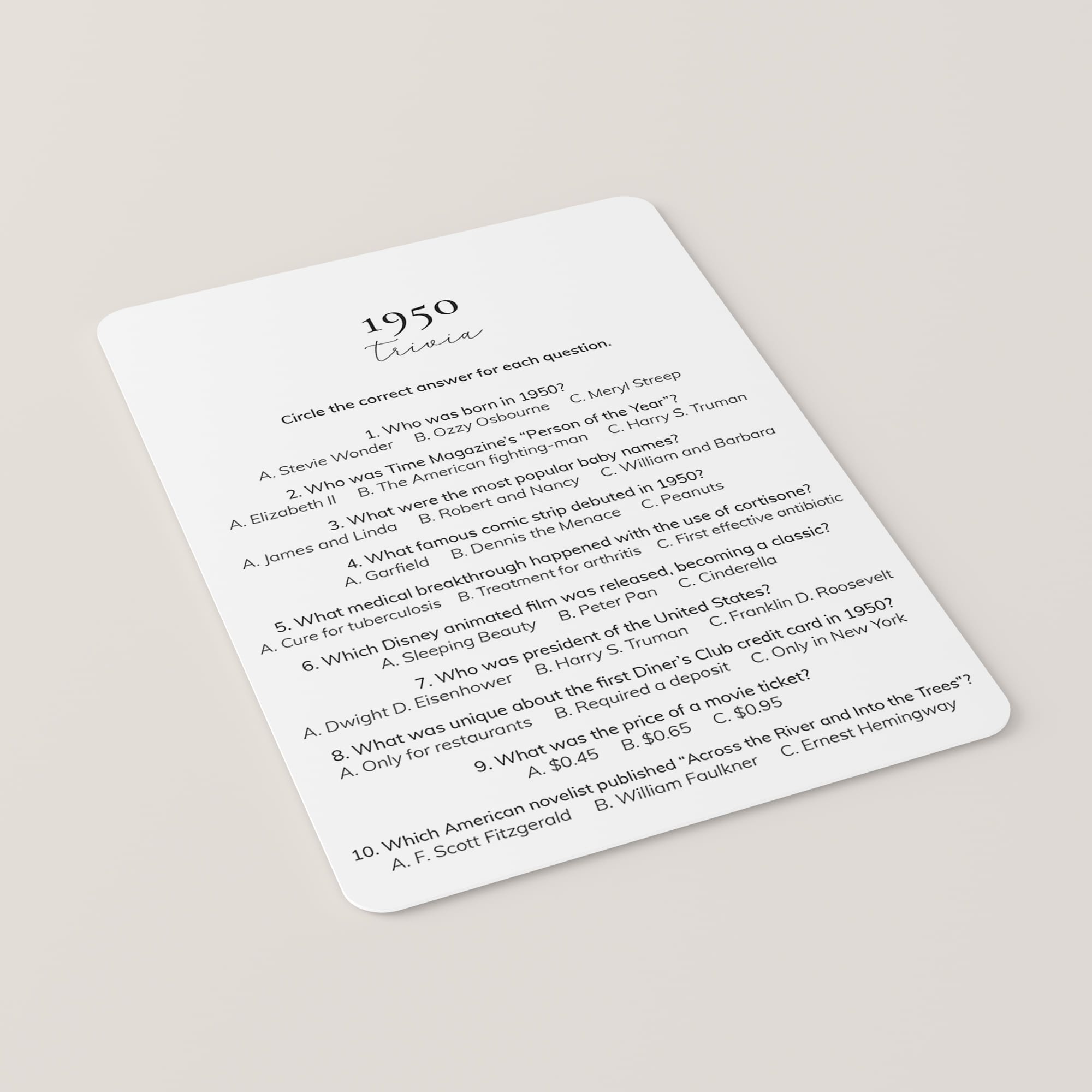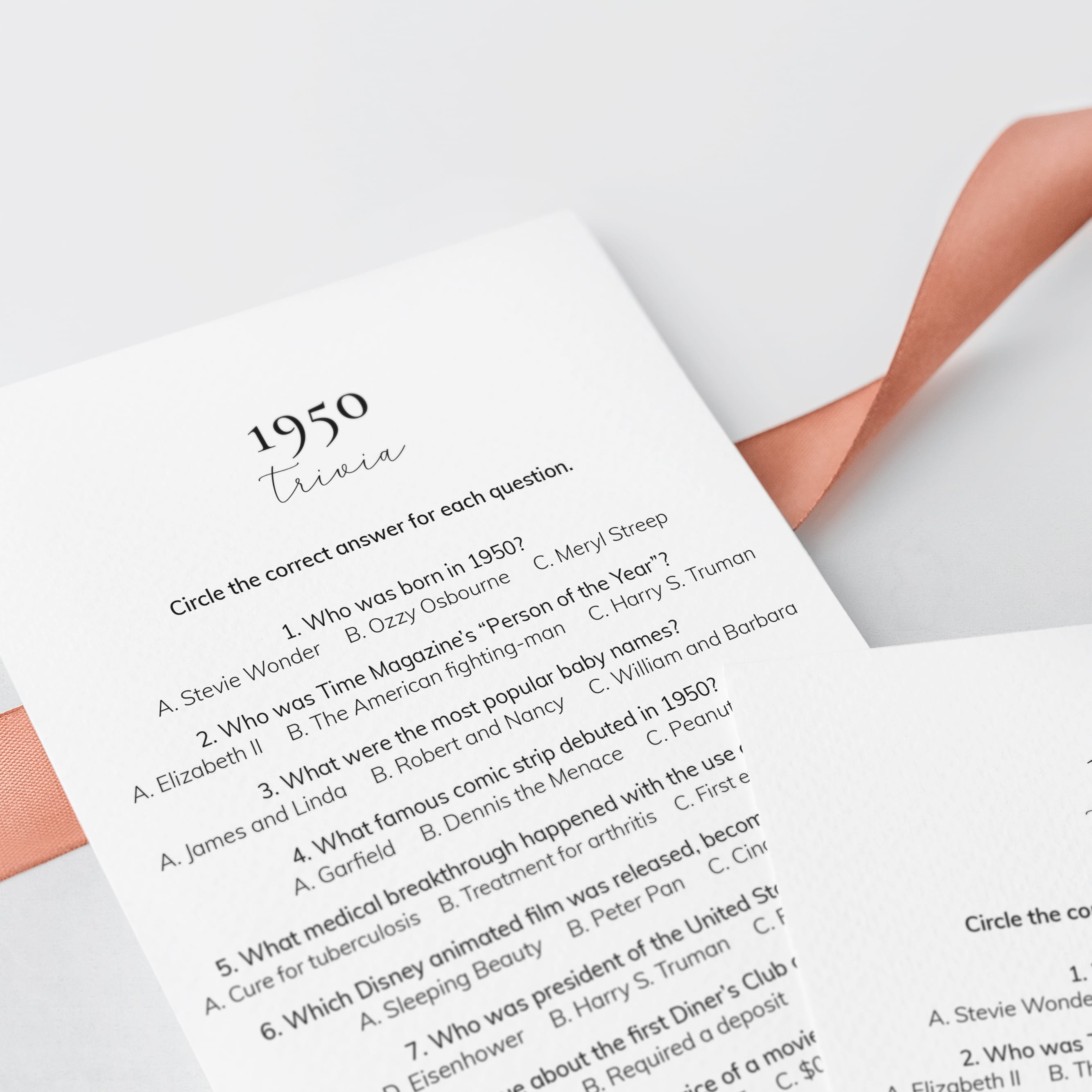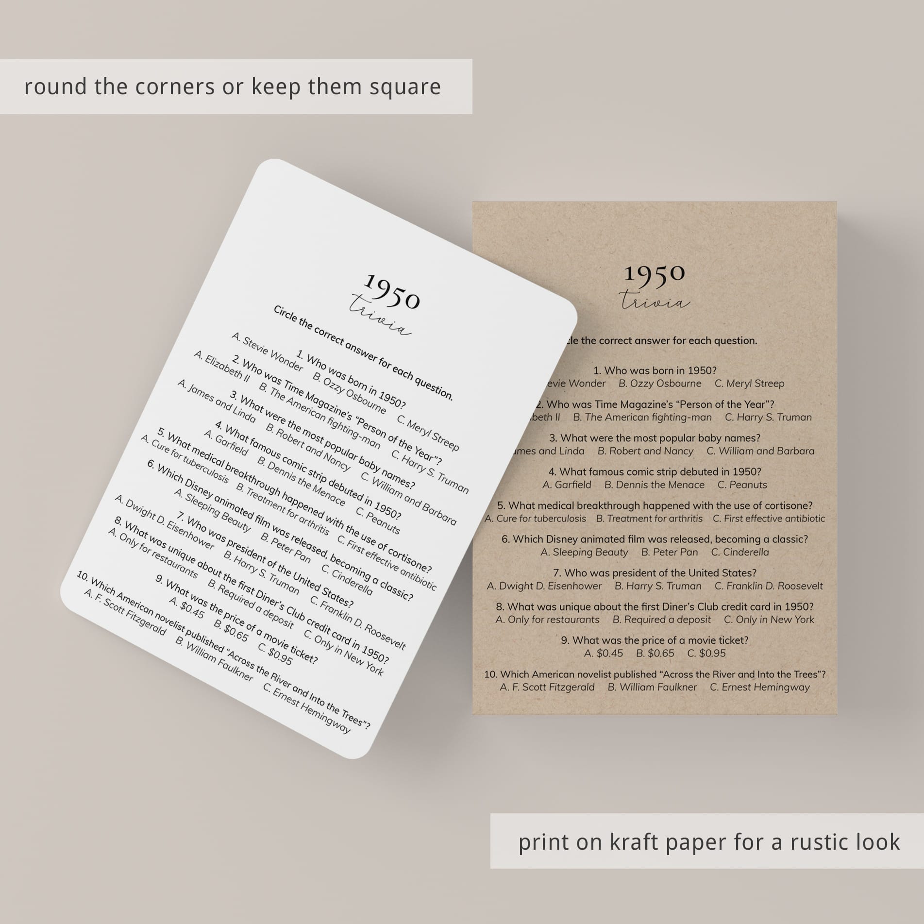 Are you looking for a fun quiz for a 75th birthday party? Look no further! This 1950 Quiz with 10 multiple choice questions is such a fun game to play with your friends and family. Test your guests how well they know 1950's pop culture. It's the perfect addition to a birthday celebration for someone born in 1950.