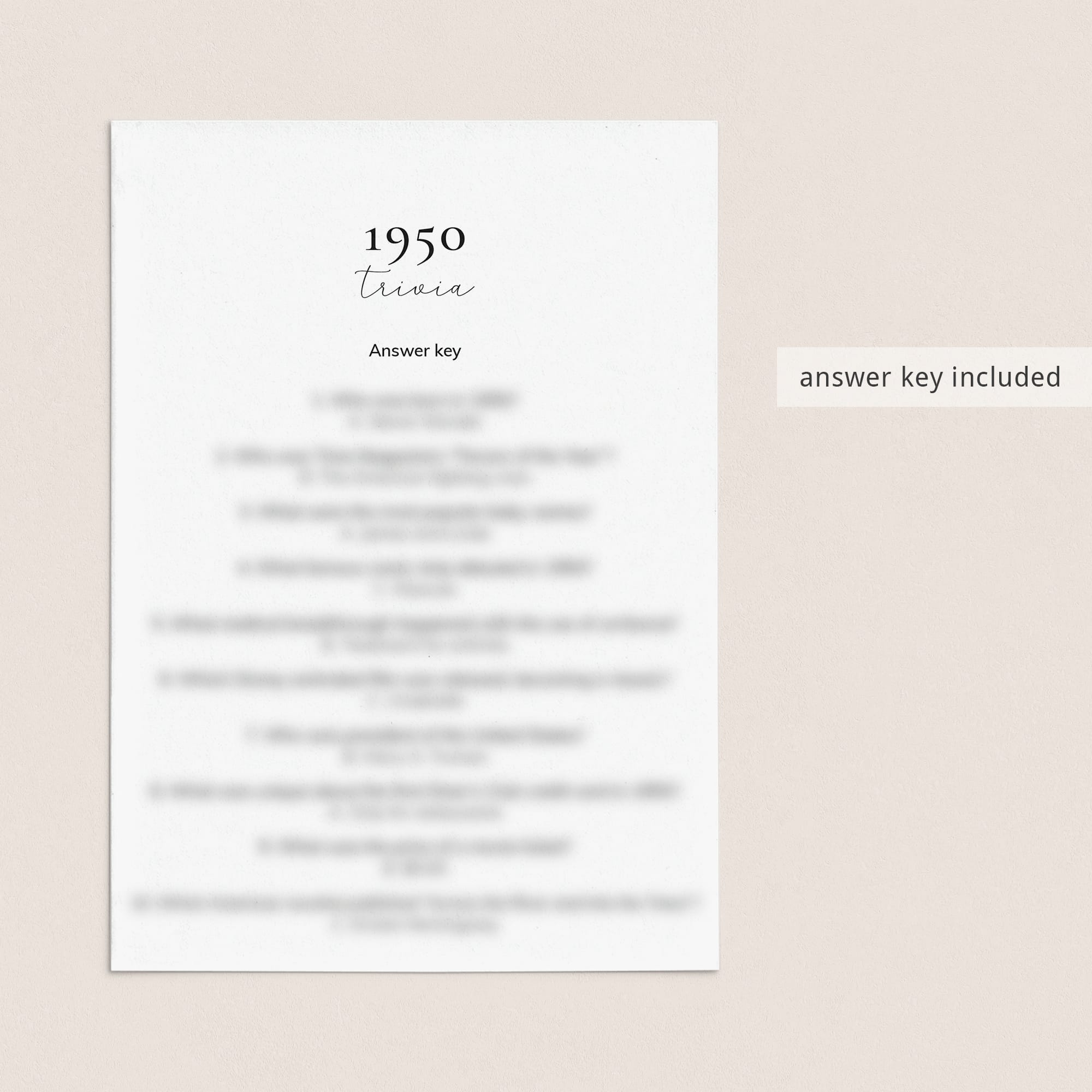Just in case you are having trouble figuring out the answers, an answer key with the year 1950 quiz answers is included.