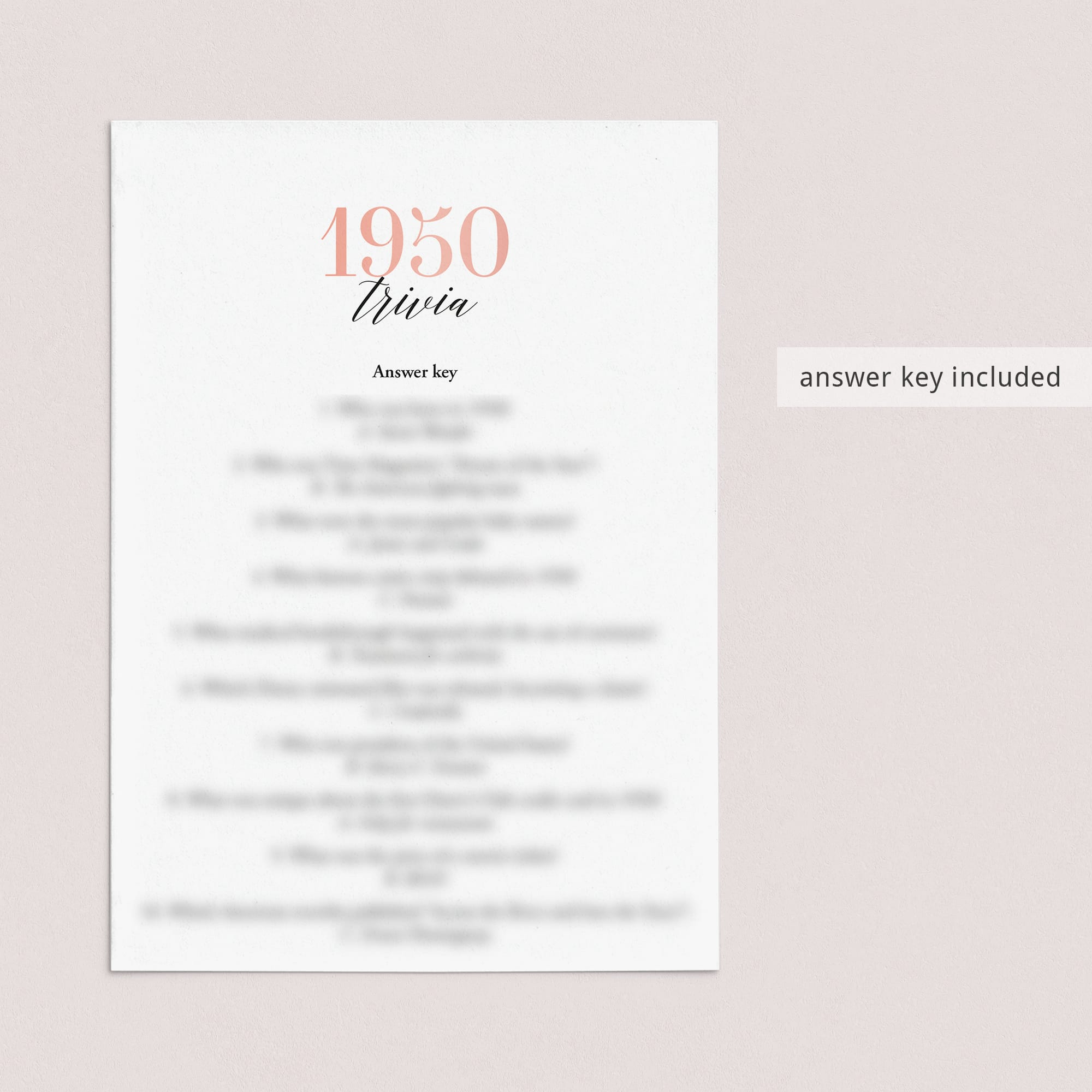 Just in case you are having trouble figuring out the answers, an answer key with the 1950 trivia answers is included.