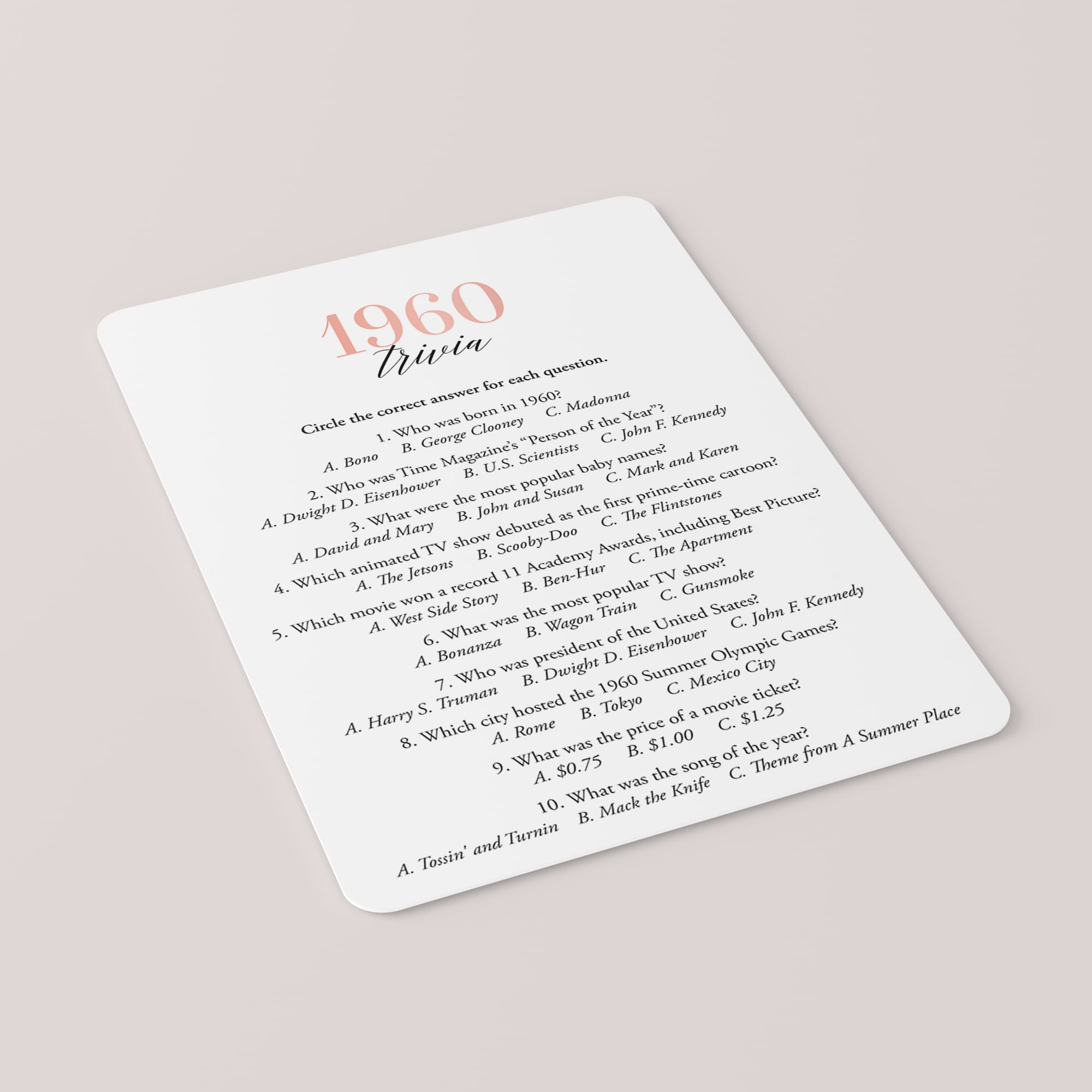 Are you looking for a fun game for a 65th birthday party? Look no further! This 1960 trivia quiz with 10 multiple choice questions is such a fun game to play with your friends and family. Test your guests how well they know 1960's pop culture. It's the perfect addition to a birthday party for a woman born in 1960.