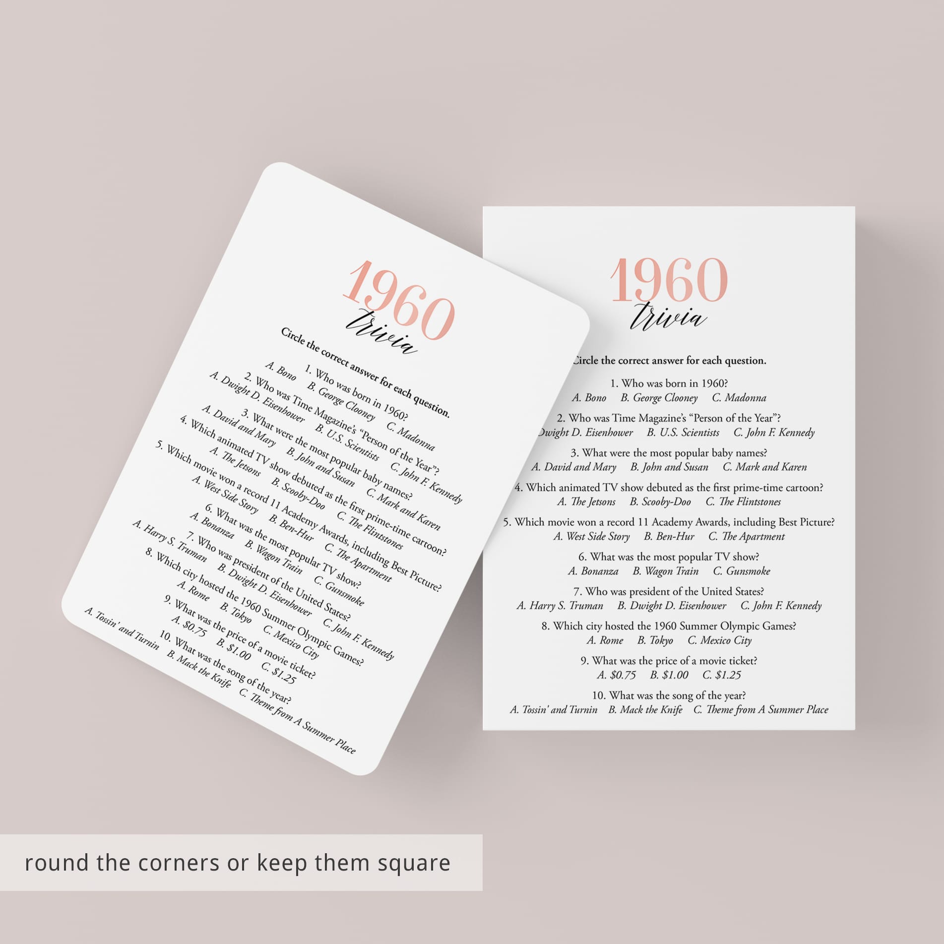 This 1960 trivia is a digital download. After purchase you will receive a download link immediately on screen. Also within minutes of your order and payment, an e-mail will be sent to you with a link for your download.