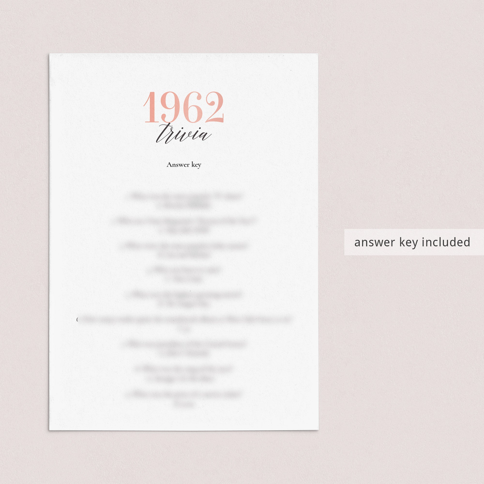 Just in case you are having trouble figuring out the answers, an answer key with the 1962 trivia answers is included.