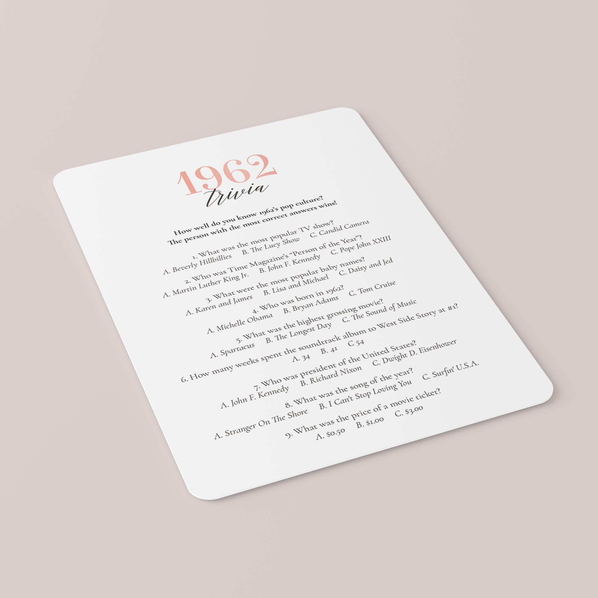 Are you looking for a fun game for a 63rd anniversary or 63rd birthday party? Look no further! This 1962 trivia game is such a fun game to play with your friends and family. Test your guests how well they know 1962's pop culture.