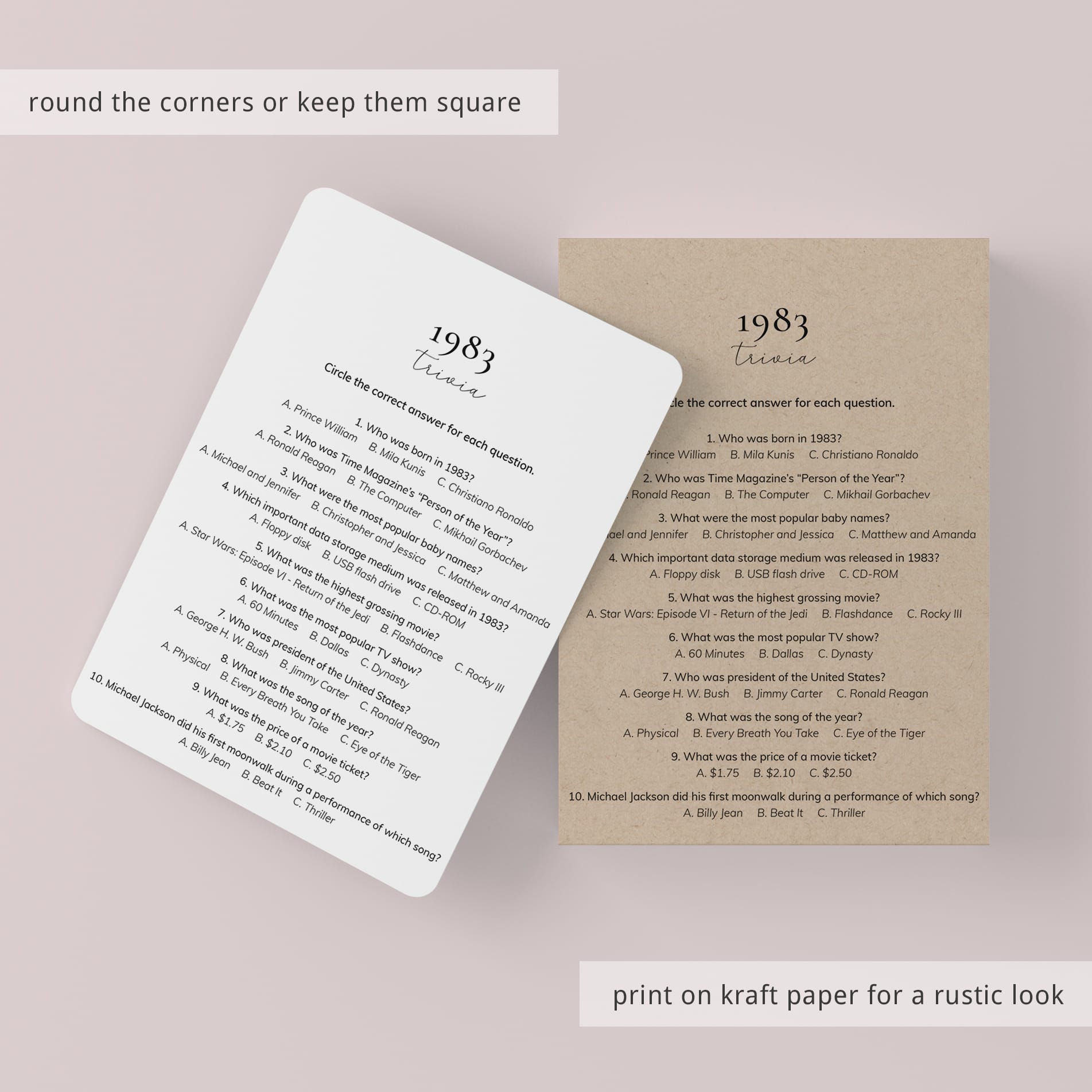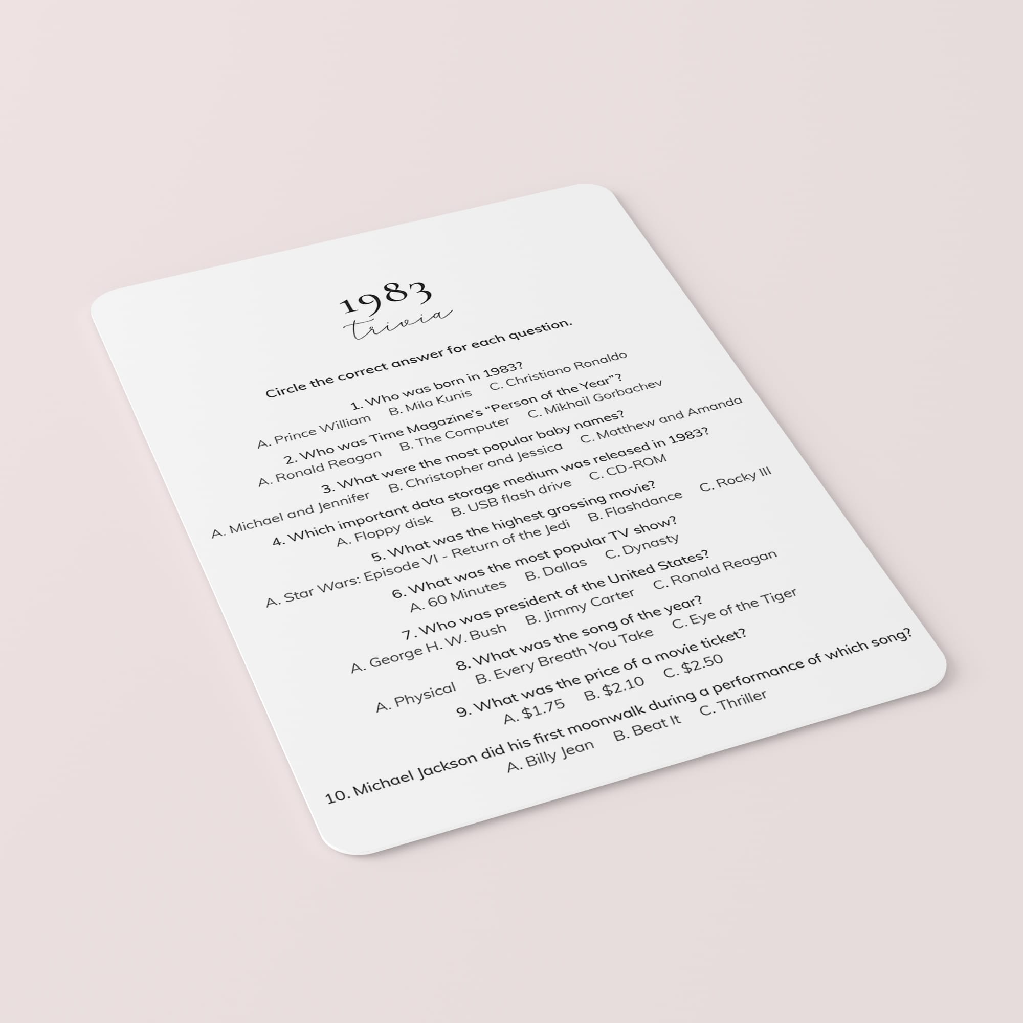 Are you looking for a fun quiz for a 42nd birthday party or 42nd anniversary? Look no further! This 1983 Quiz is such a fun game to play with your friends and family. Test your guests how well they know 1983's pop culture. It's the perfect addition to a birthday bash for someone born in 1983 or to an anniversary party for a couple married in 1983.