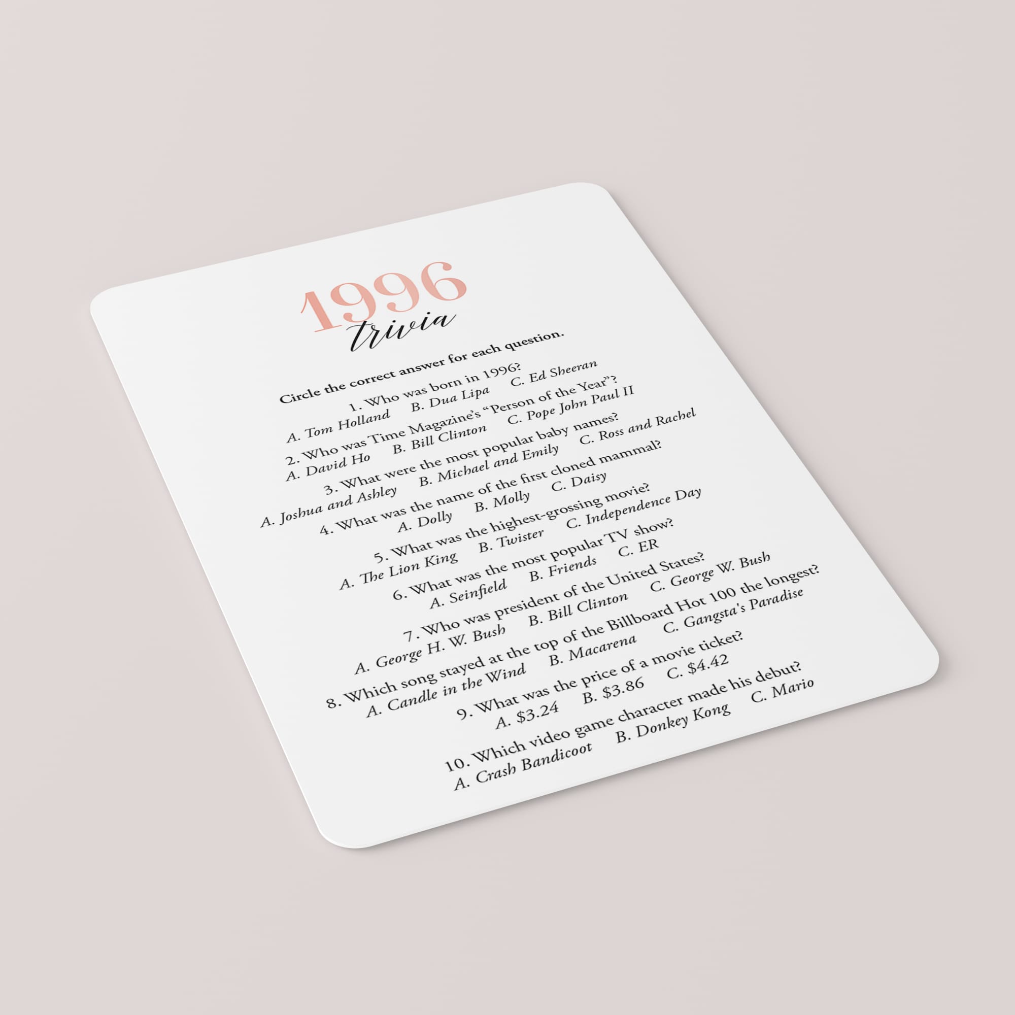Are you looking for a fun game for a 30th birthday party? Look no further! This 1996 trivia quiz with 10 multiple choice questions is such a fun game to play with your friends and family. Test your guests how well they know 1996's pop culture. It's the perfect addition to a birthday party for a woman born in 1996.