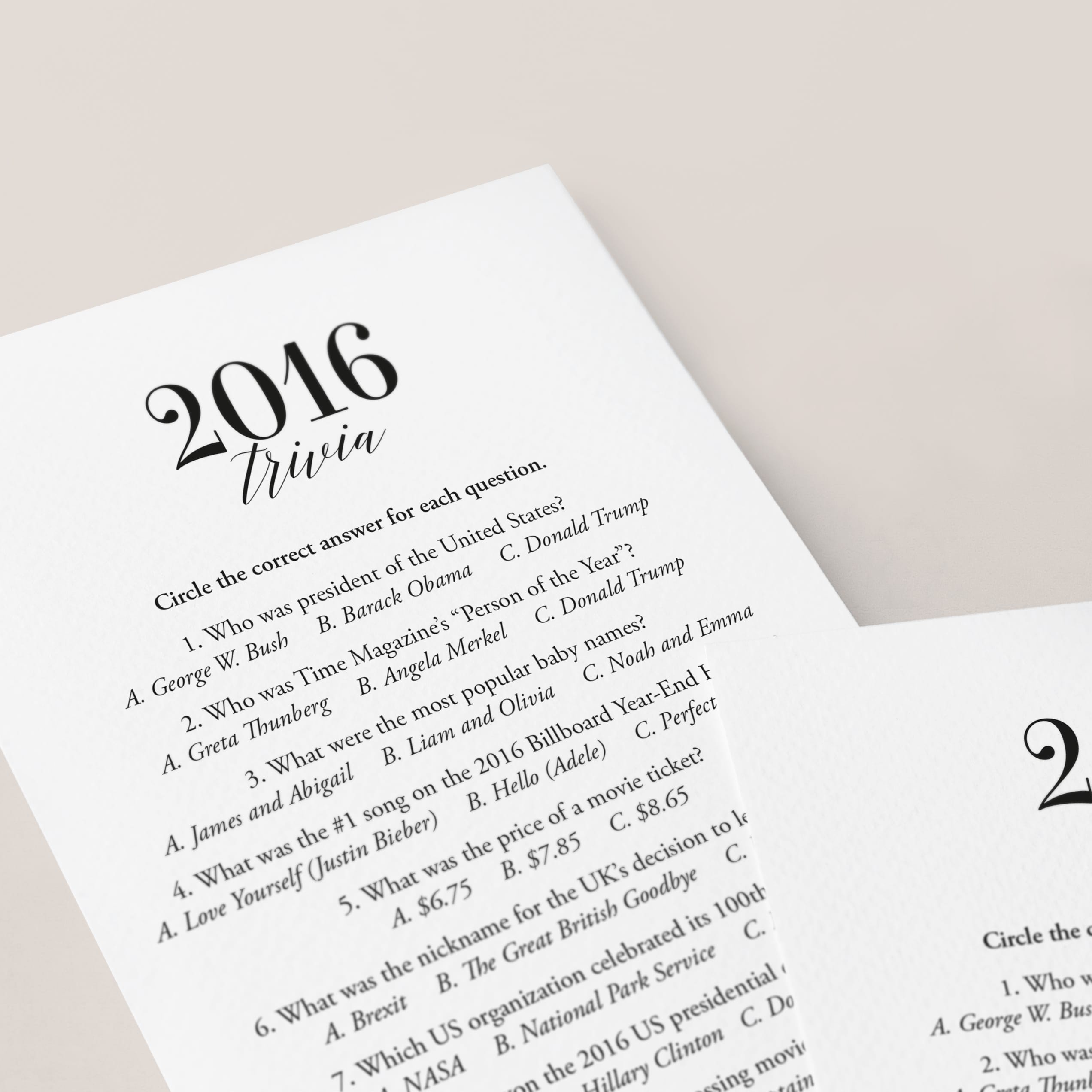Are you looking for a fun game for a 10th anniversary or 10th class reunion? Look no further! This modern minimalist 2016 trivia with 10 multiple choice questions is such a fun game to play with your friends and family. Test your guests how well they know 2016's pop culture, historical events and prices (based on US history and culture). It's the perfect addition to a celebration for a couple married in 2016 or a 2016 class reunion.