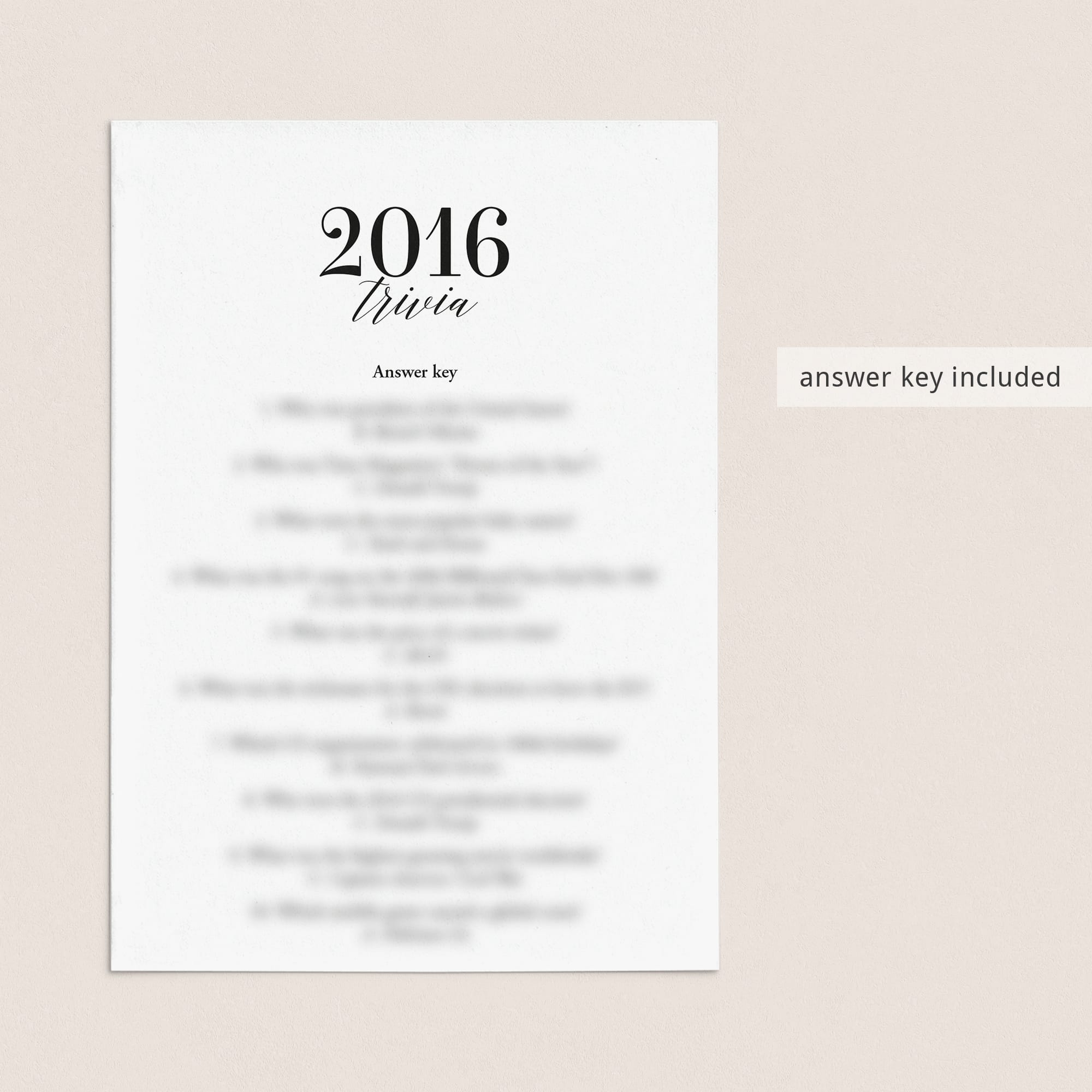 2016 Trivia Quiz with Answer Key Instant Download
