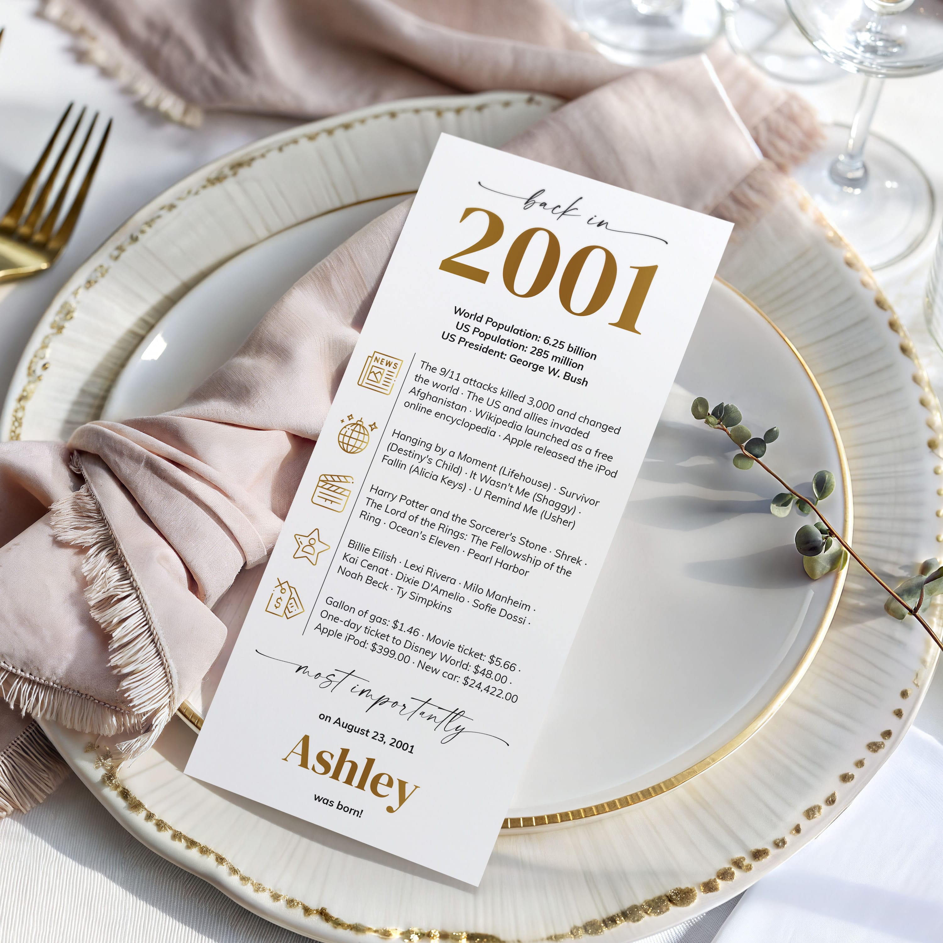 Looking for a stylish way to add a personal touch to a 25th birthday party? Our “Back in 2001” table card is a sleek and modern addition to any 25th birthday celebration in 2026.