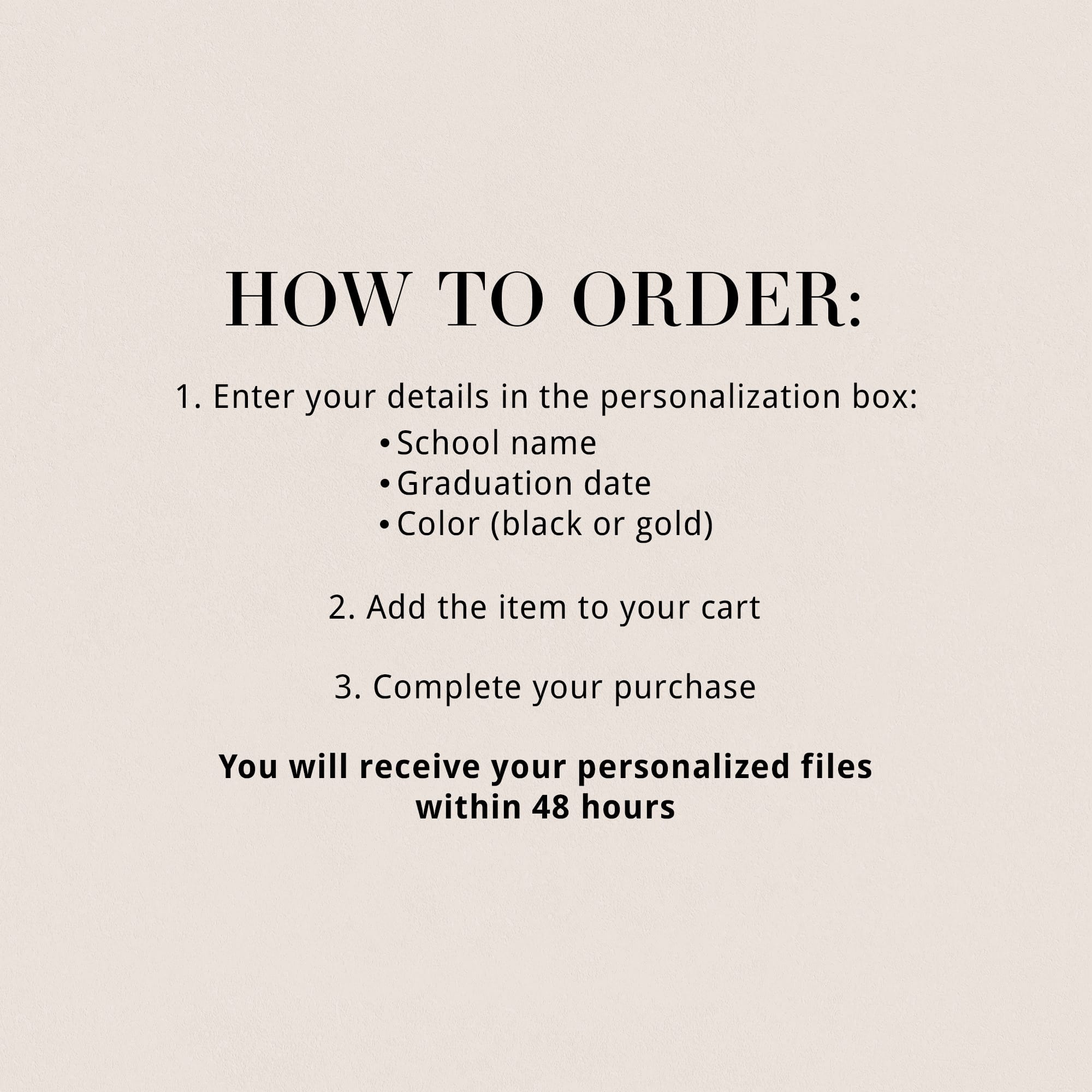 1. Add the school name, graduation date and preferred color (black or gold) in the personalization box