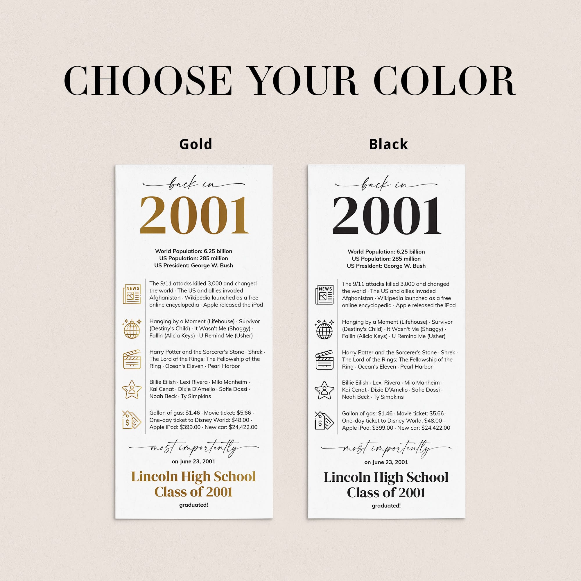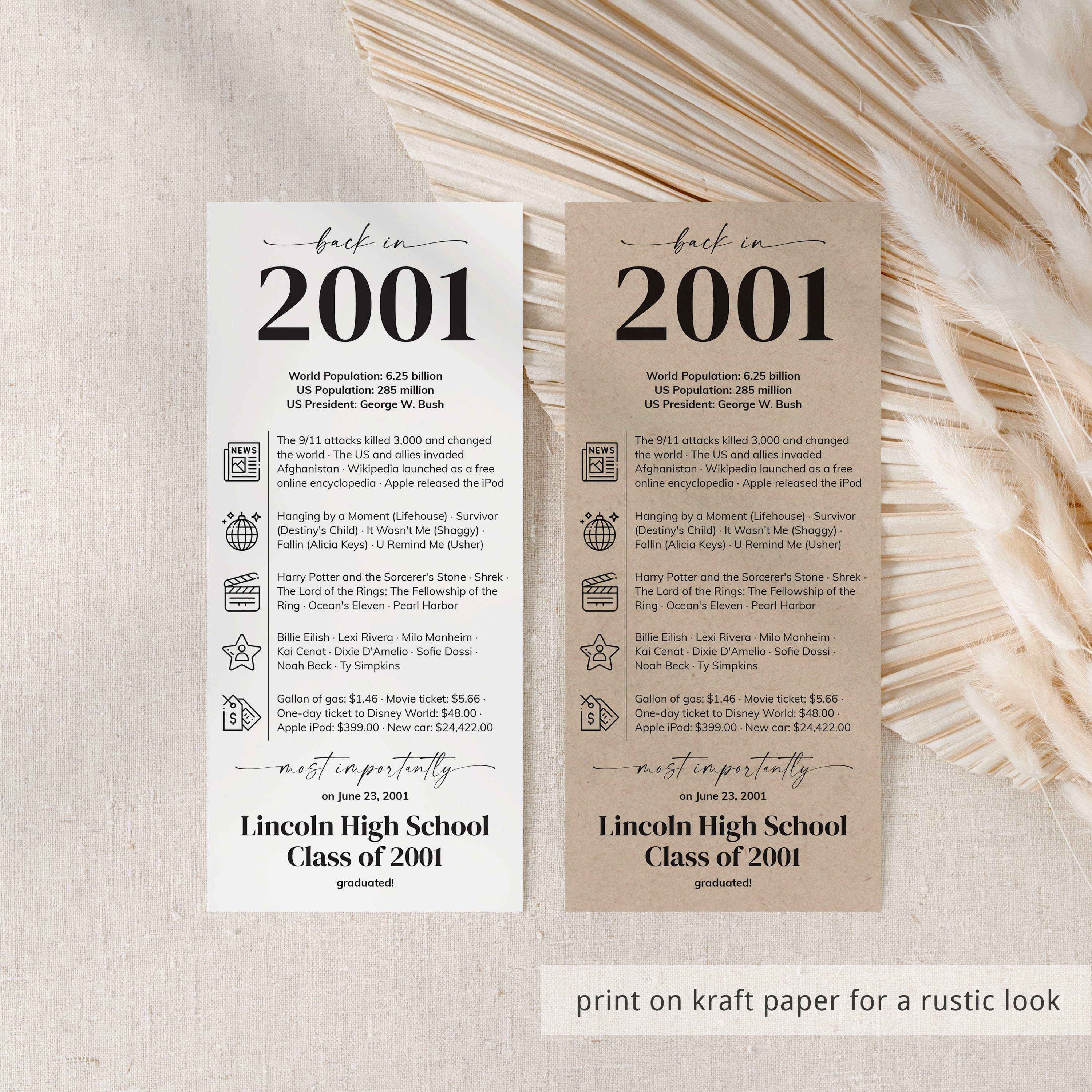 Looking for a stylish and personalized addition to your 25th Class of 2001 Reunion? Our “Back in 2001” table card is the perfect way to celebrate your milestone! This sleek and minimalist card, customized with your school’s name and graduation date, combines entertaining facts from 2001 with clean icons for a fresh, contemporary look.