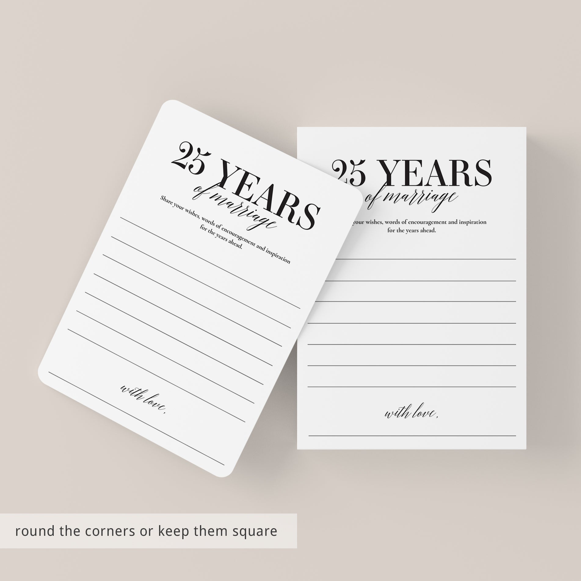 Create an amazing keepsake for the 25th anniversary couple with these modern, yet sophisticated, Wishes and Advice cards. Let every guest write down their wishes, words or encouragement and inspiration for the years ahead. It's the perfect addition to a 25th wedding anniversary party.
