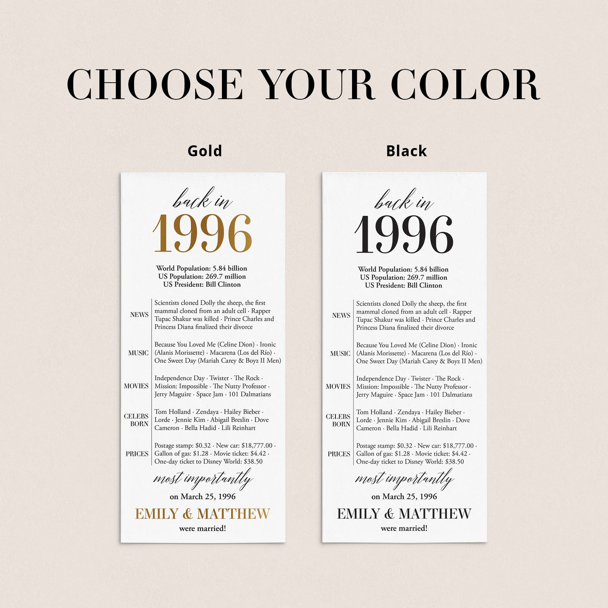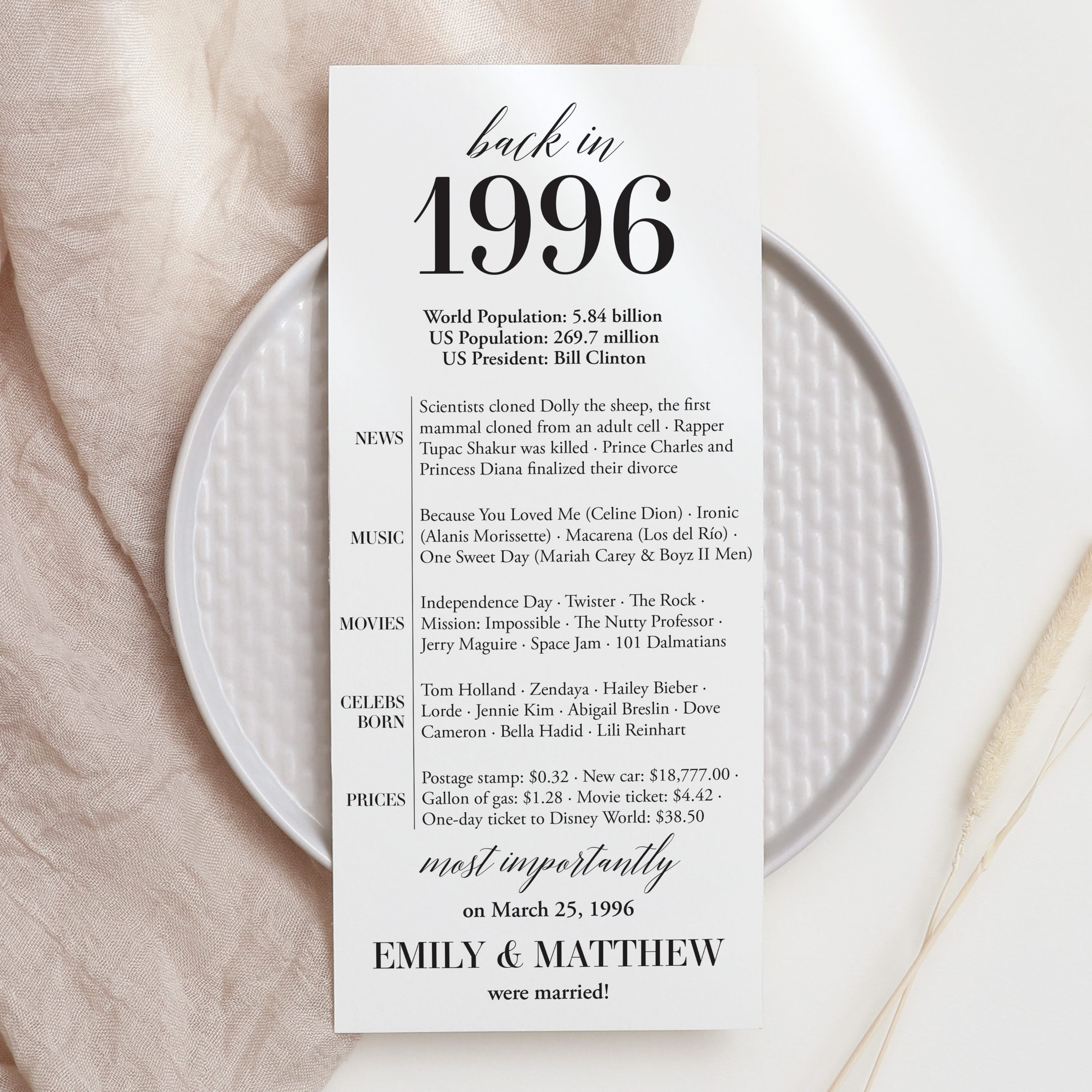 Celebrate 30 years of love and commitment with our simple yet elegant “Back in 1996” anniversary table card! This personalized card highlights memorable facts from the year 1996, making it the perfect keepsake or addition to an anniversary party for a couple celebrating their 30th anniversary in 2026.