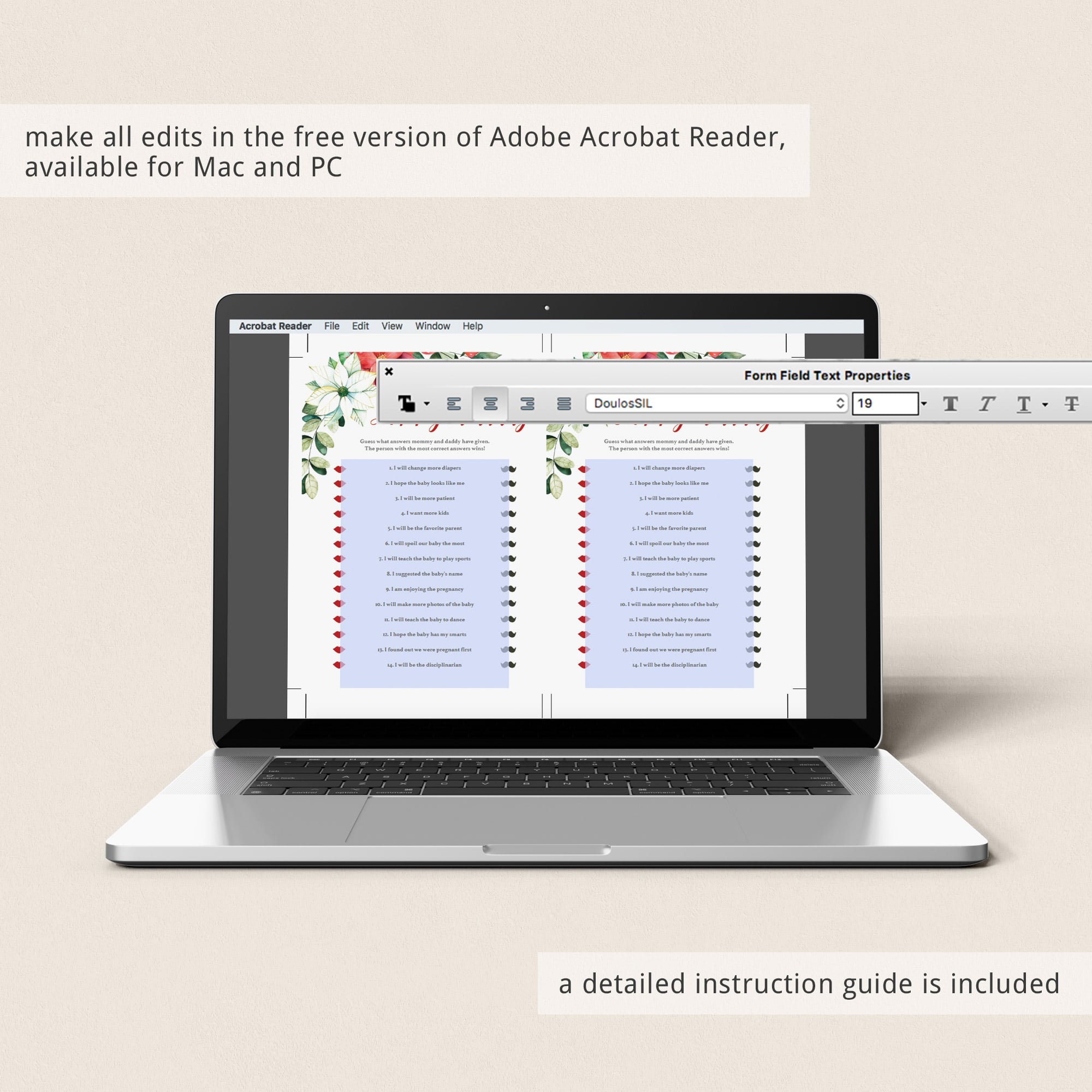 The game Mommy or Daddy is editable in the free version of Adobe Acrobat Reader, so that you can personalize the game (please check the photos to see what parts can be edited).