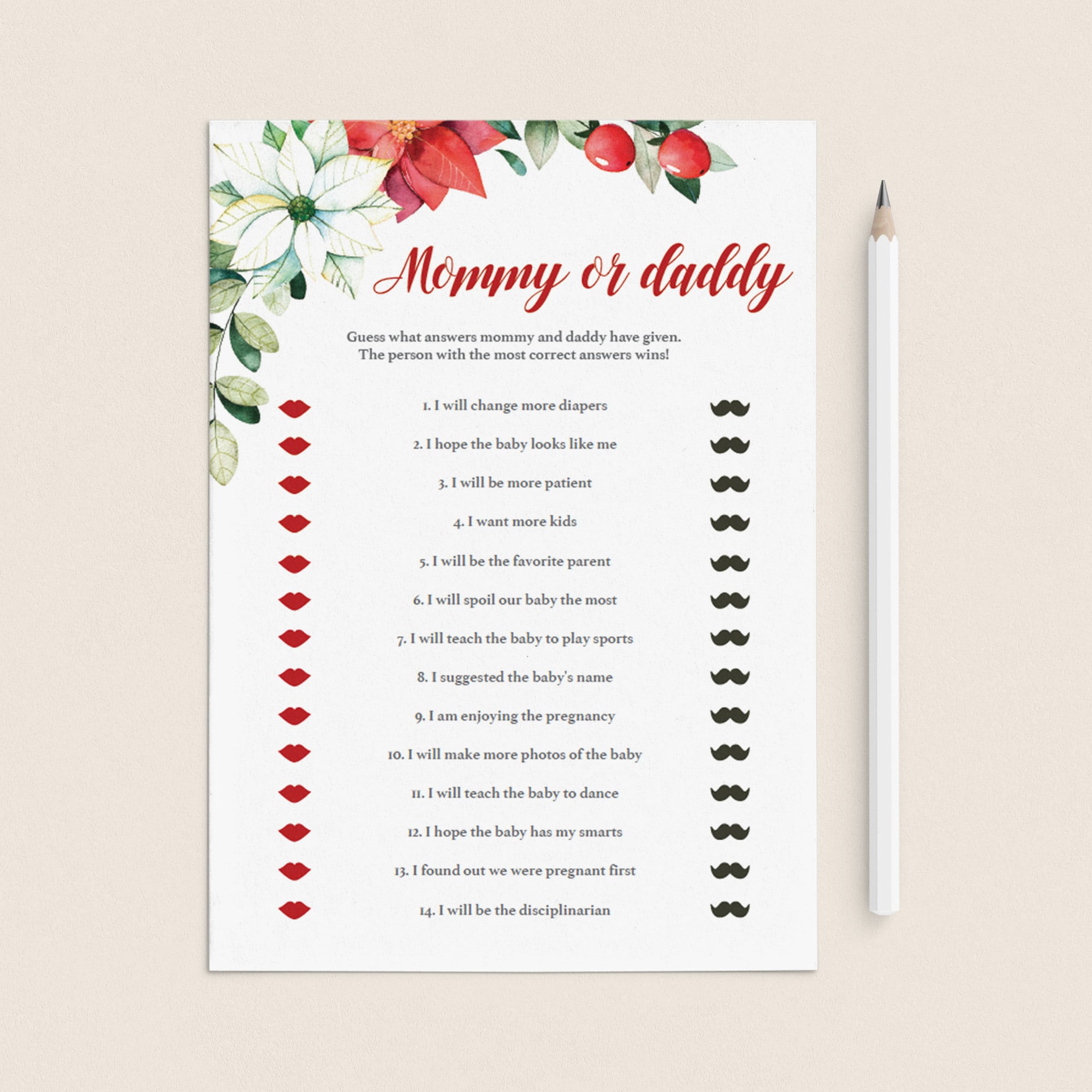 Entertain your baby shower guests with this bundle of 4 holiday baby shower games. The red and white flowers and green leaves will ensure that you have those special holiday vibes at your party. The bundle includes everything you need to entertain large groups of guests with a variety of fun and interactive games.