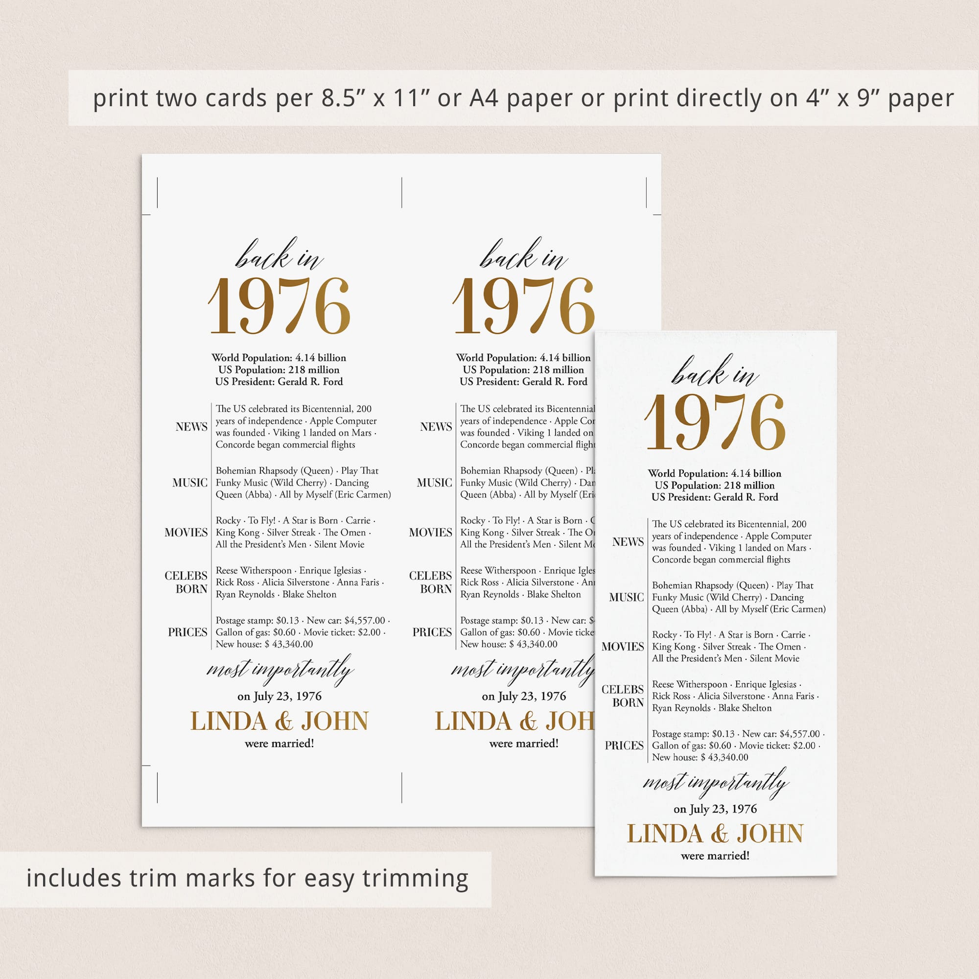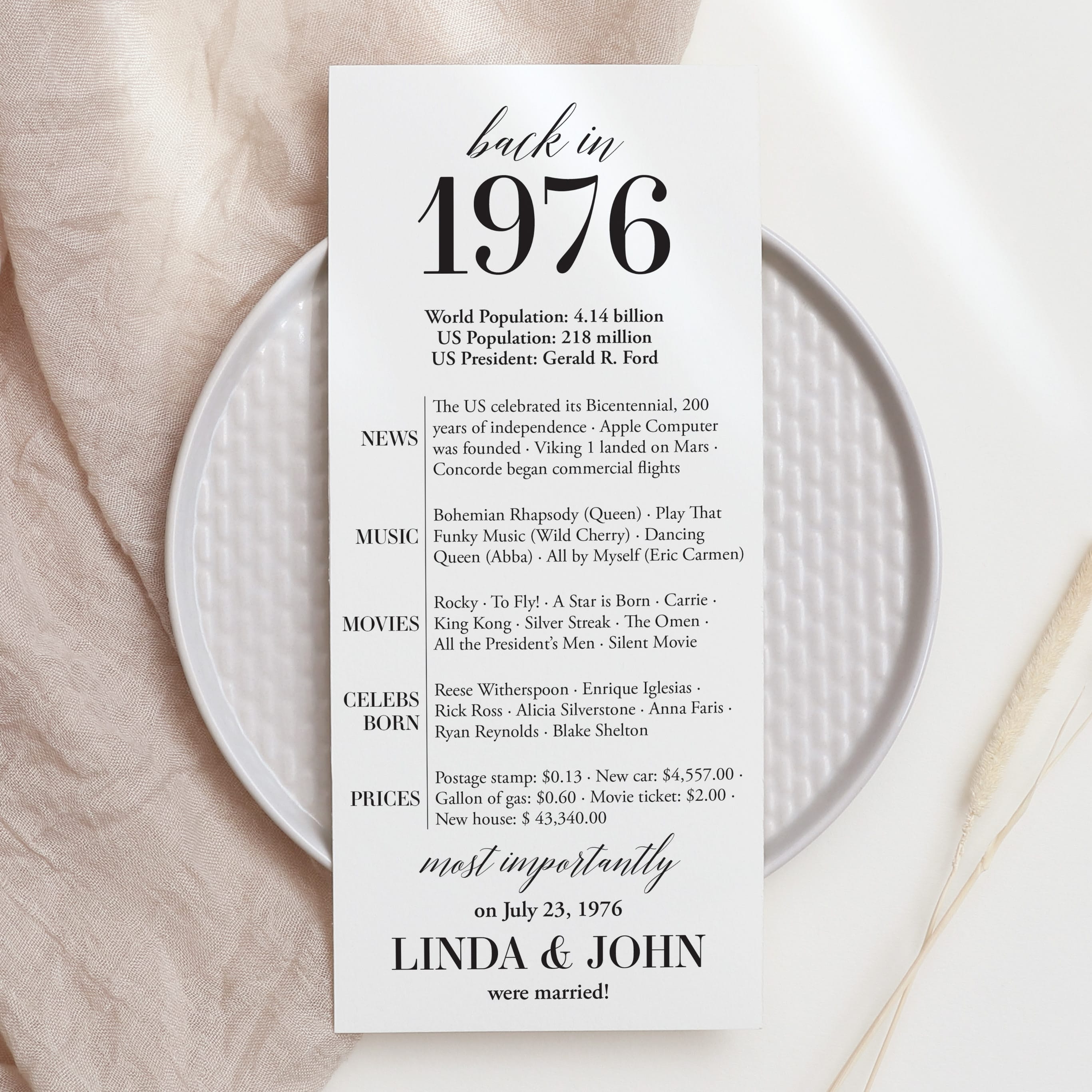 Celebrate 50 years of love and commitment with our simple yet elegant “Back in 1976” anniversary table card! This personalized card highlights memorable facts from the year 1976, making it the perfect keepsake or addition to an anniversary party for a couple celebrating their 50th anniversary in 2026.