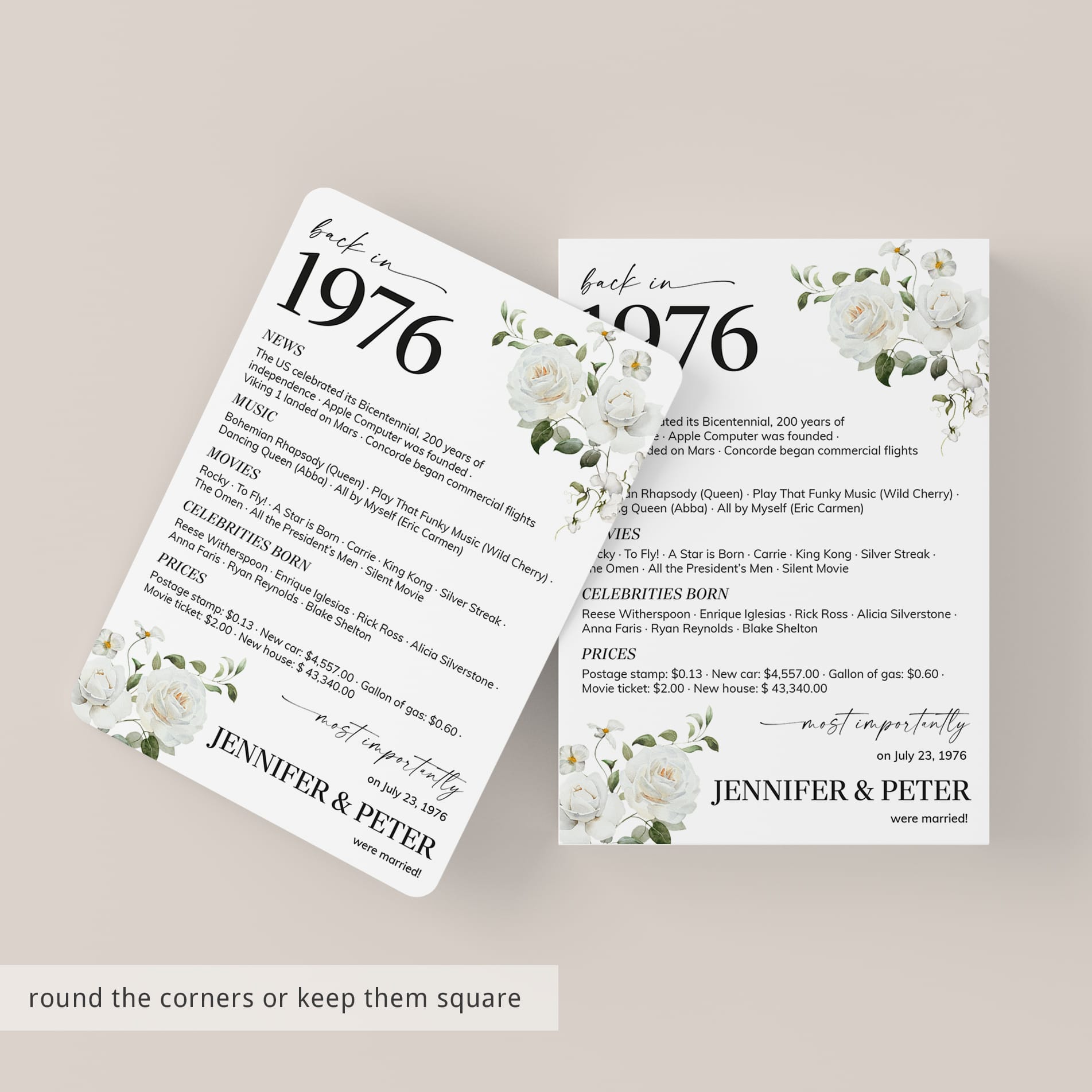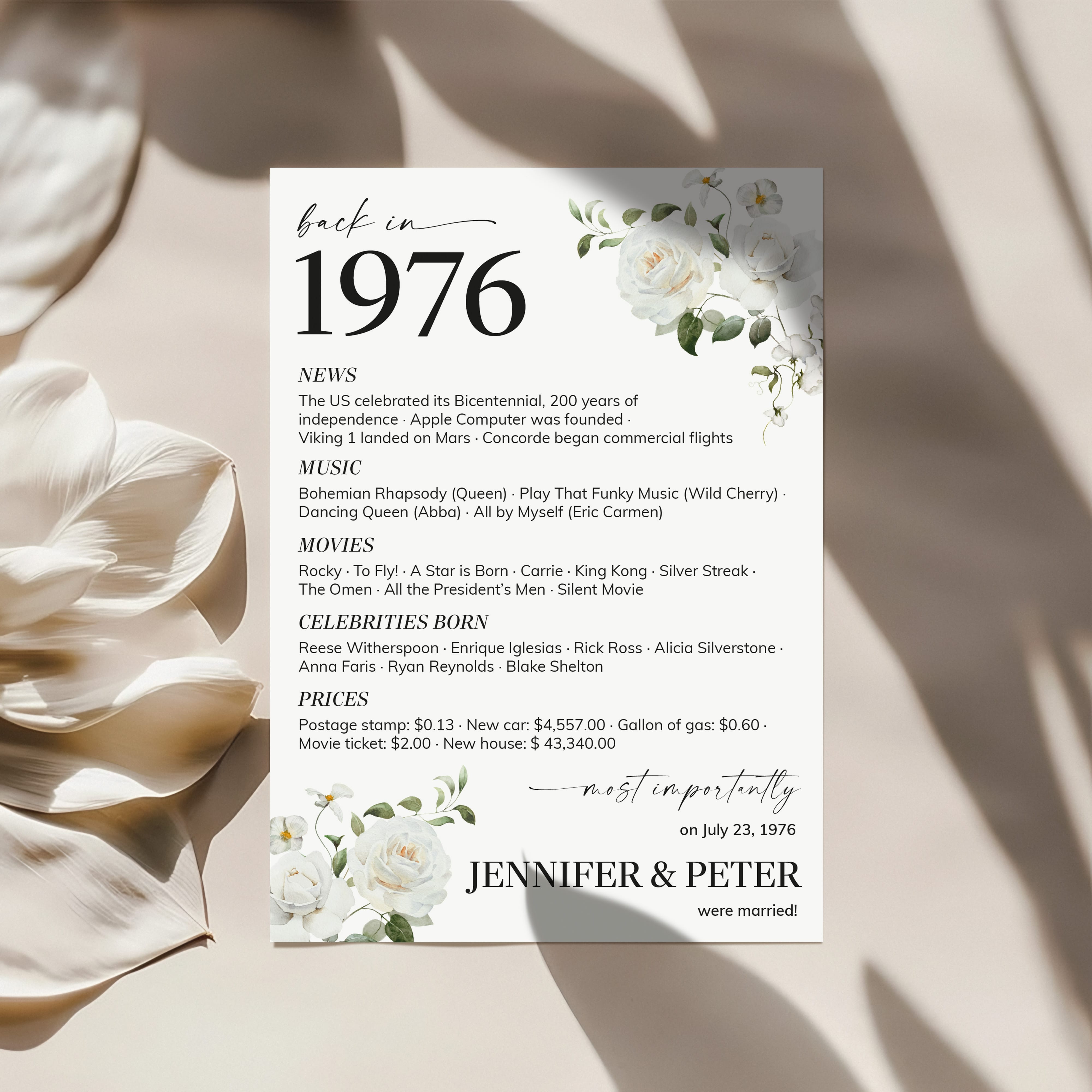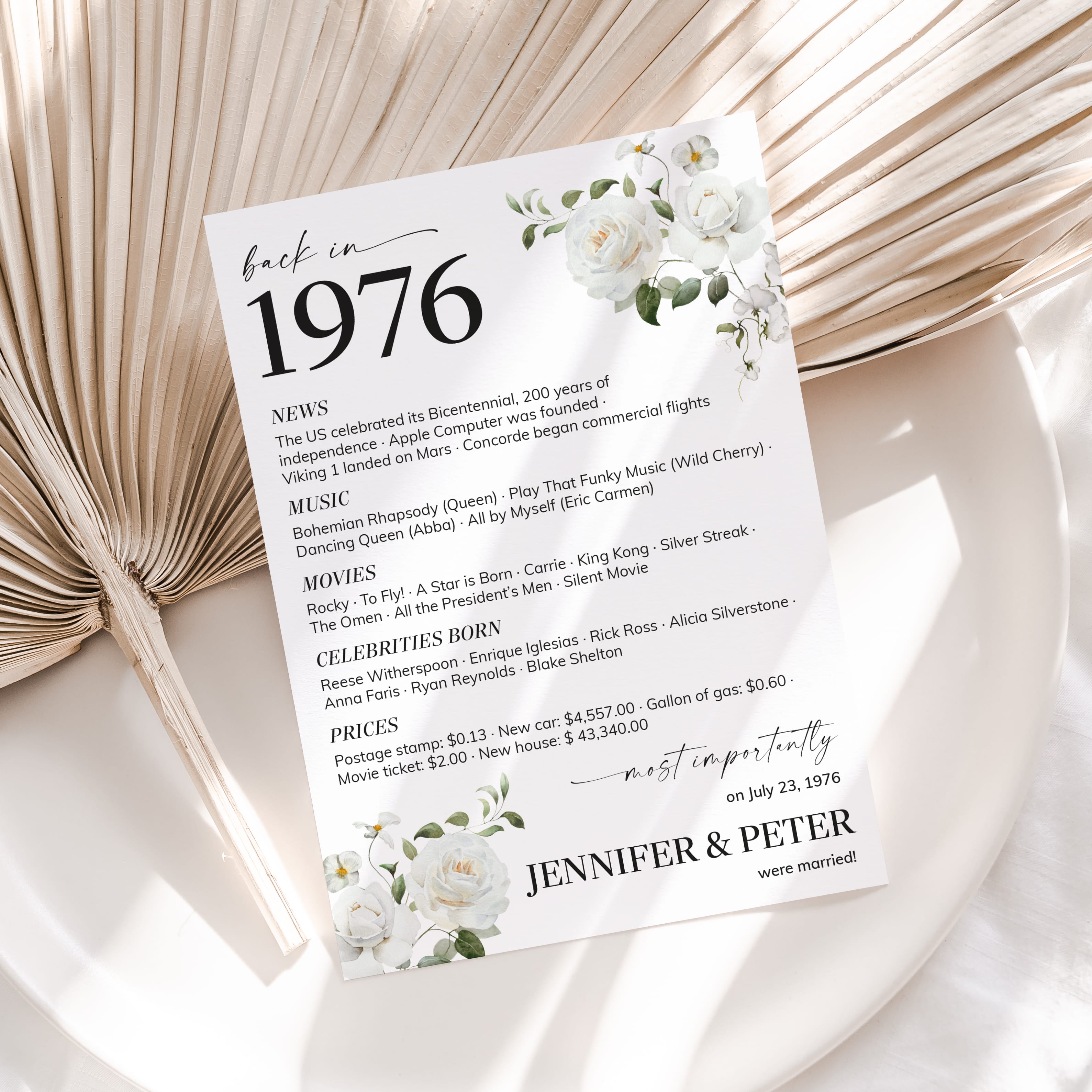 Celebrate 50 years of love with our elegant floral “Back in 1976” card. Adorned with a delicate white floral design, this modern and timeless card highlights memorable facts from the year 1976, making it a beautiful keepsake and the perfect addition to a 50th wedding anniversary party in 2026.
