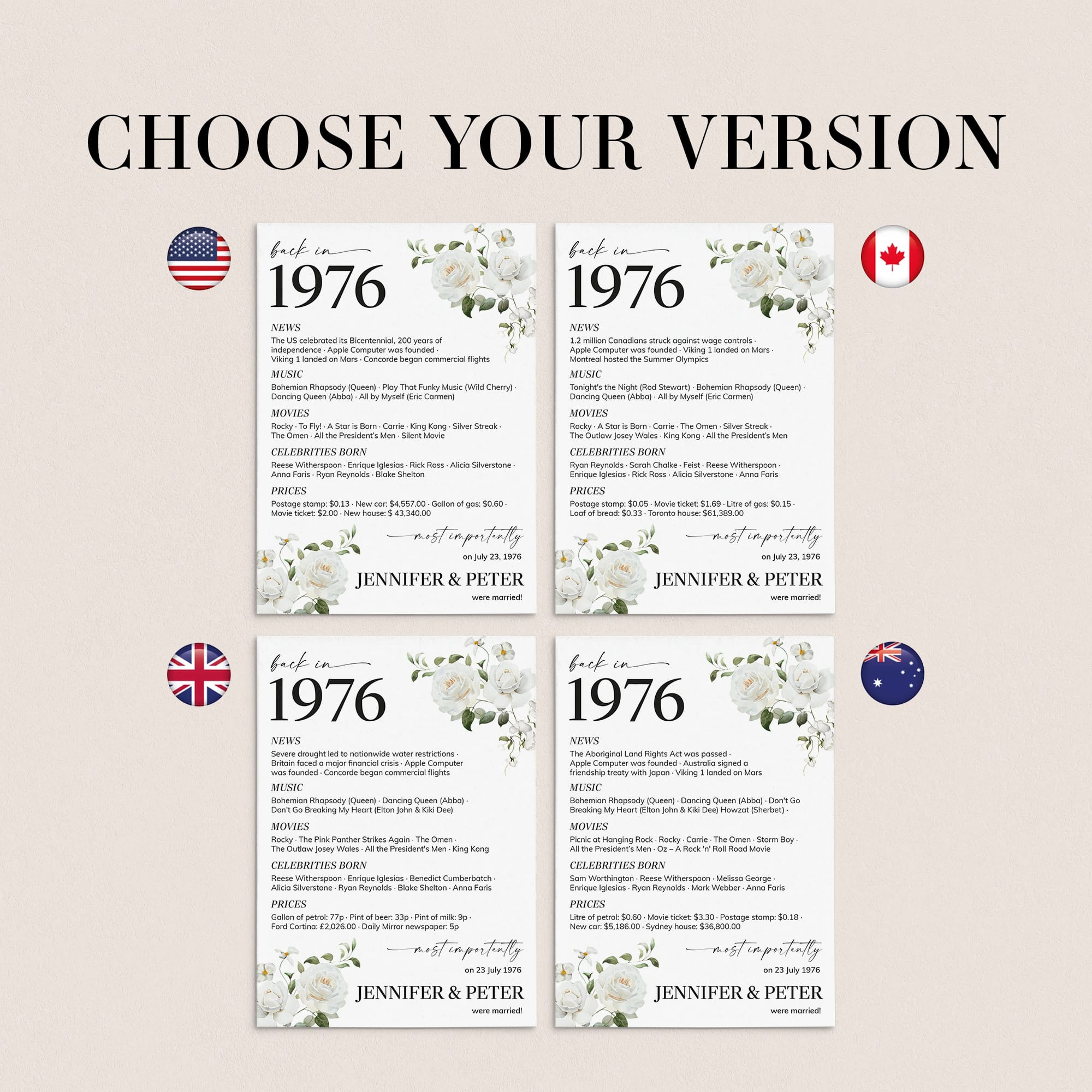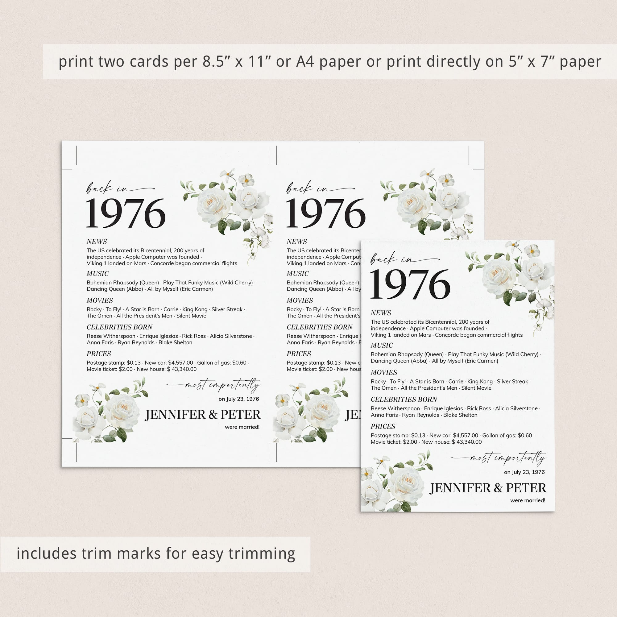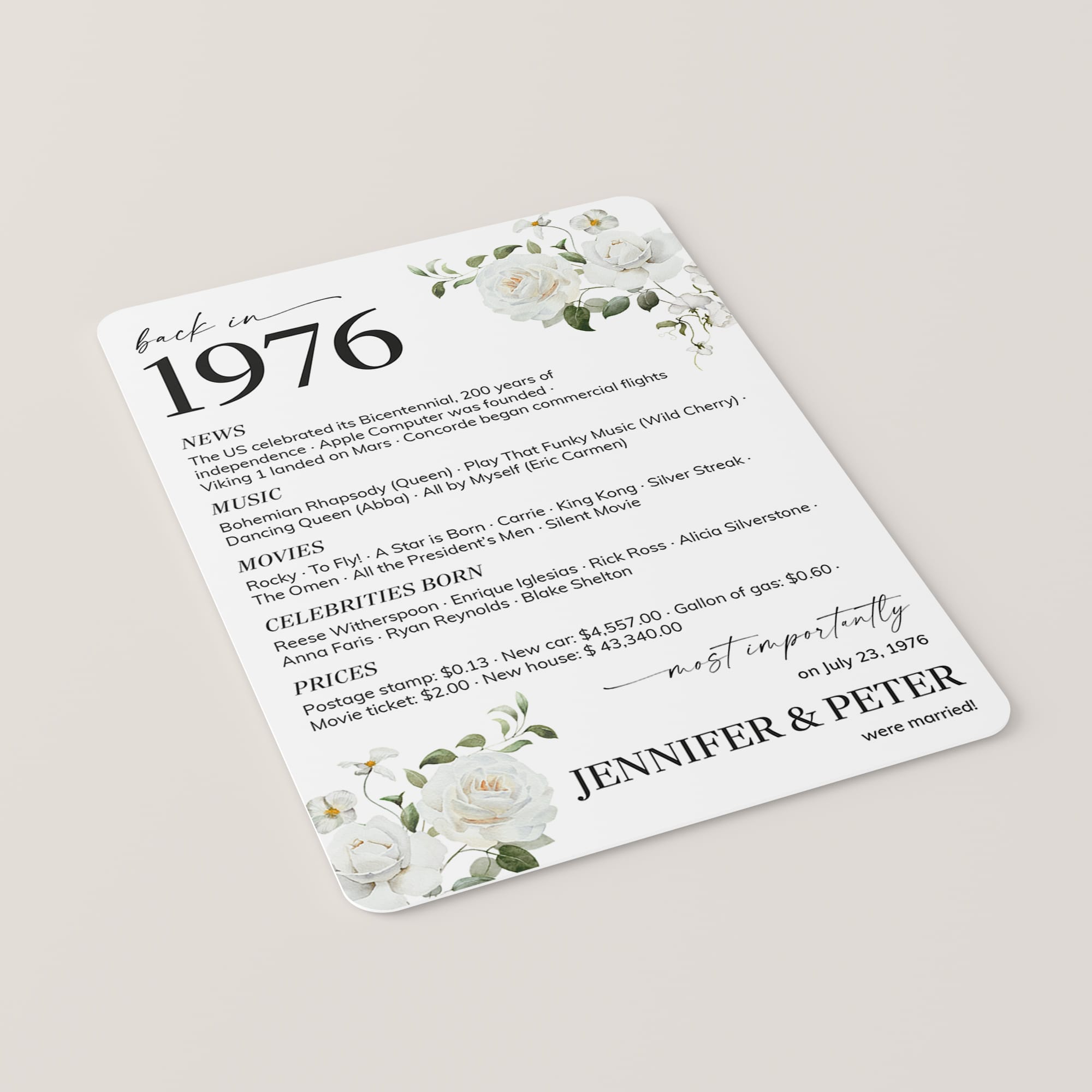 Celebrate 50 years of love with our elegant floral “Back in 1976” card. Adorned with a delicate white floral design, this modern and timeless card highlights memorable facts from the year 1976, making it a beautiful keepsake and the perfect addition to a 50th wedding anniversary party in 2026.