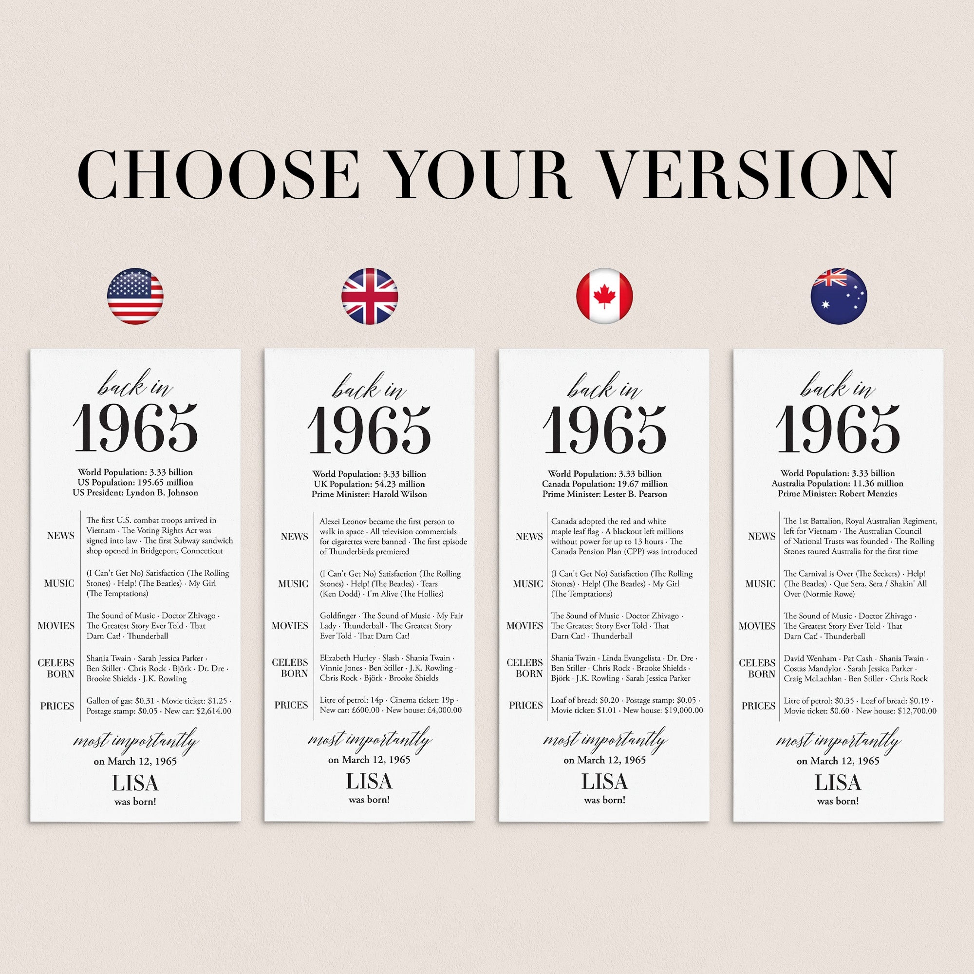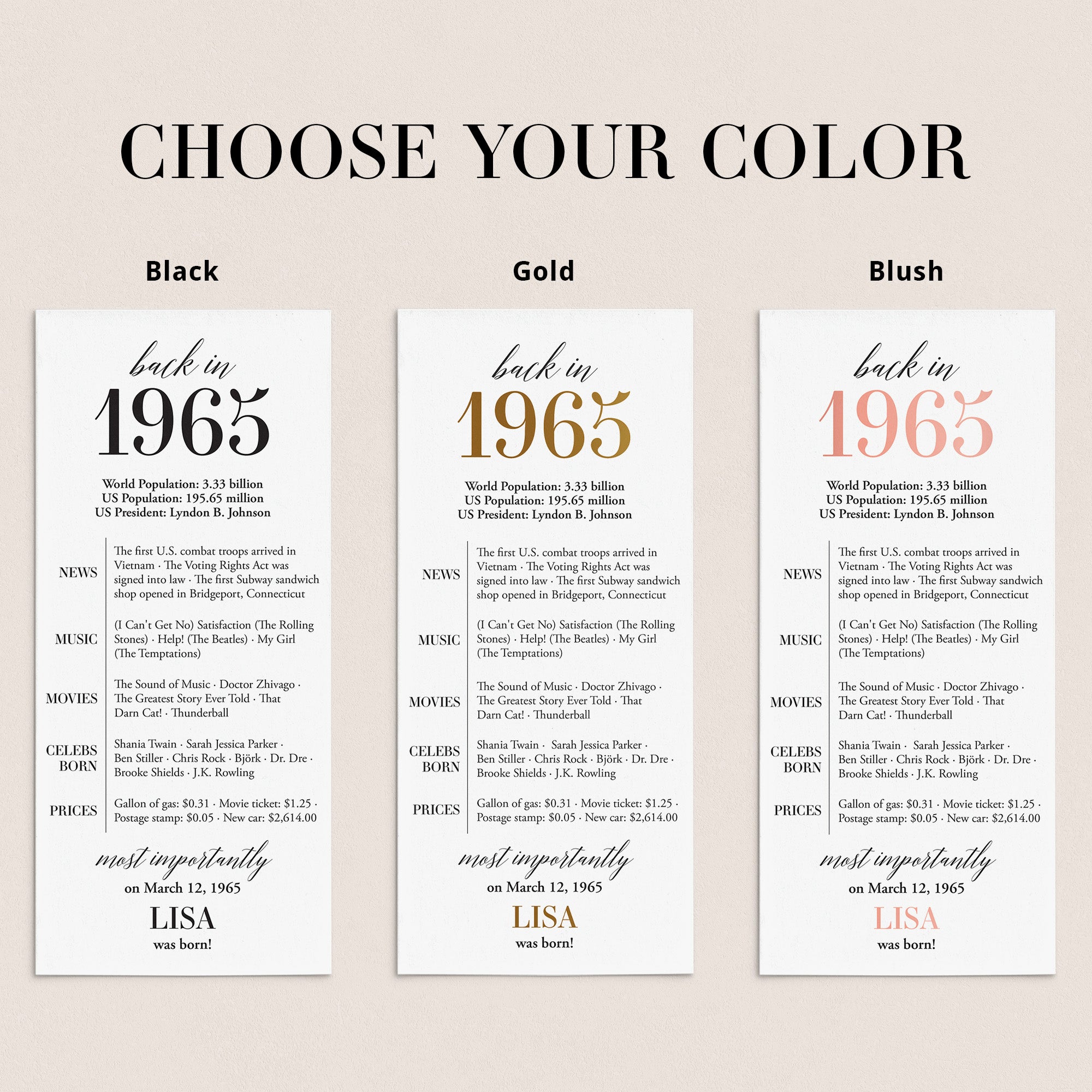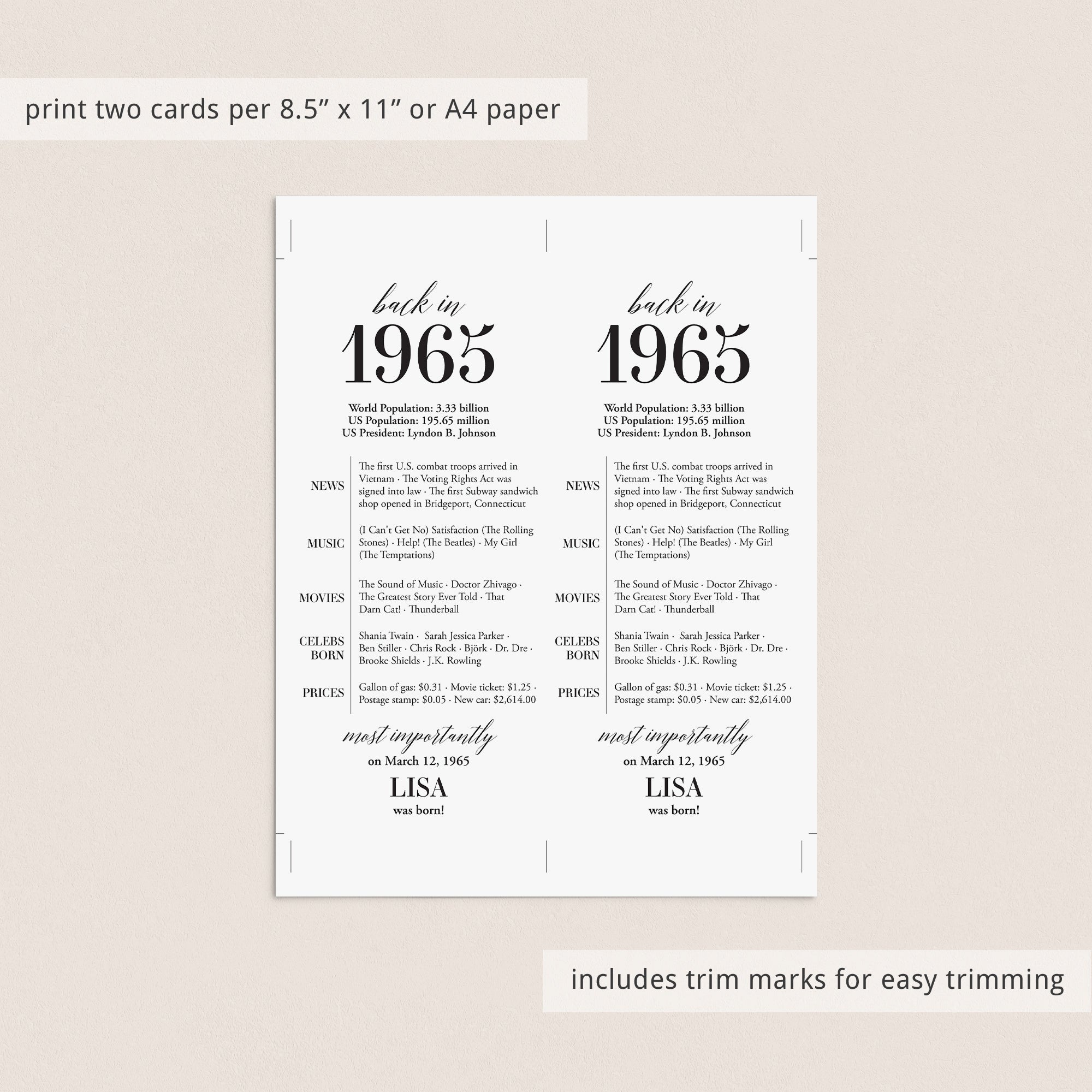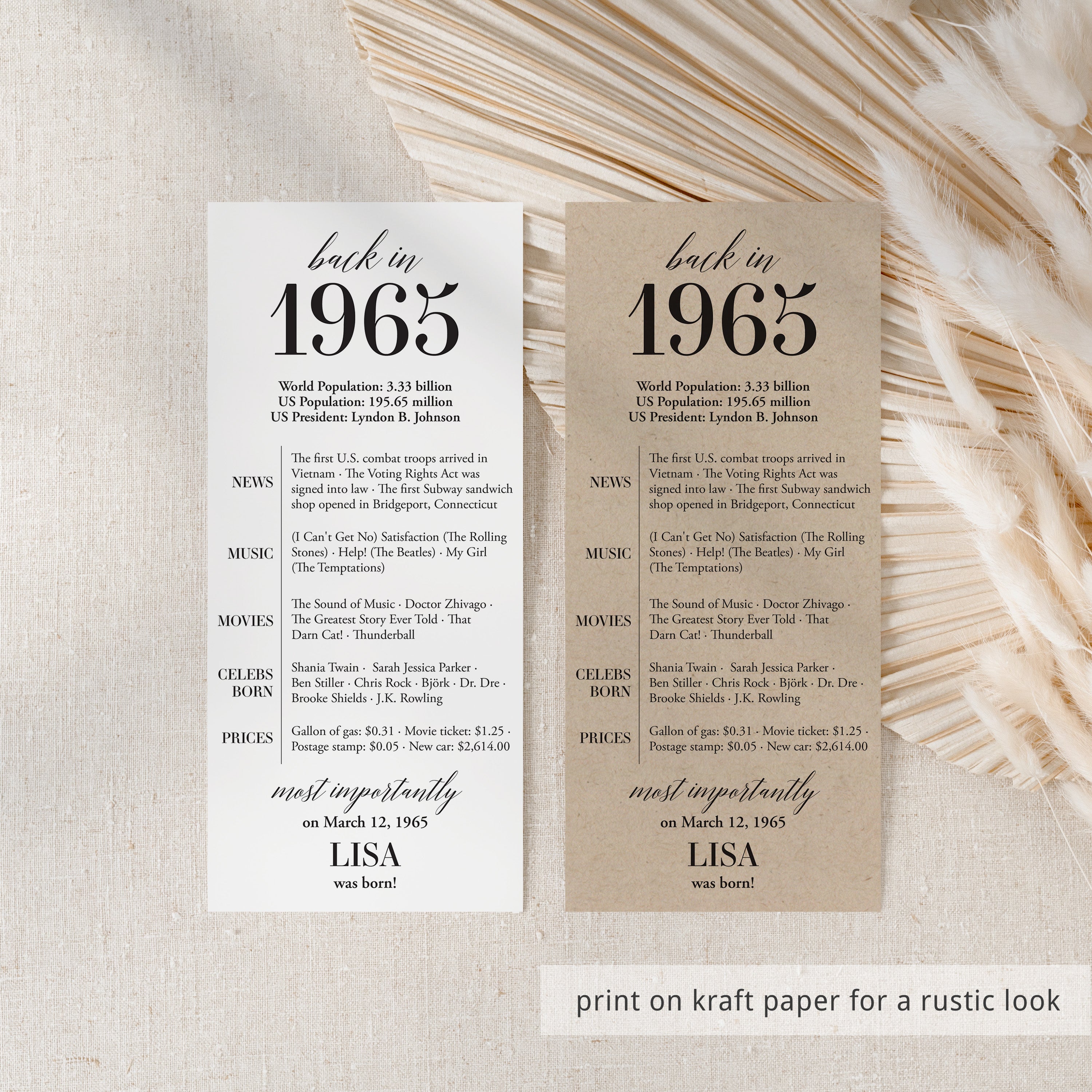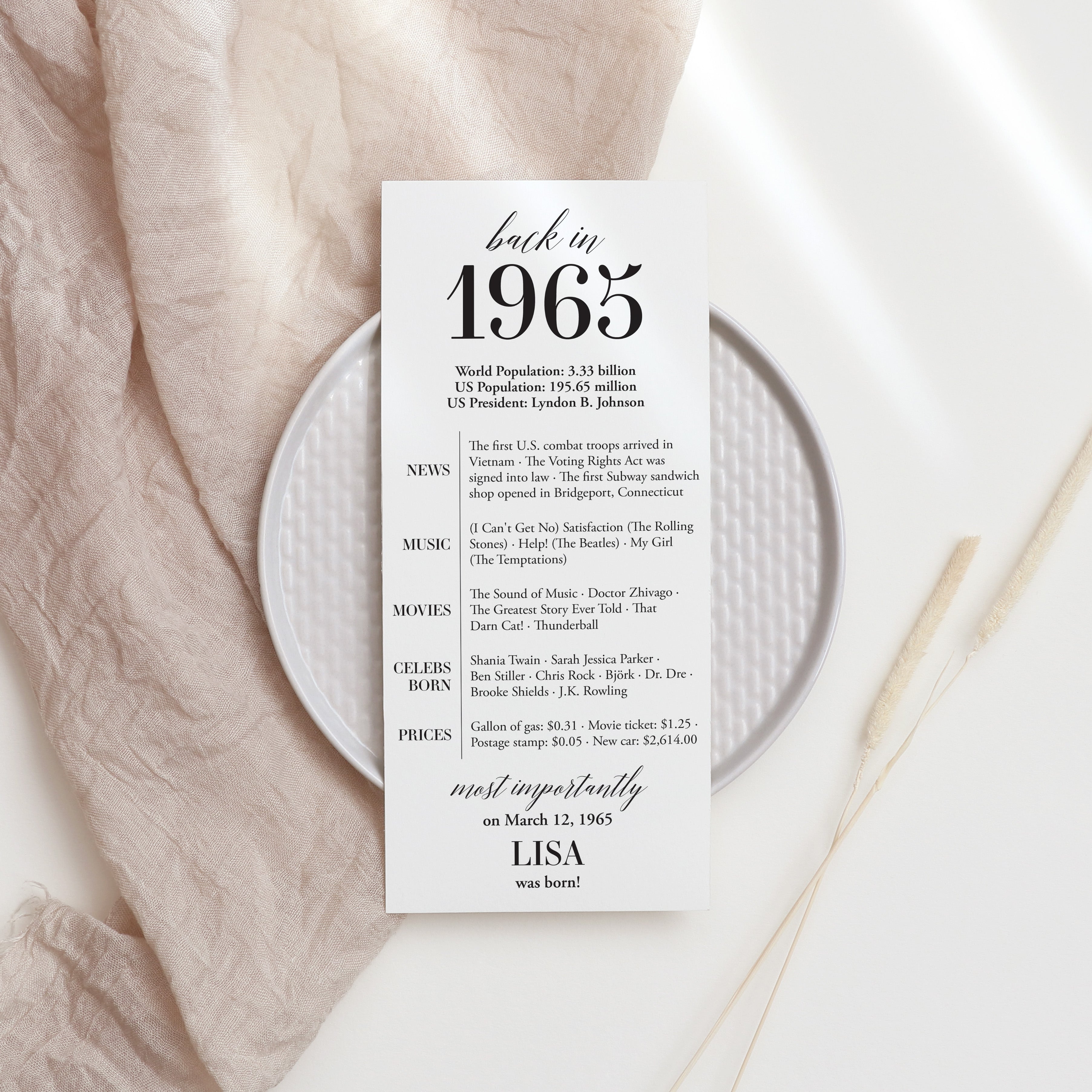 Are you looking for a simple yet elegant way to add a personal touch to a birthday celebration? Our “Back in 1965” table card is the perfect addition to any birthday party for someone turning 60 in 2025! This modern and minimalist card, personalized with the honoree’s name and birth date, showcases entertaining facts from 1965.