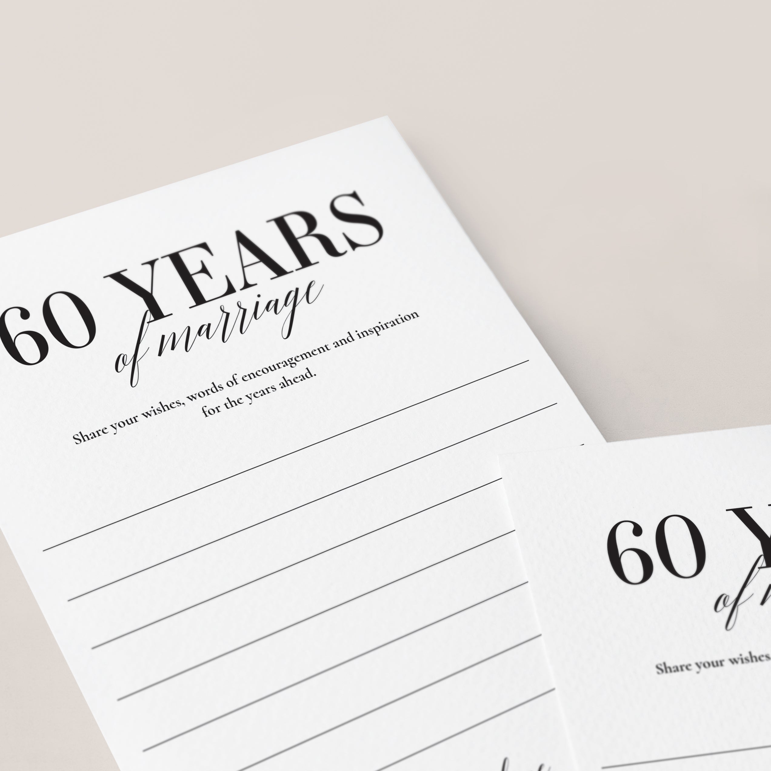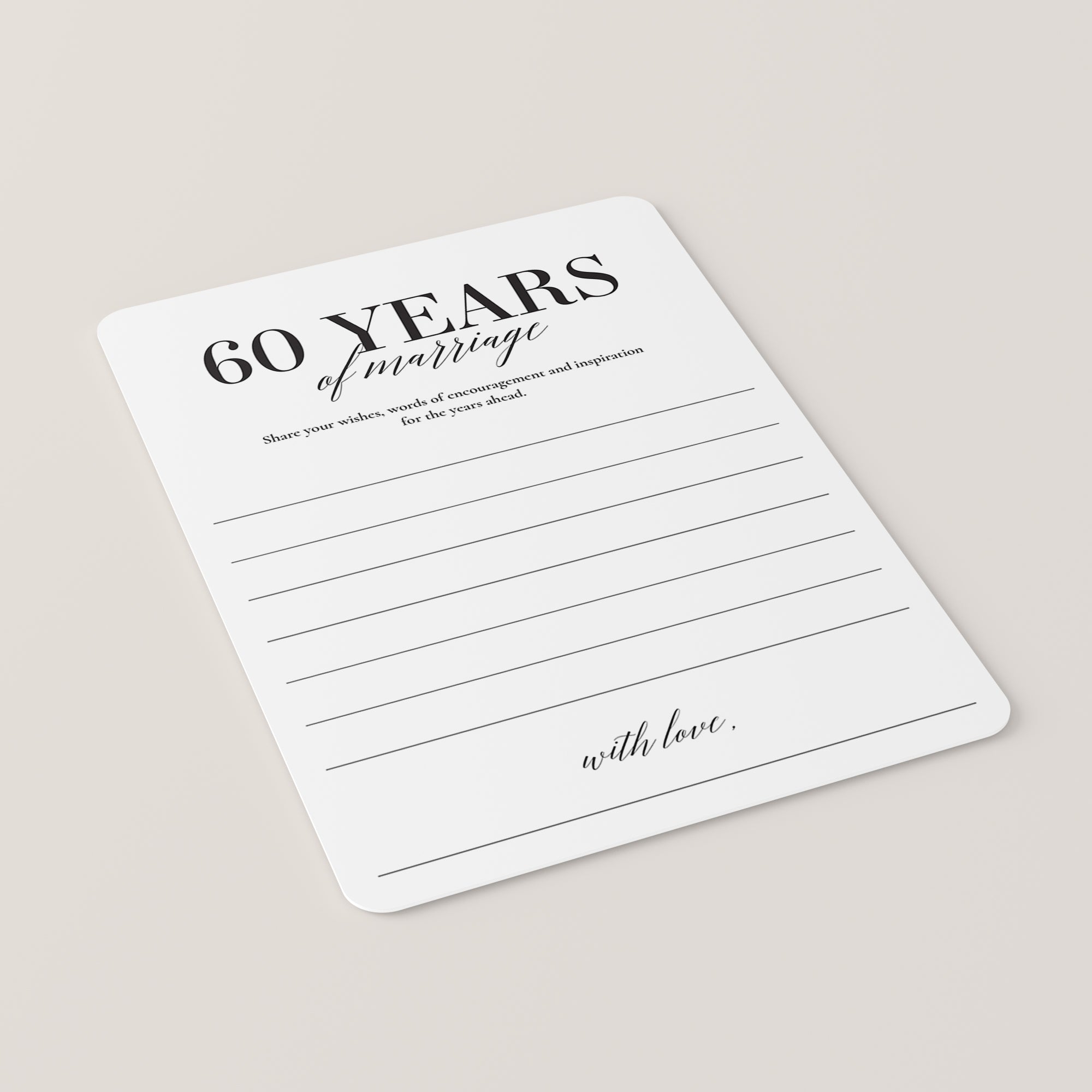 Create an amazing keepsake for the 60th anniversary couple with these modern, yet sophisticated, Wishes and Advice cards. Let every guest write down their wishes, words or encouragement and inspiration for the years ahead. It's the perfect addition to a diamond wedding anniversary party.