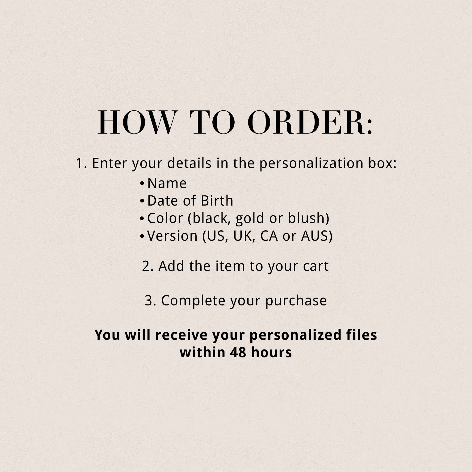 1. Add the name, date of birth, preferred color (black, gold, or blush) and version (US, UK, CA or AUS) in the personalization box