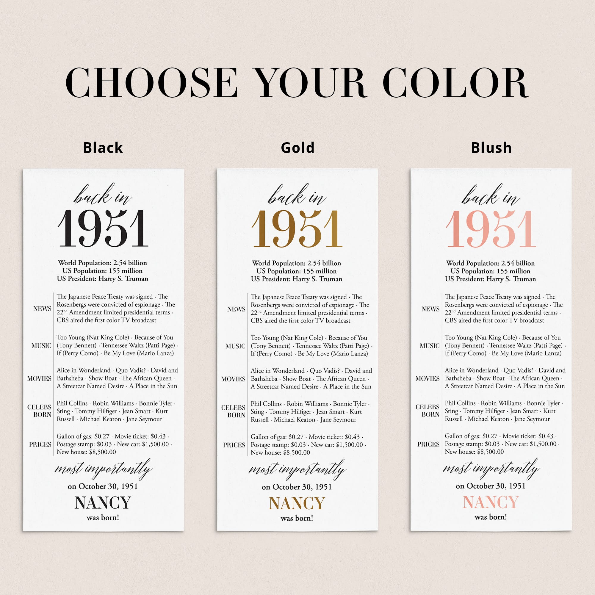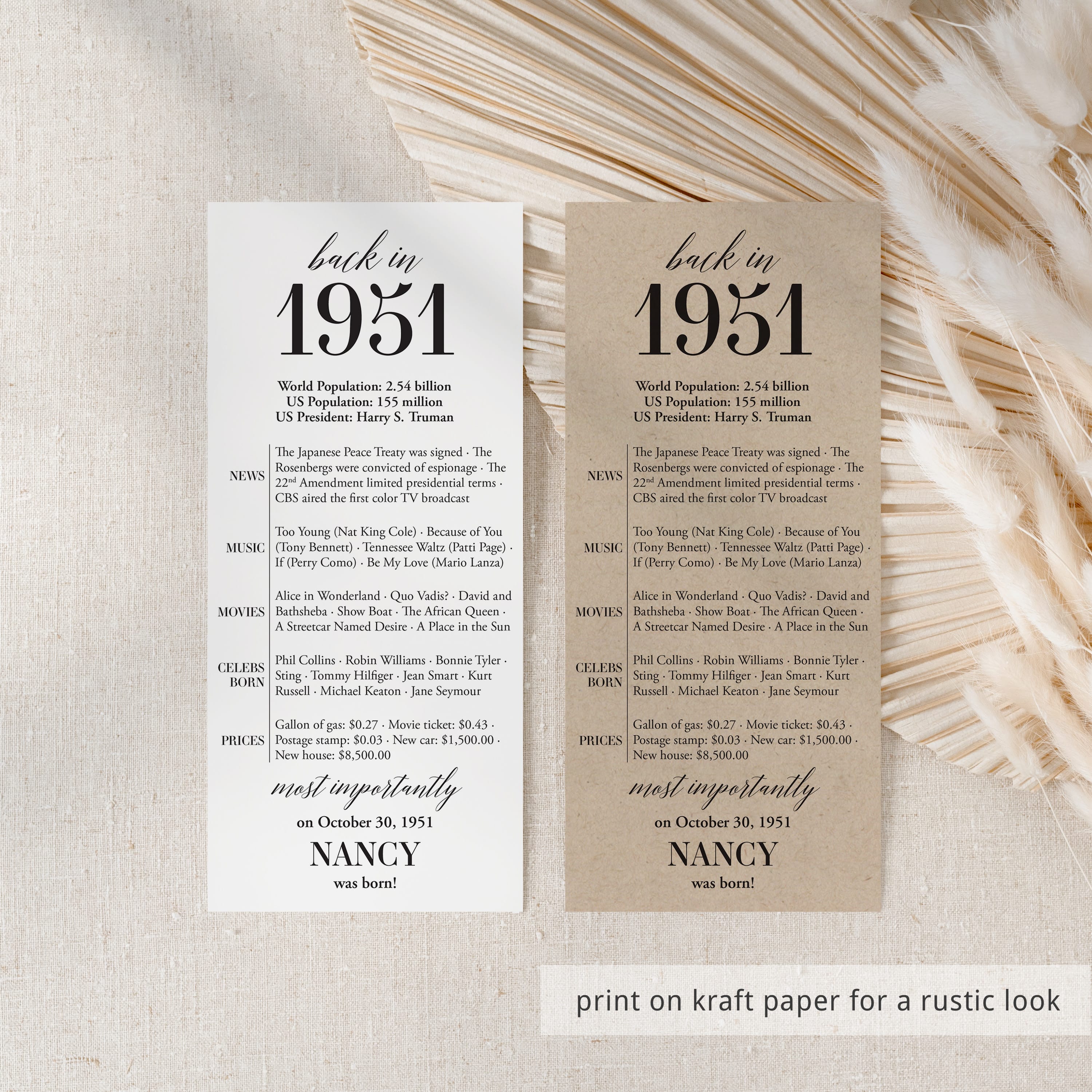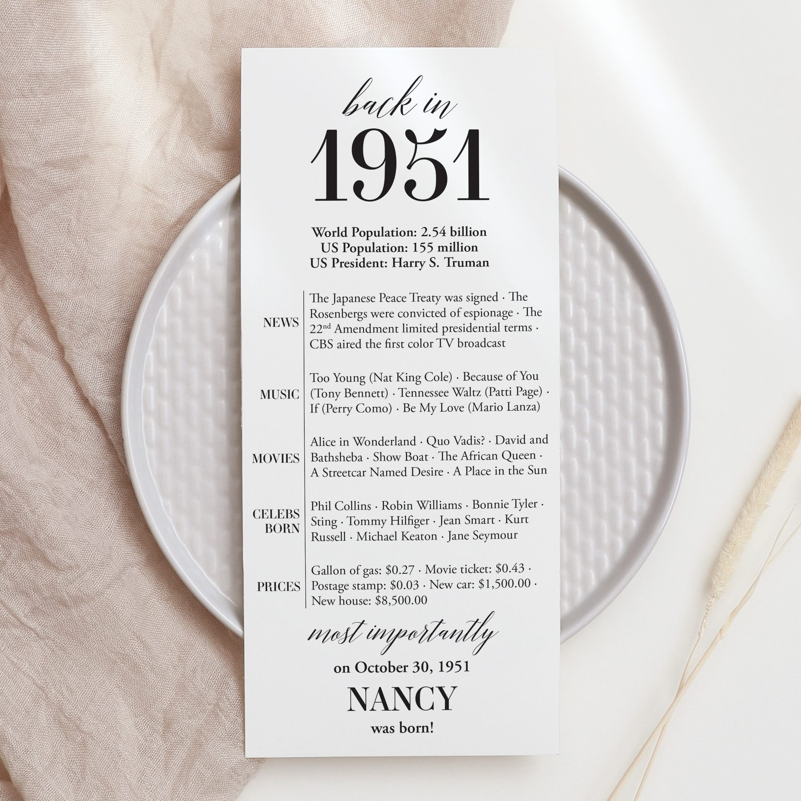 Are you looking for a simple yet elegant way to add a personal touch to a birthday celebration? Our “Back in 1951” table card is the perfect addition to any birthday party for someone turning 75 in 2026! This modern and minimalist card, personalized with the honoree’s name and birth date, showcases entertaining facts from 1951.
