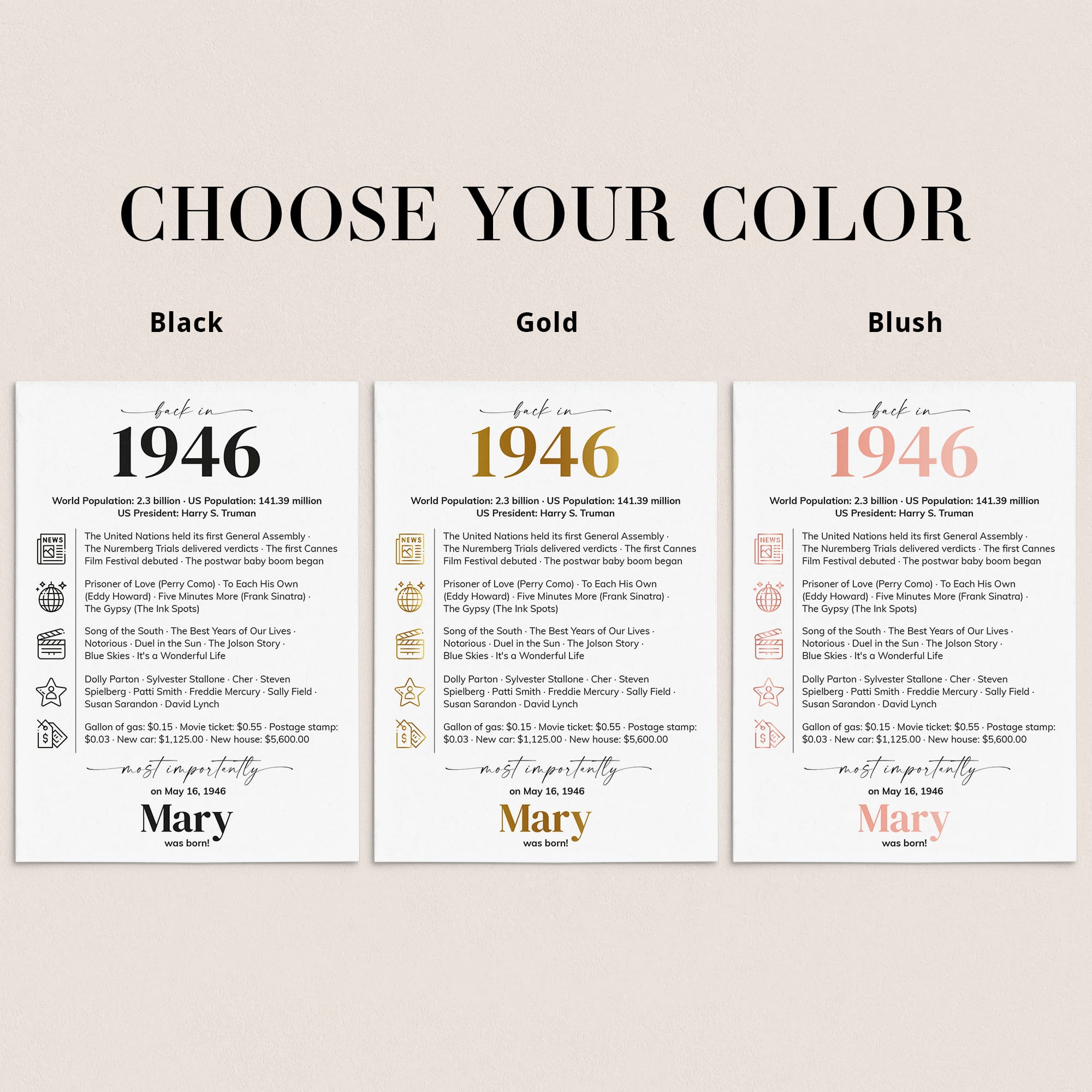 Looking for a stylish way to add a personal touch to a 80th birthday party? Our “Back in 1946” table card is a sleek and modern addition to any 80th birthday celebration in 2026. Personalized with the honoree’s name and birth date, this design combines entertaining facts from 1946 with clean icons for a fresh, contemporary look.