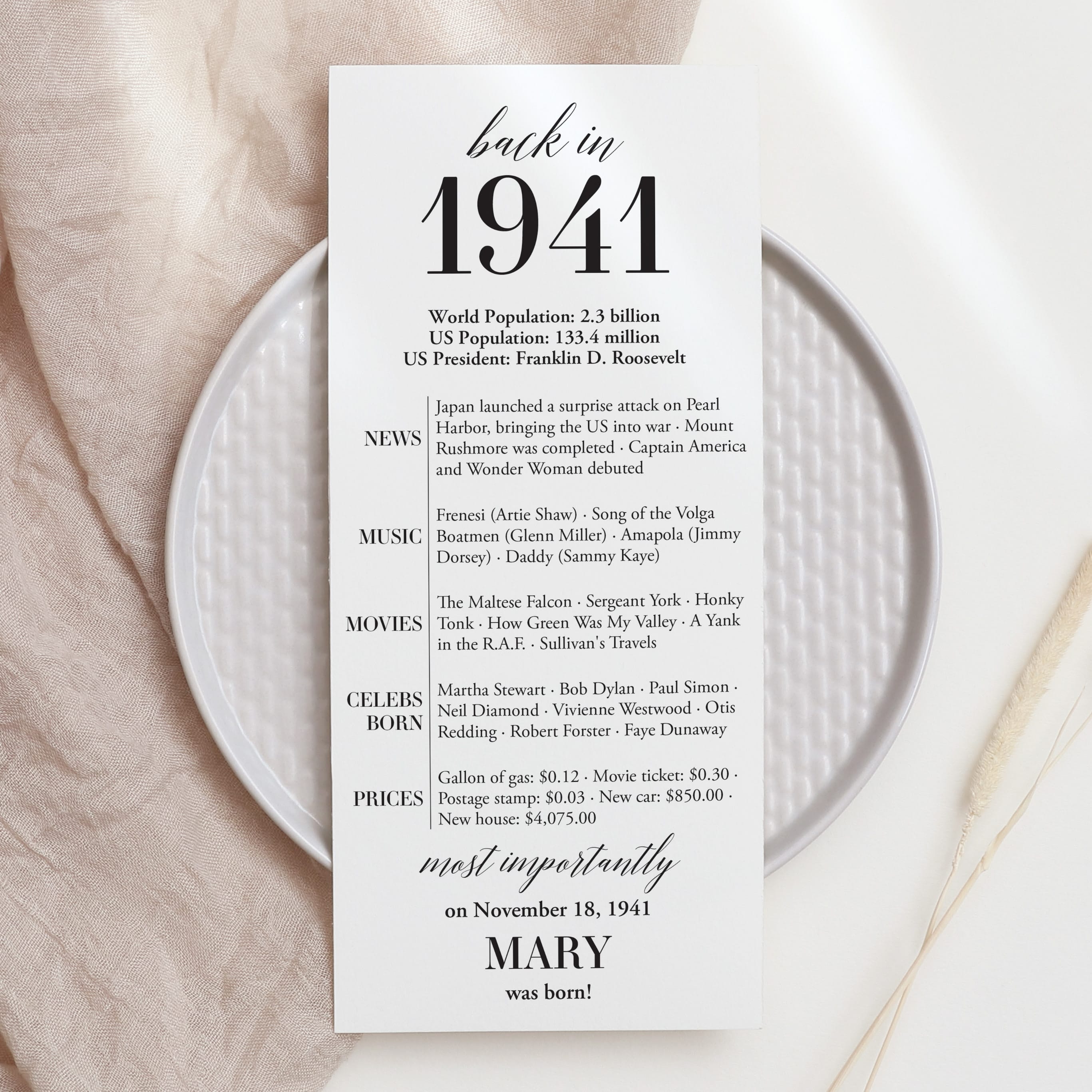 Are you looking for a simple yet elegant way to add a personal touch to a birthday celebration? Our “Back in 1941” table card is the perfect addition to any birthday party for someone turning 85 in 2026! This modern and minimalist card, personalized with the honoree’s name and birth date, showcases entertaining facts from 1941.