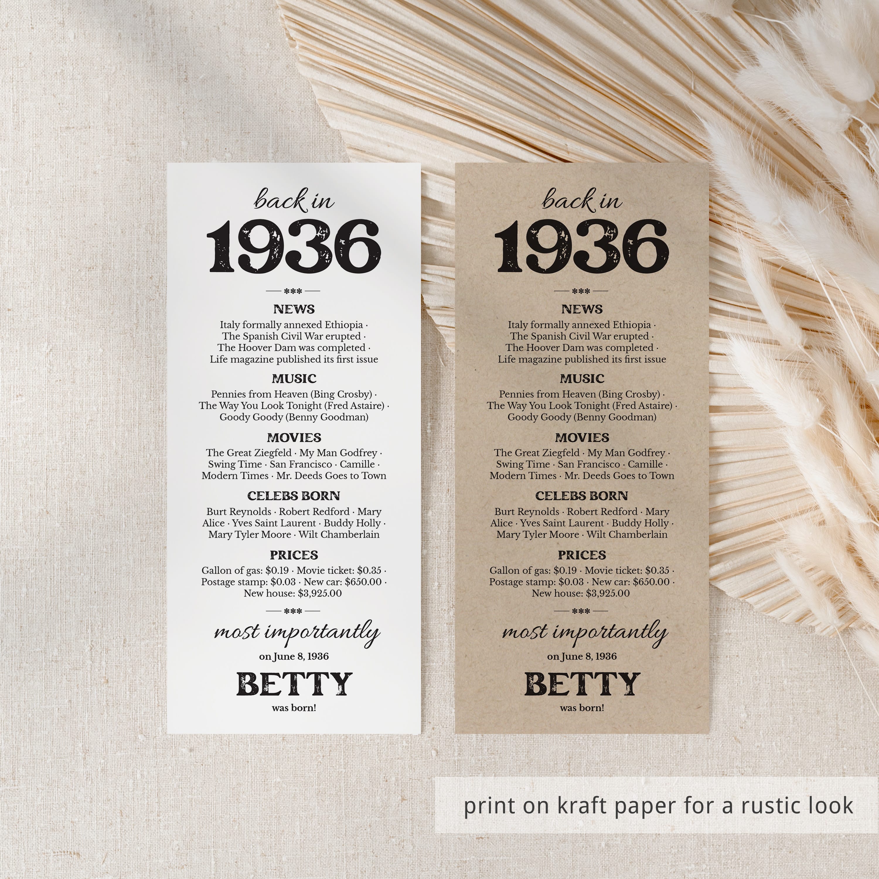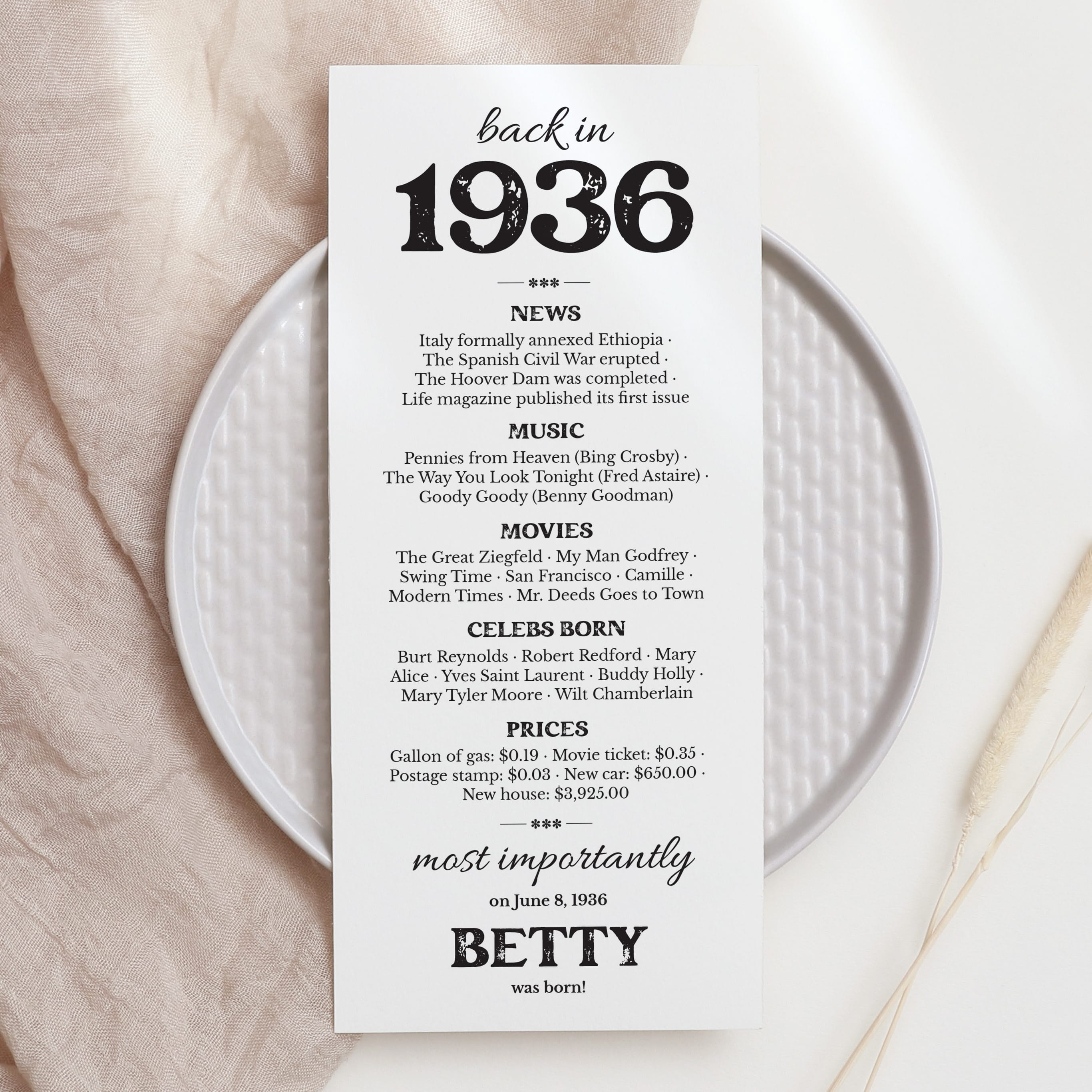 Looking for a nostalgic way to add a personal touch to a 90th birthday? This “Back in 1936” table card brings a charming vintage vibe to any 90th birthday celebration in 2026! The retro-inspired card, personalized with the honoree’s name and birth date, highlights fun and memorable facts from 1936.