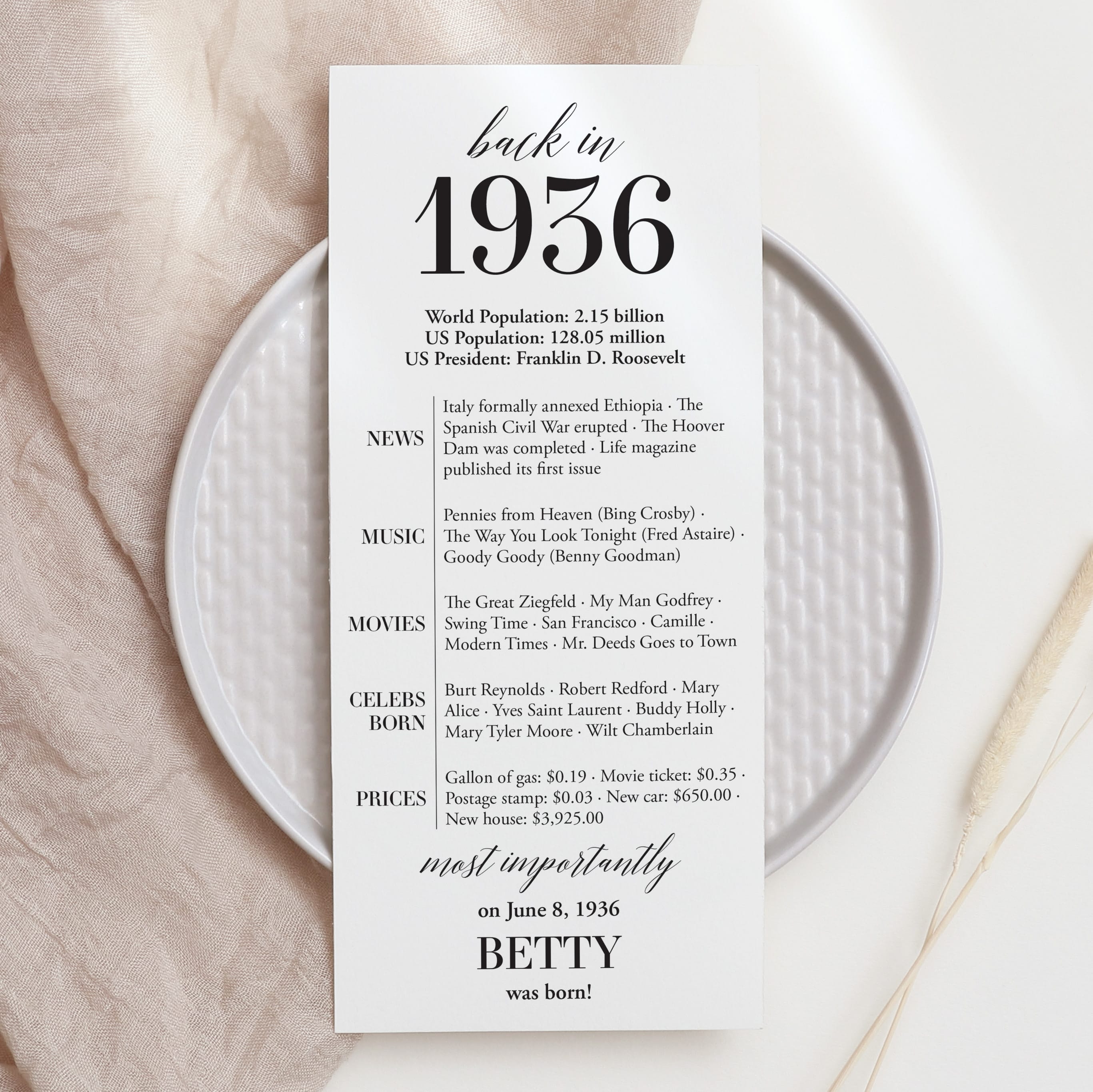 Are you looking for a simple yet elegant way to add a personal touch to a birthday celebration? Our “Back in 1936” table card is the perfect addition to any birthday party for someone turning 90 in 2026! This modern and minimalist card, personalized with the honoree’s name and birth date, showcases entertaining facts from 1936.