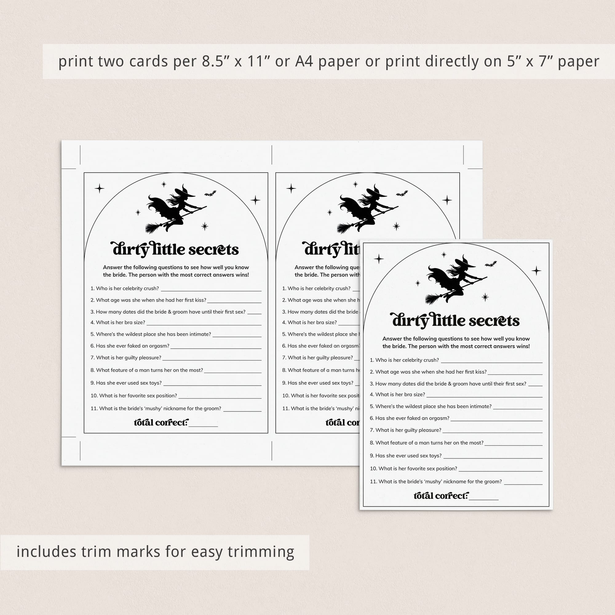 How well do you really know the bride? Test your witches on who knows the bride best with this "A Witch is Getting Hitched" theme Dirty Little Secrets game with witch silhouette. The questions reveal a saucier side to the bride you might not recognize! It is a hilarious addition to your Let's Go Witched Bachelorette Party, Halloween Hen Party or Wicked Bride Bridal Shower. You'll have your girls laughing in no time.