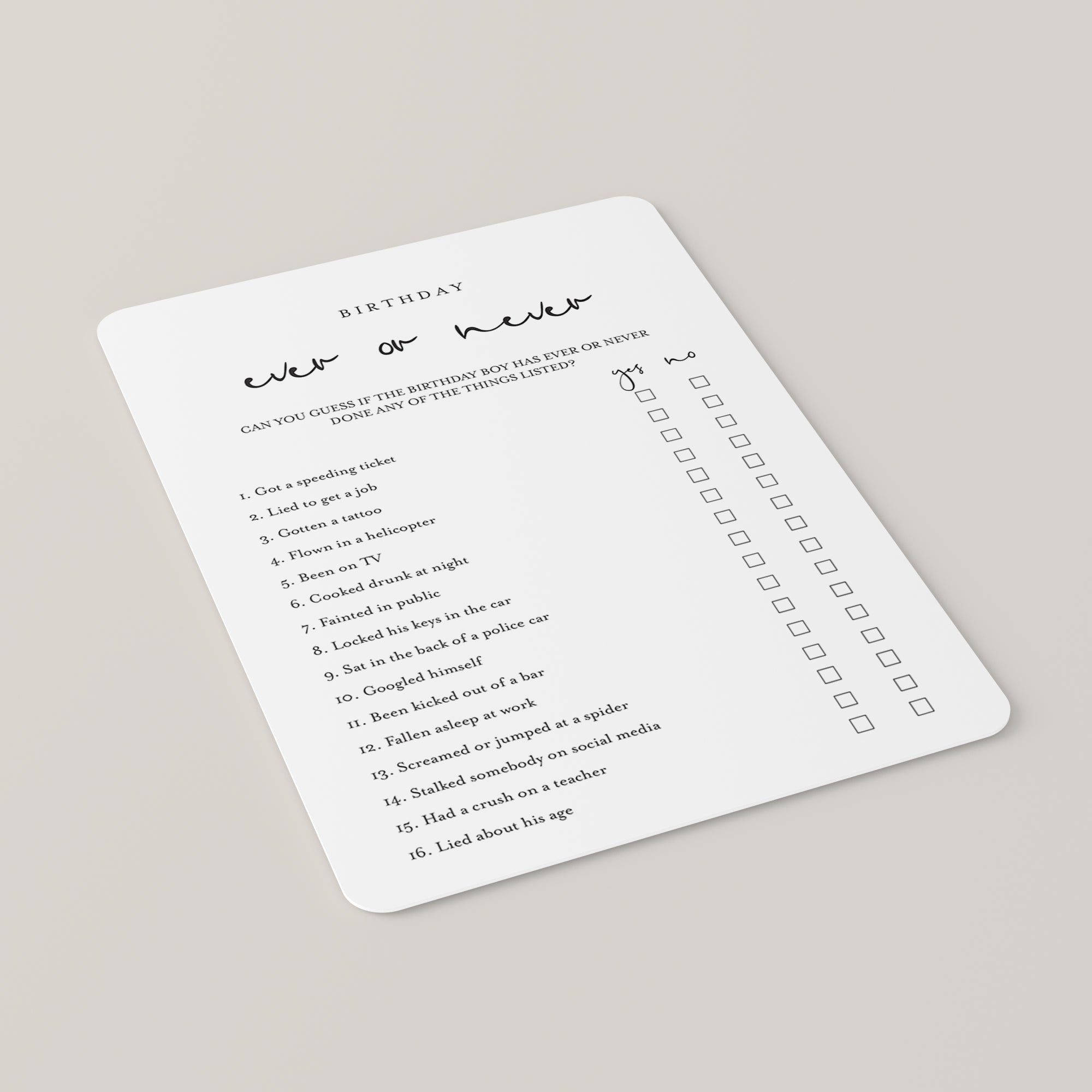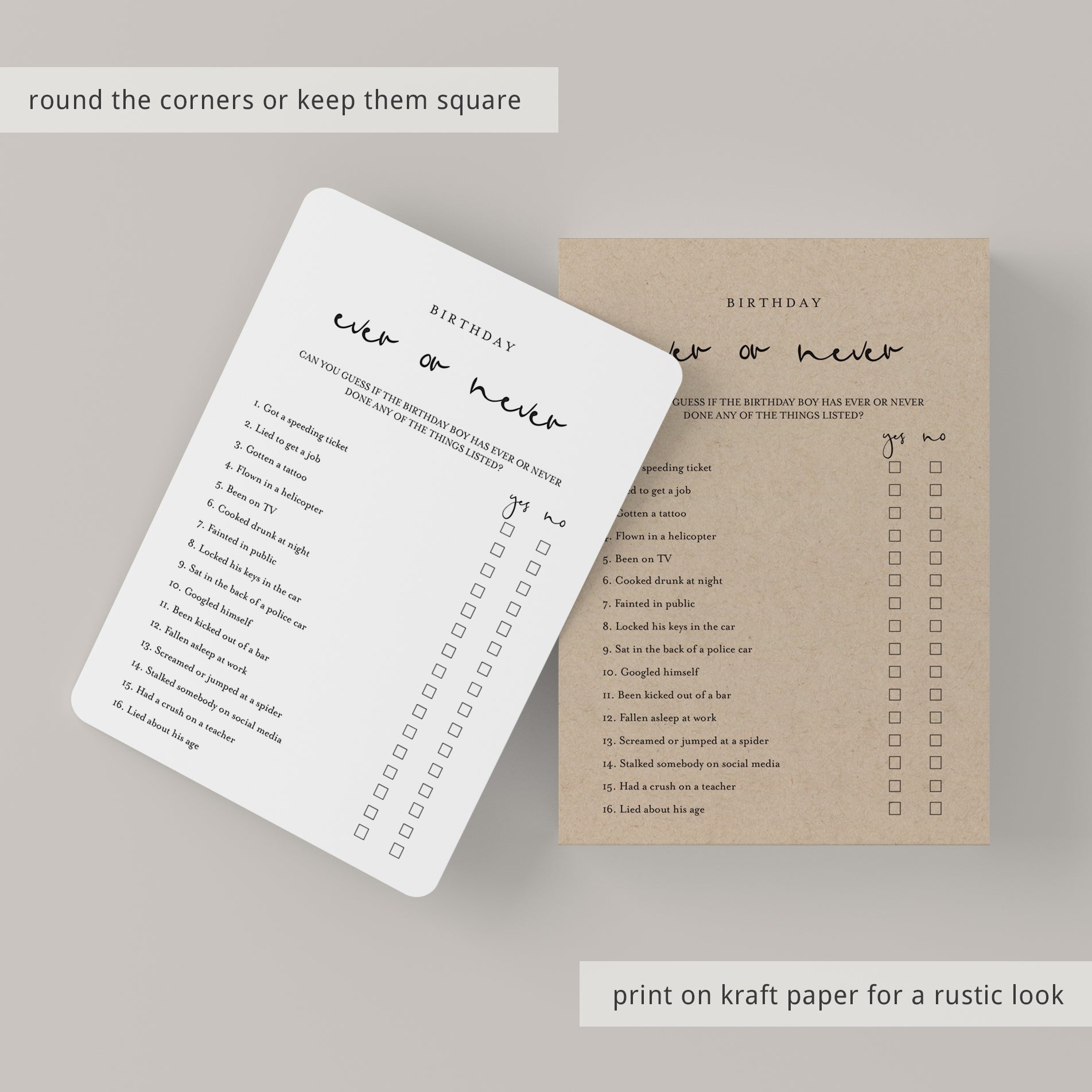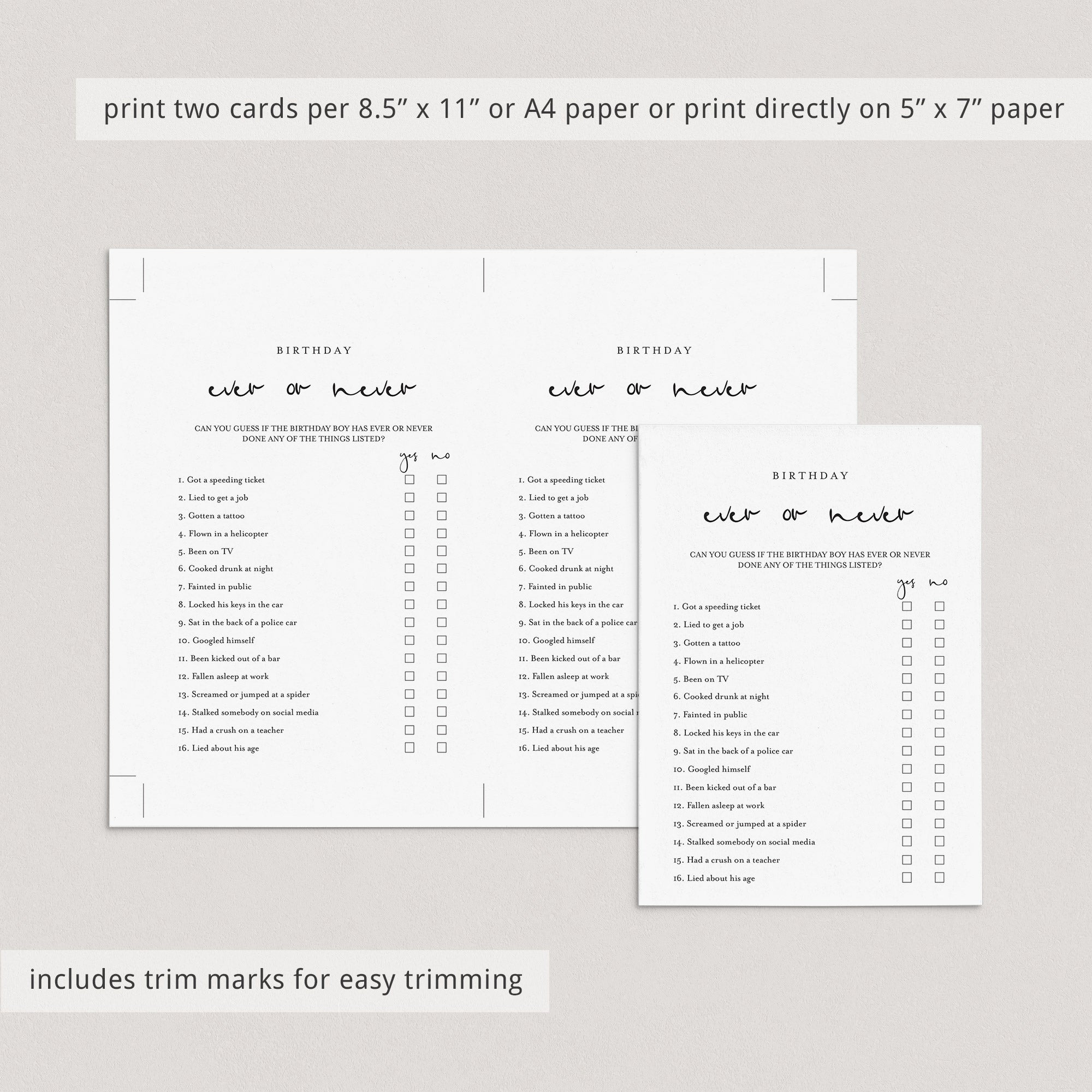 Have the birthday boy fill out this ever or never game card as an answer key before the party starts. Then compare his responses to what your party guests guessed. The player with the most correct wins bragging rights.