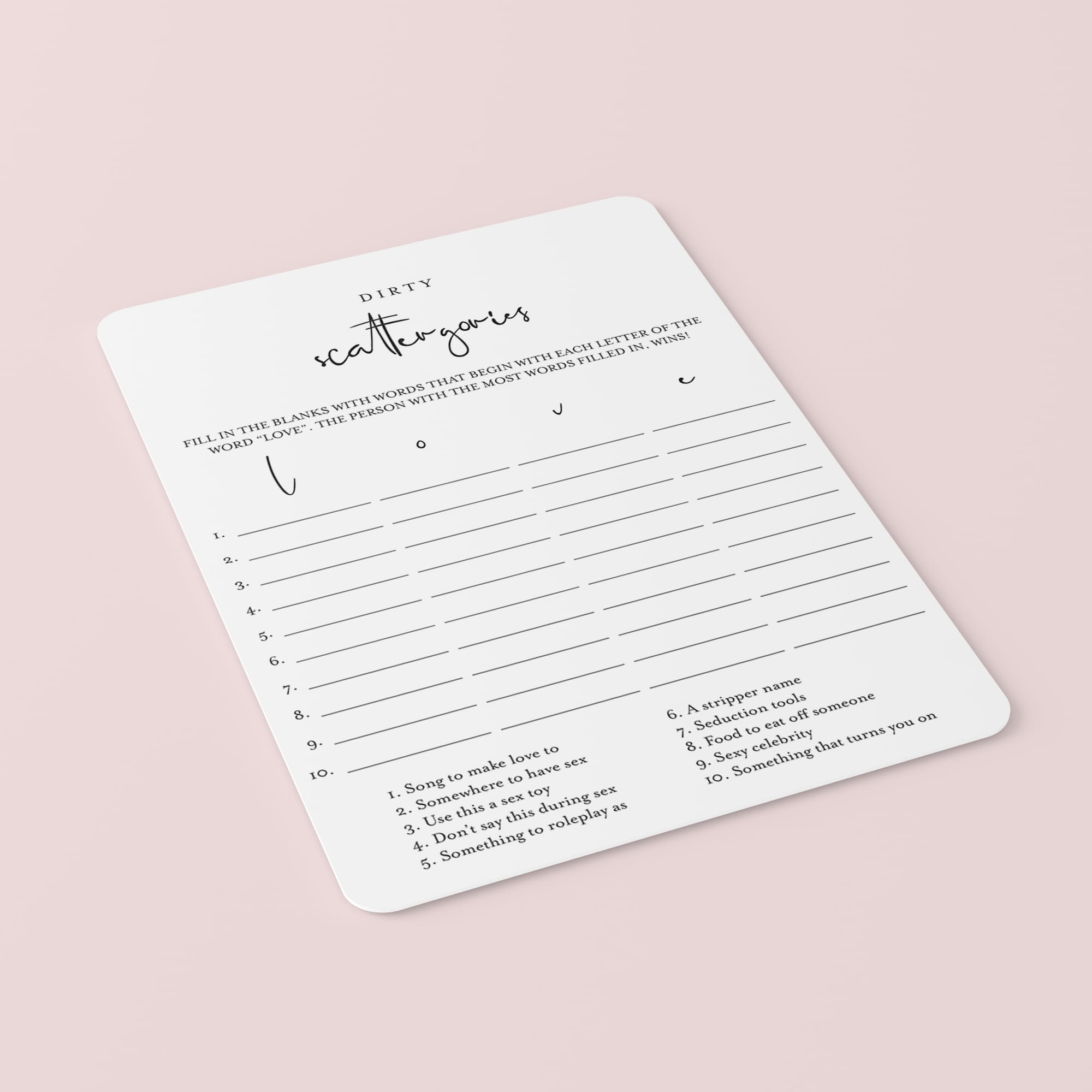 The game is very easy to play. Simply hand out this modern minimalist Dirty Scattergories game to your guests. They will have to come up with as many words related to the naughty categories at the bottom of the sheet. The difficulty is that the words must begin with the letters in the word "LOVE". The person that gets the most answers filled in within the set time, wins!