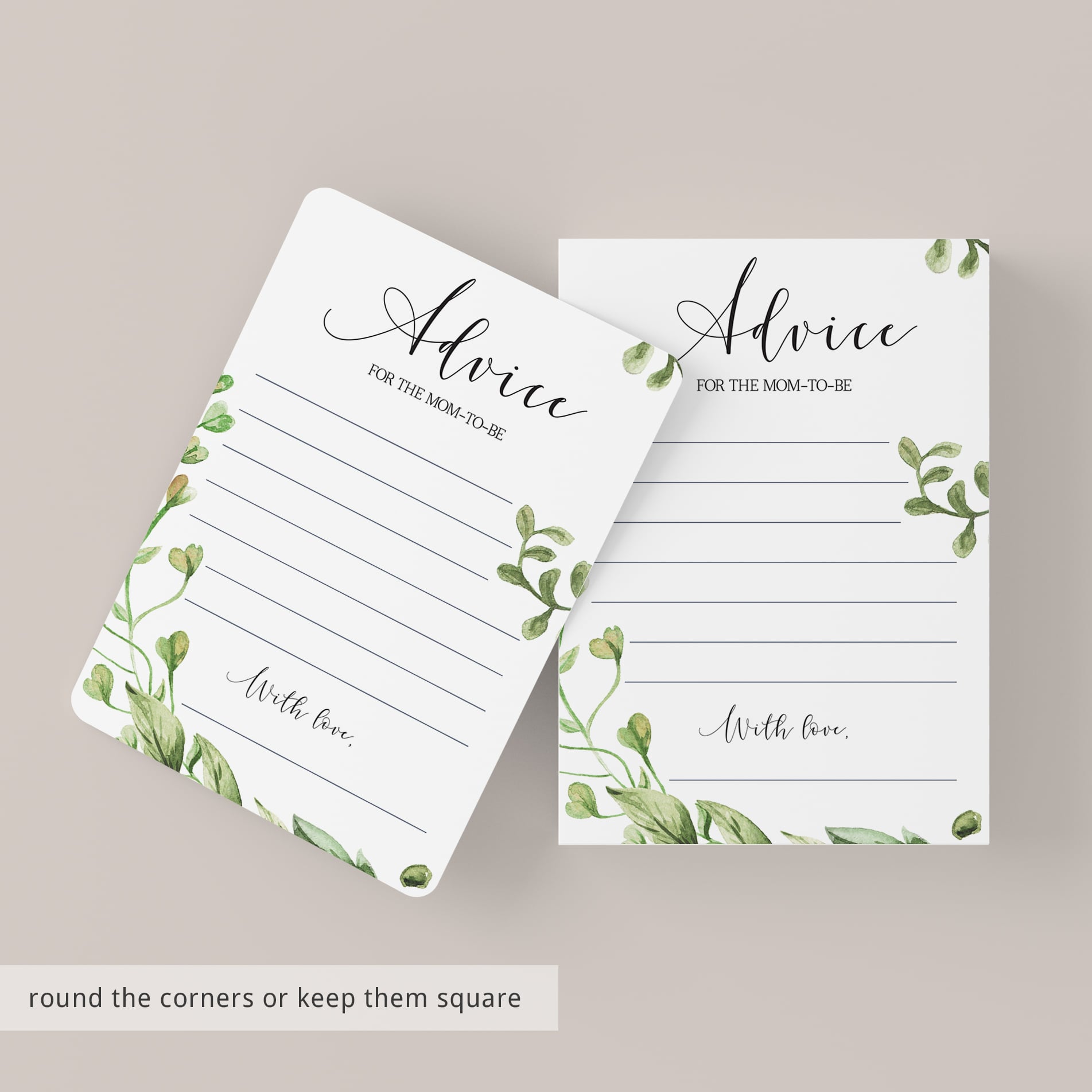 Create a meaningful keepsake for the mommy-to-be with these baby shower advice for the mom-to-be cards with watercolor greenery. Let every guest write down their best advice for the new mom and collect the cards for the lucky girl.