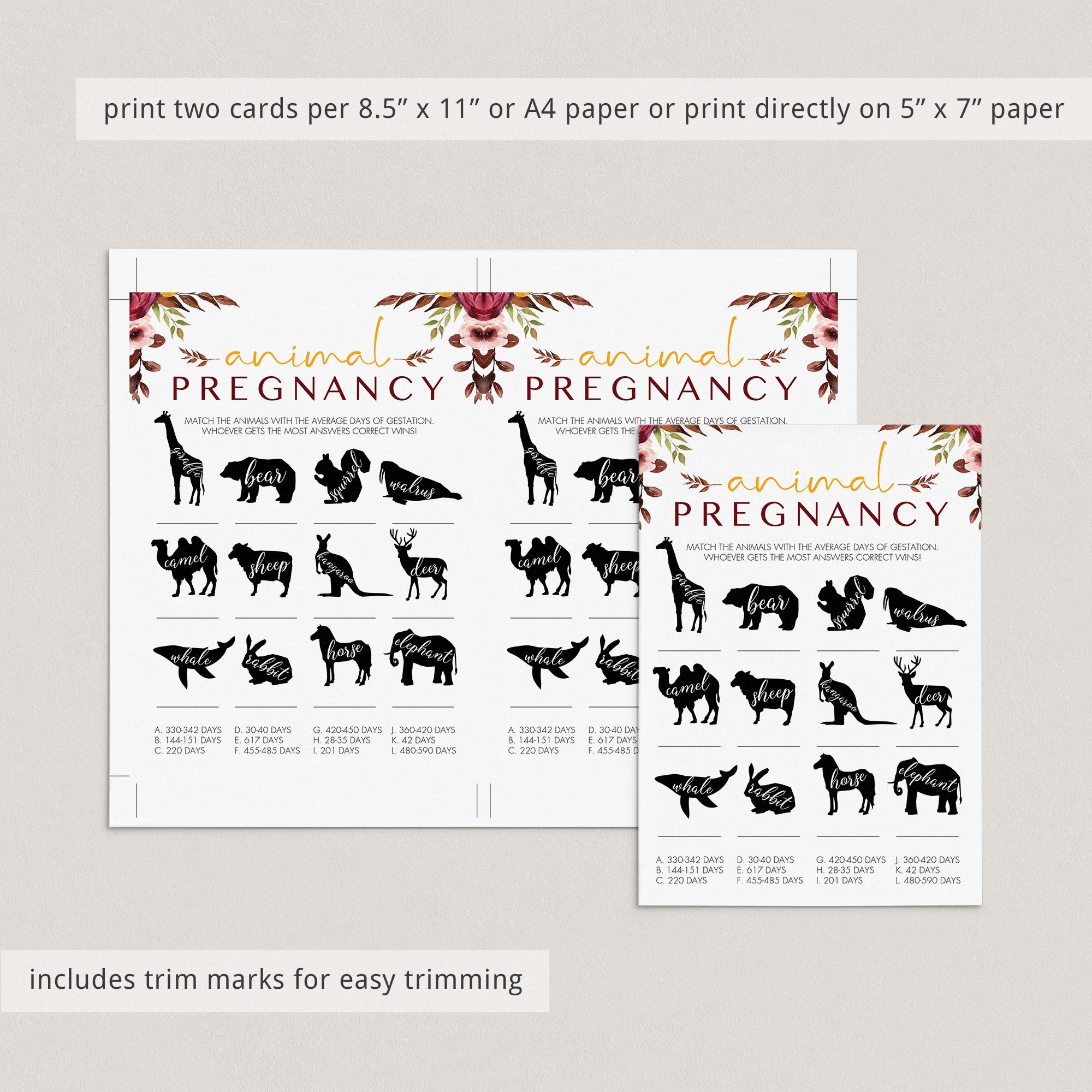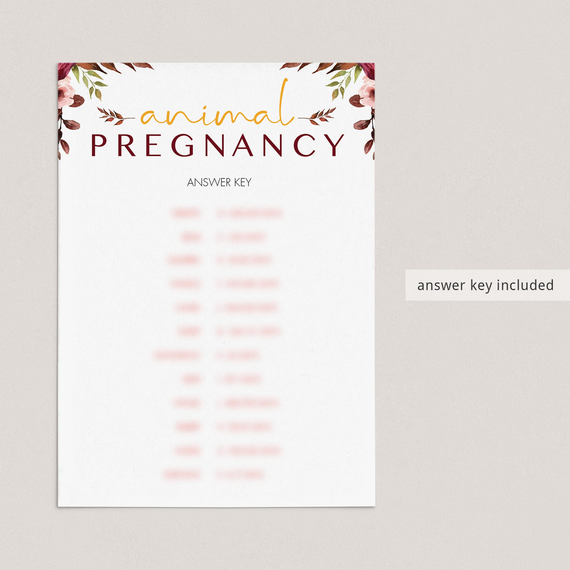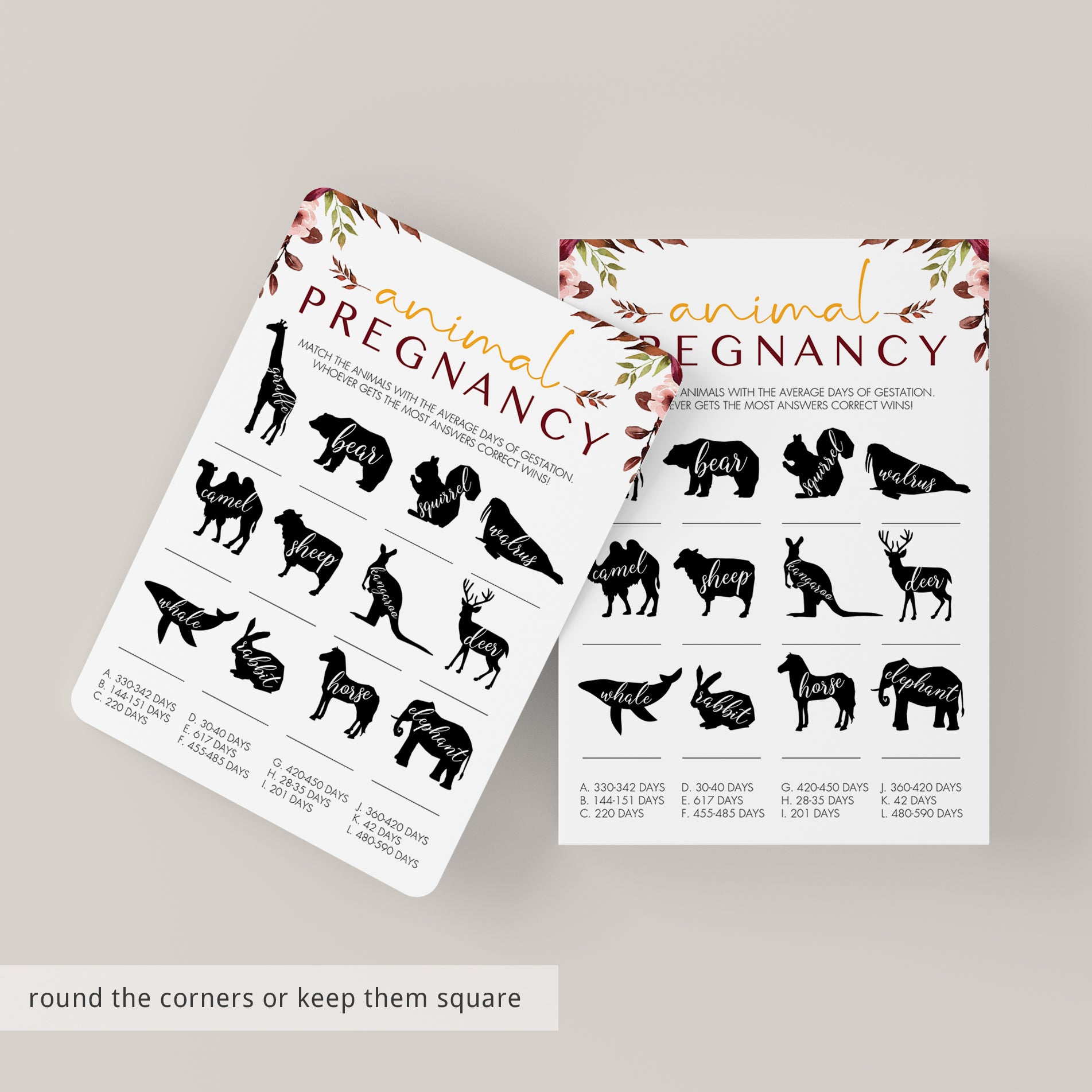 Test your baby shower guests' knowledge of animal gestation periods with this fall inspired Animal Pregnancy Baby Shower Game. The game with burgundy flowers and autumn colored leaves is perfect for your fall baby shower. Animal games are always a huge hit at baby showers.