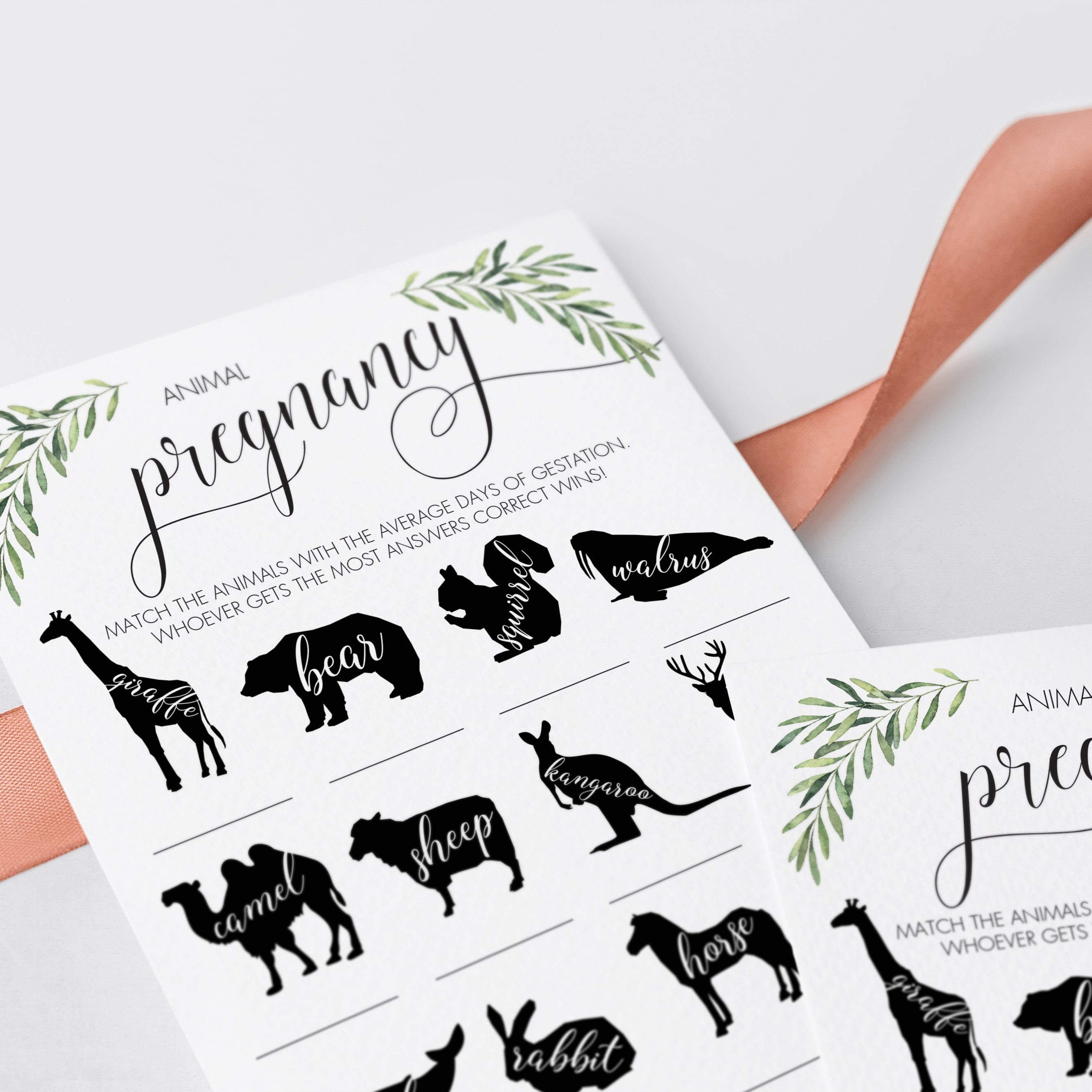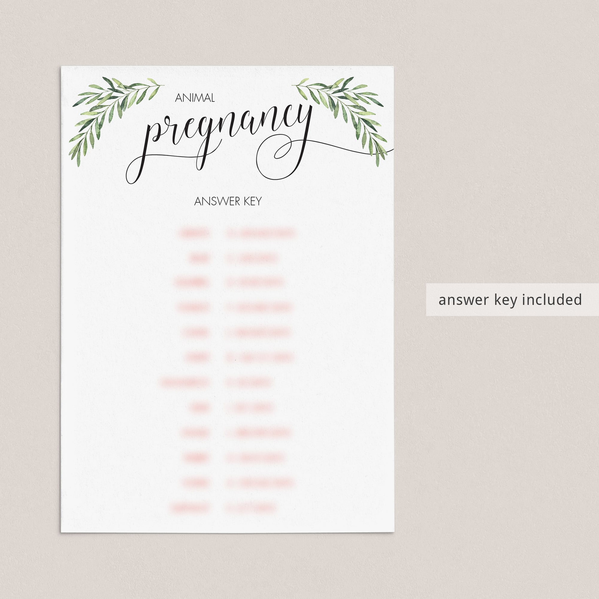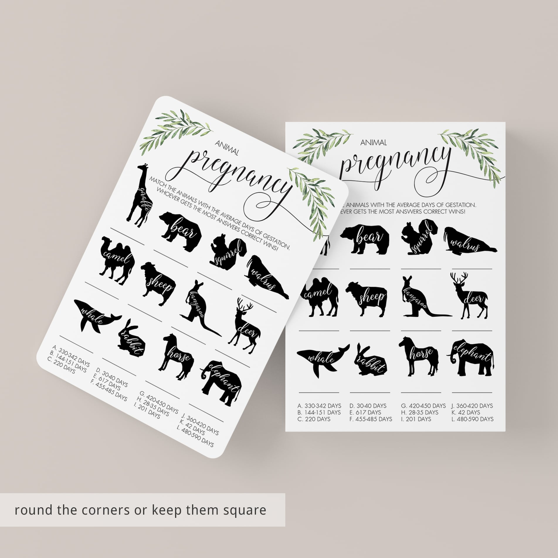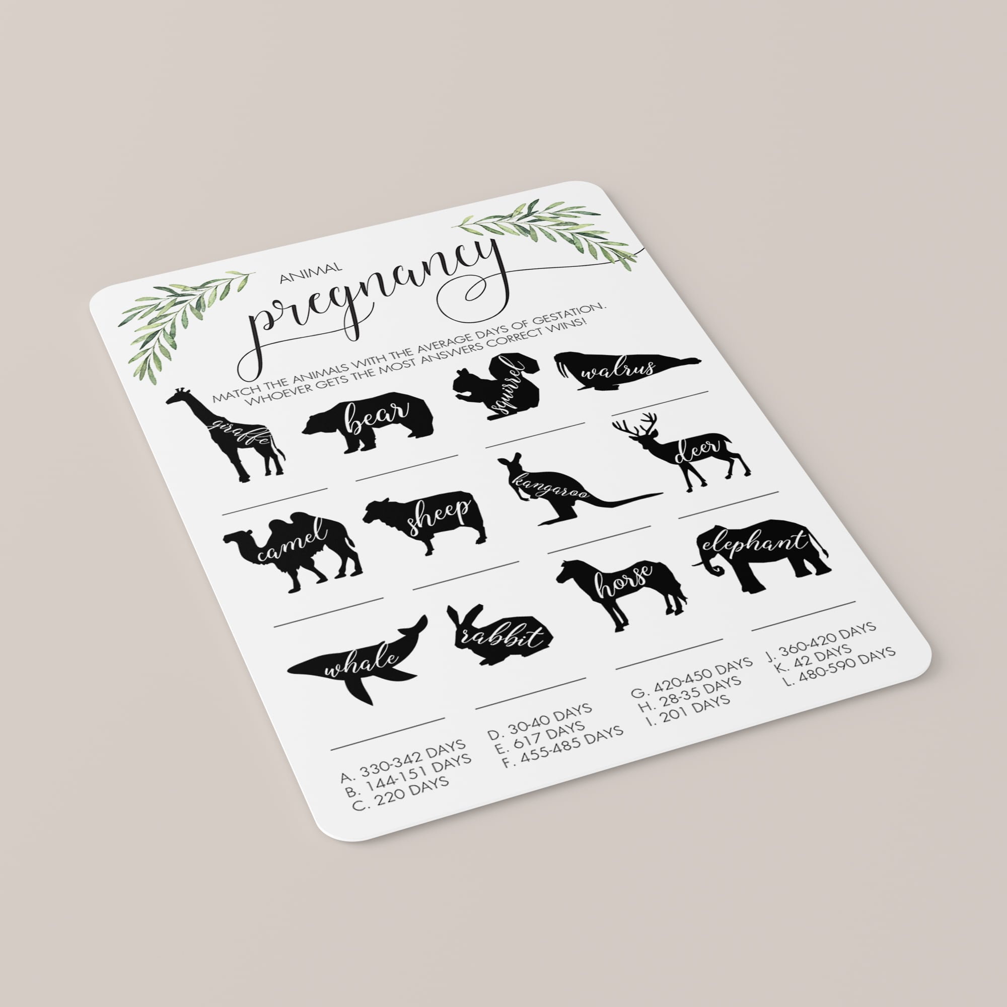 Test your guests' knowledge of animal gestation periods with this Animal Pregnancy Game for a Gender Neutral Baby Shower. The printable game card with animal silhouettes and watercolor greenery is perfect for a neutral baby party.
