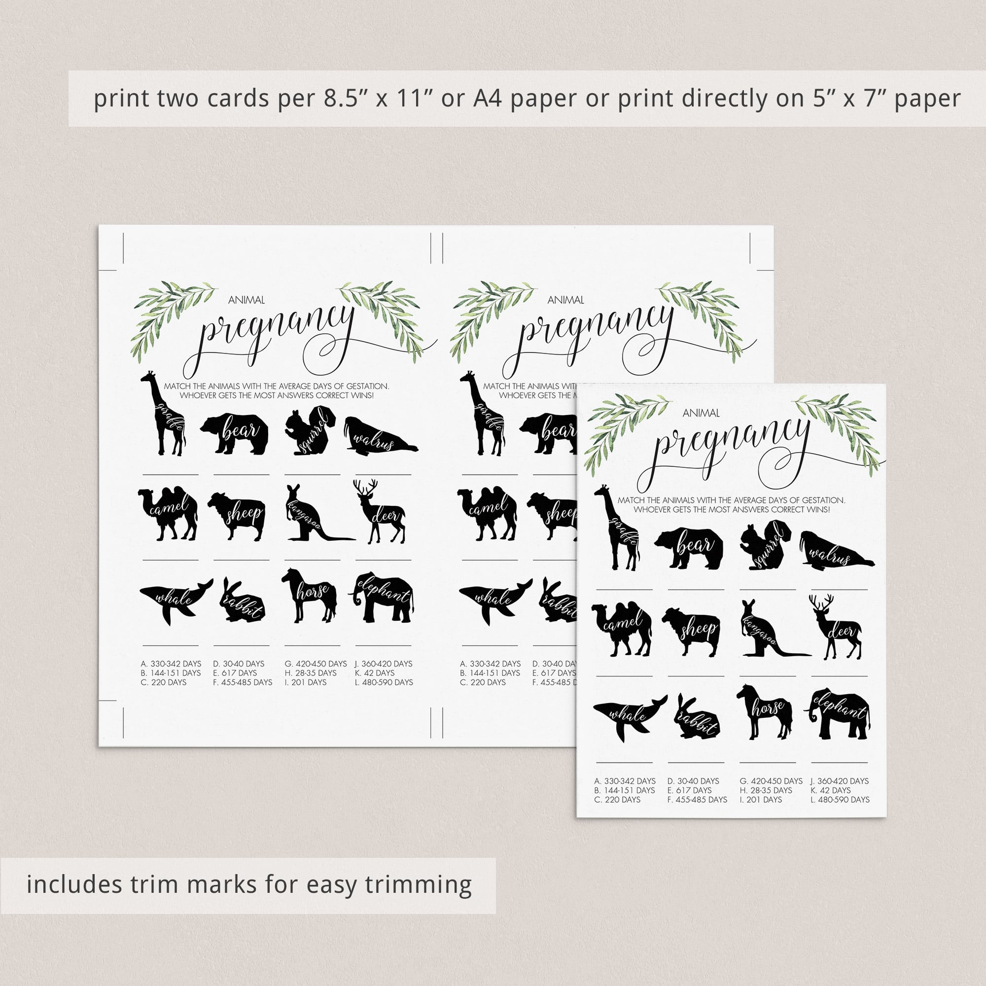 The printable Animal Pregnancy game is an instant downloadable file. Simply download and print the cards as many times as you need. Print right from your computer in a matter of minutes or have the cards printed at your favorite print shop.