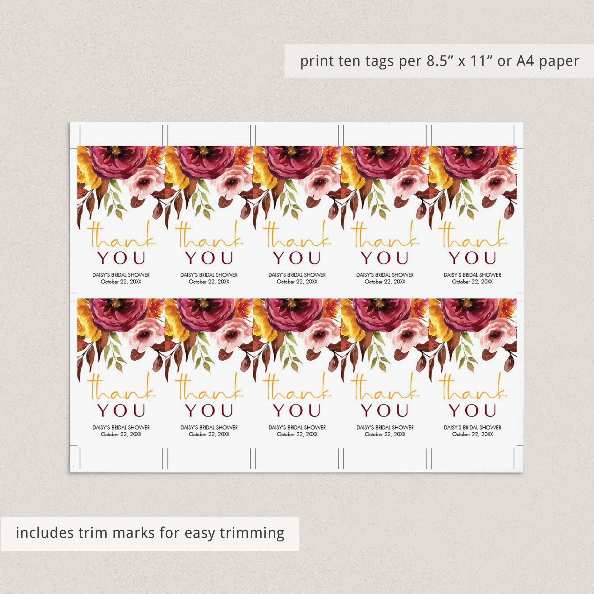 Are you hosting an autumn bridal shower? Thank your guests for coming with these gorgeous autumn themed favor tags with burgundy flowers. The autumn themed tag is an editable PDF-template. Easily edit the text yourself in the free version of Adobe Acrobat Reader and personalize the favor tag with your own words.