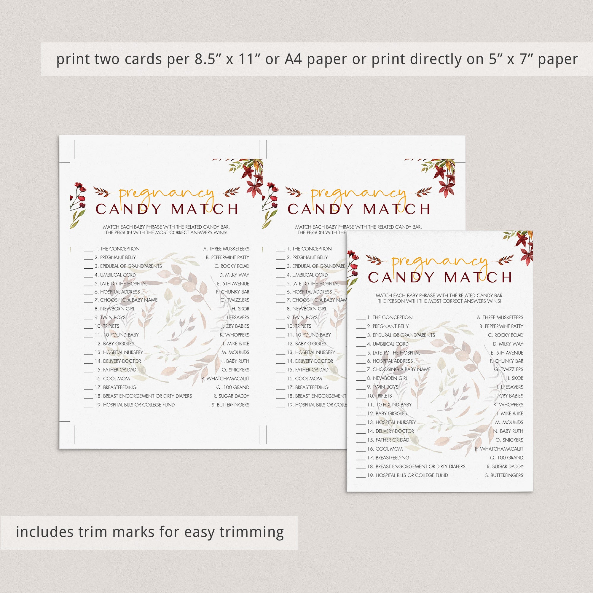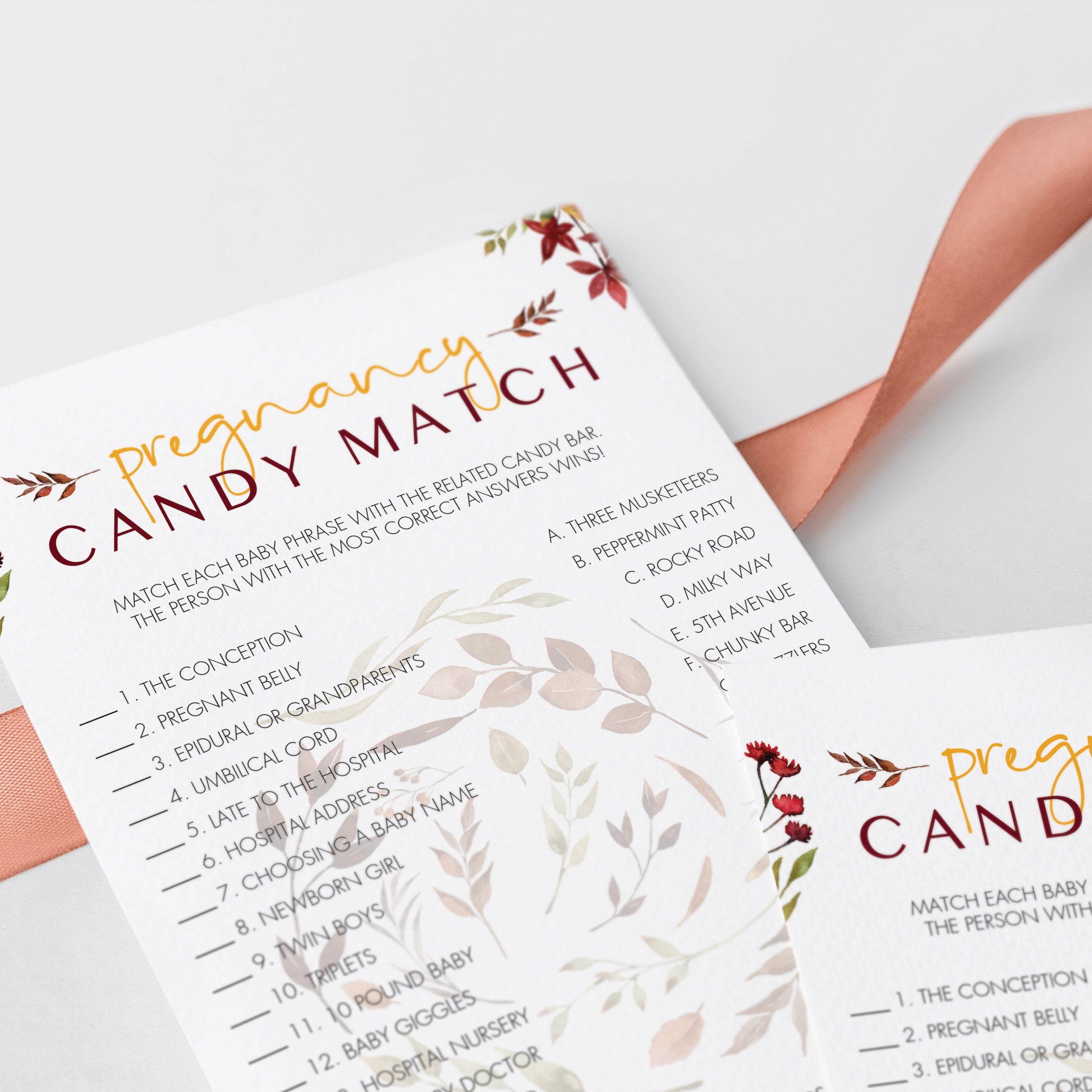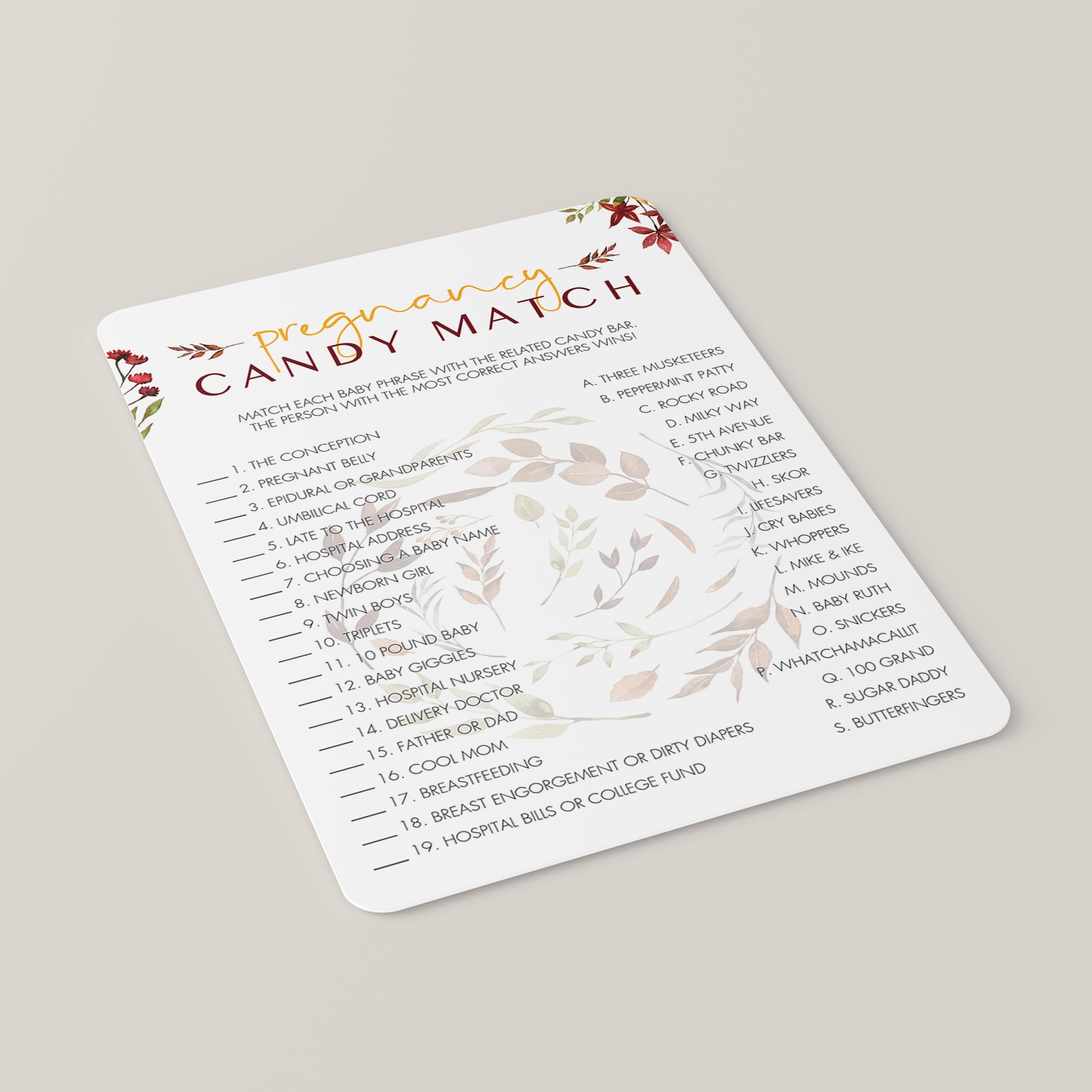 This baby shower Pregnancy Candy Match game with watercolor autumn leaves and burgundy flowers has a list of 19 candies and baby-related words that go along with each candy. For example, “breastfeeding” is a match with the “Milky Way” candy. The first one to match all 19 candy bars (or have the most correct) wins some tasty treats. The game is the perfect addition to your autumn baby shower.