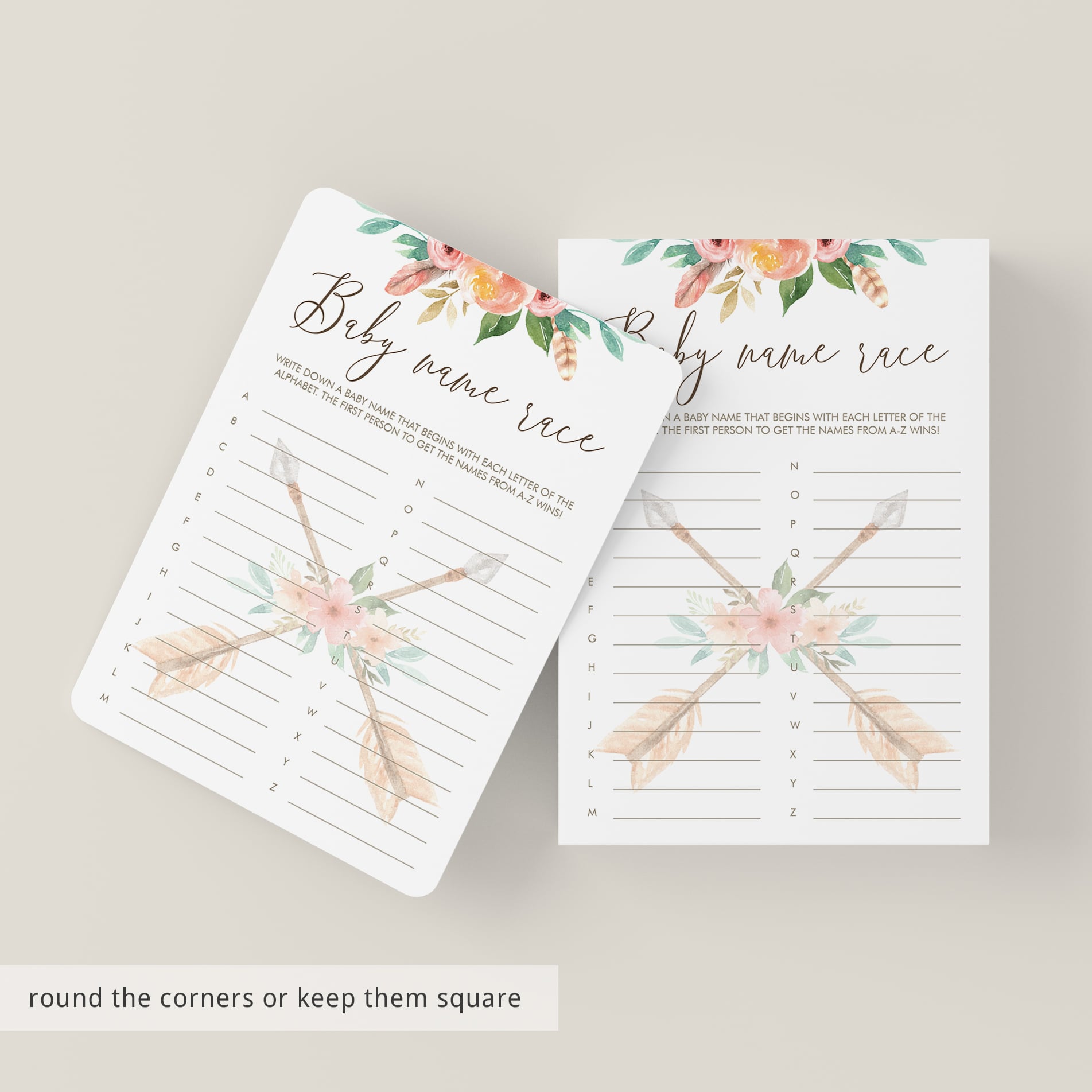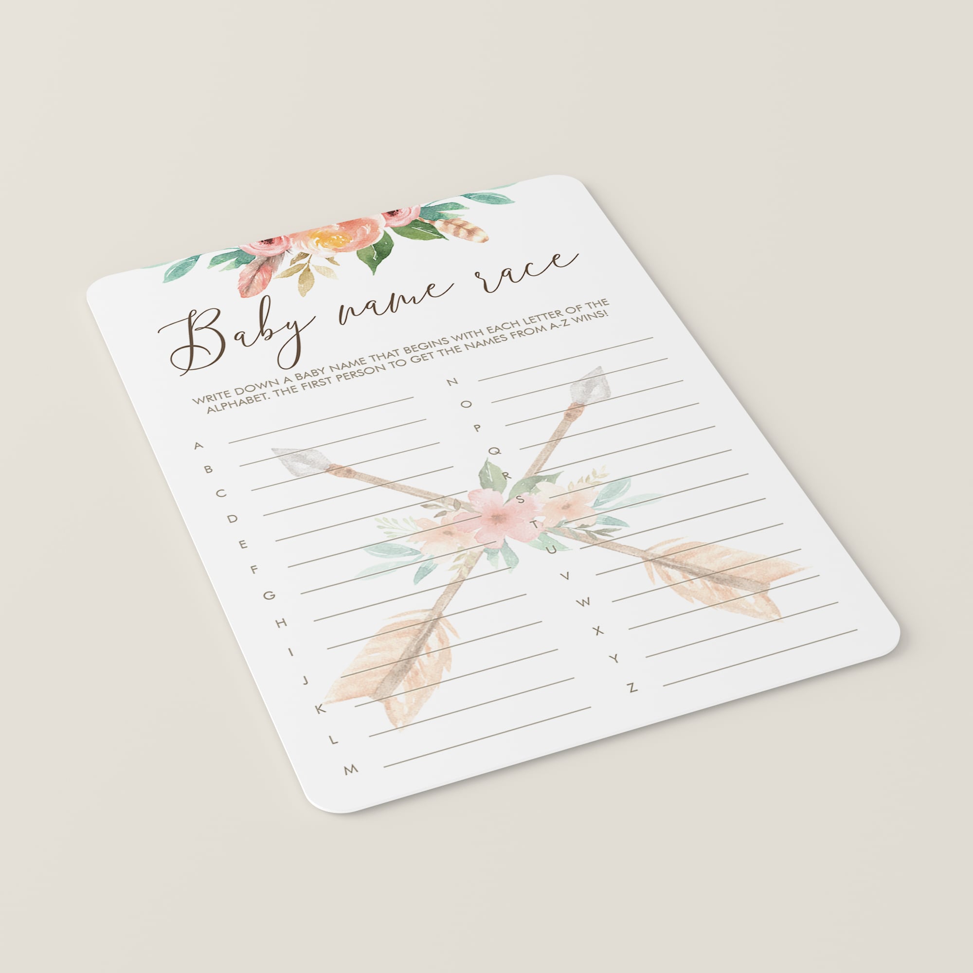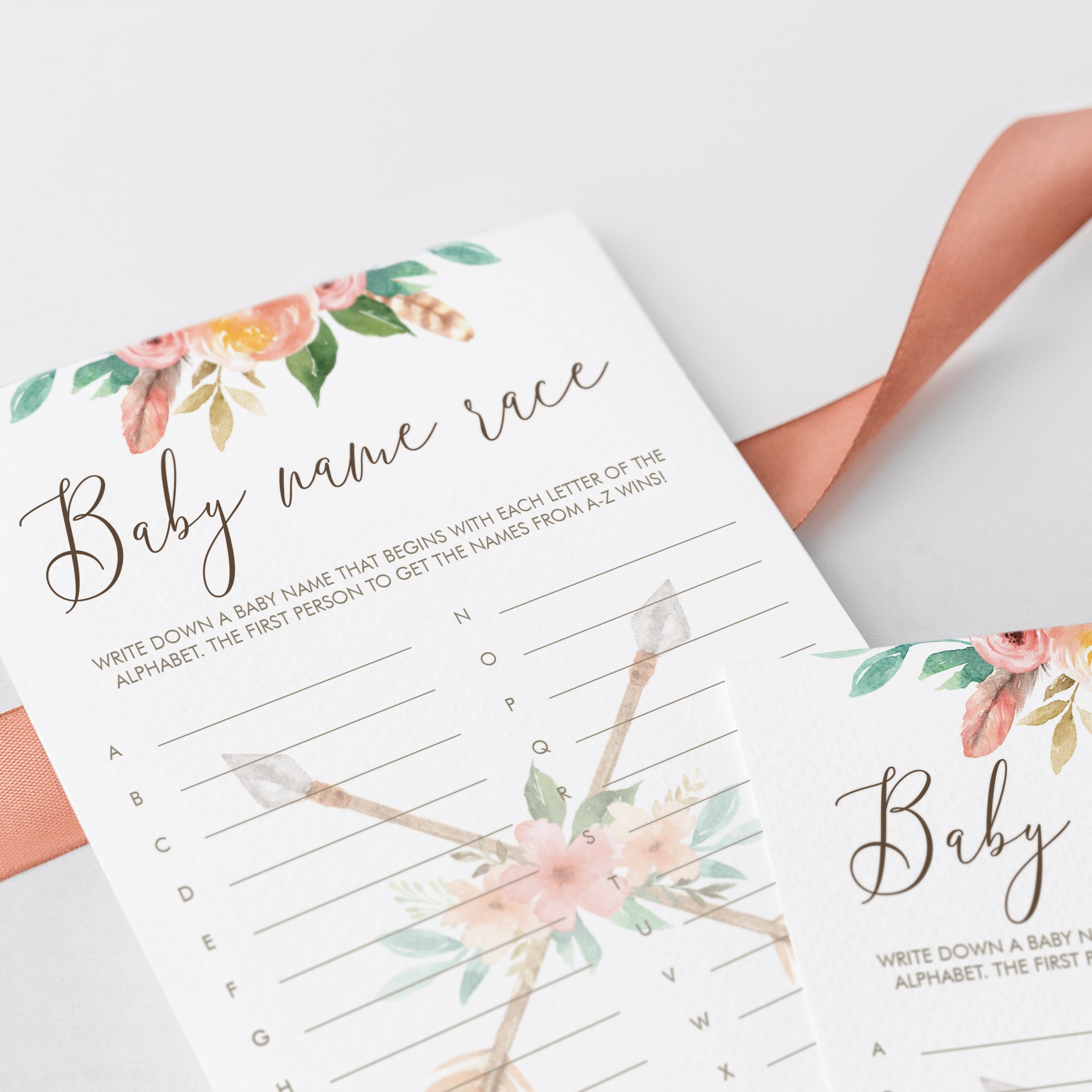 How many baby names do you know? Play Baby Name Race with this unique baby shower game with pink watercolor flowers.