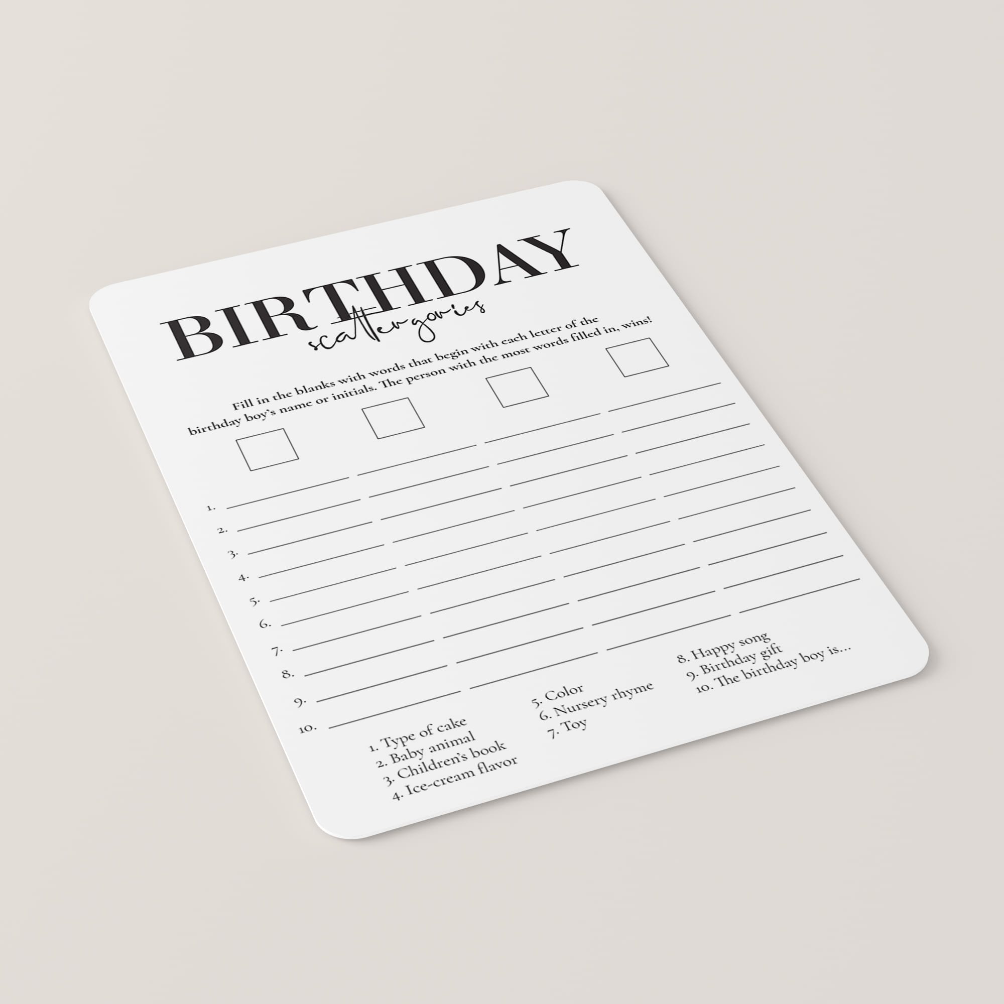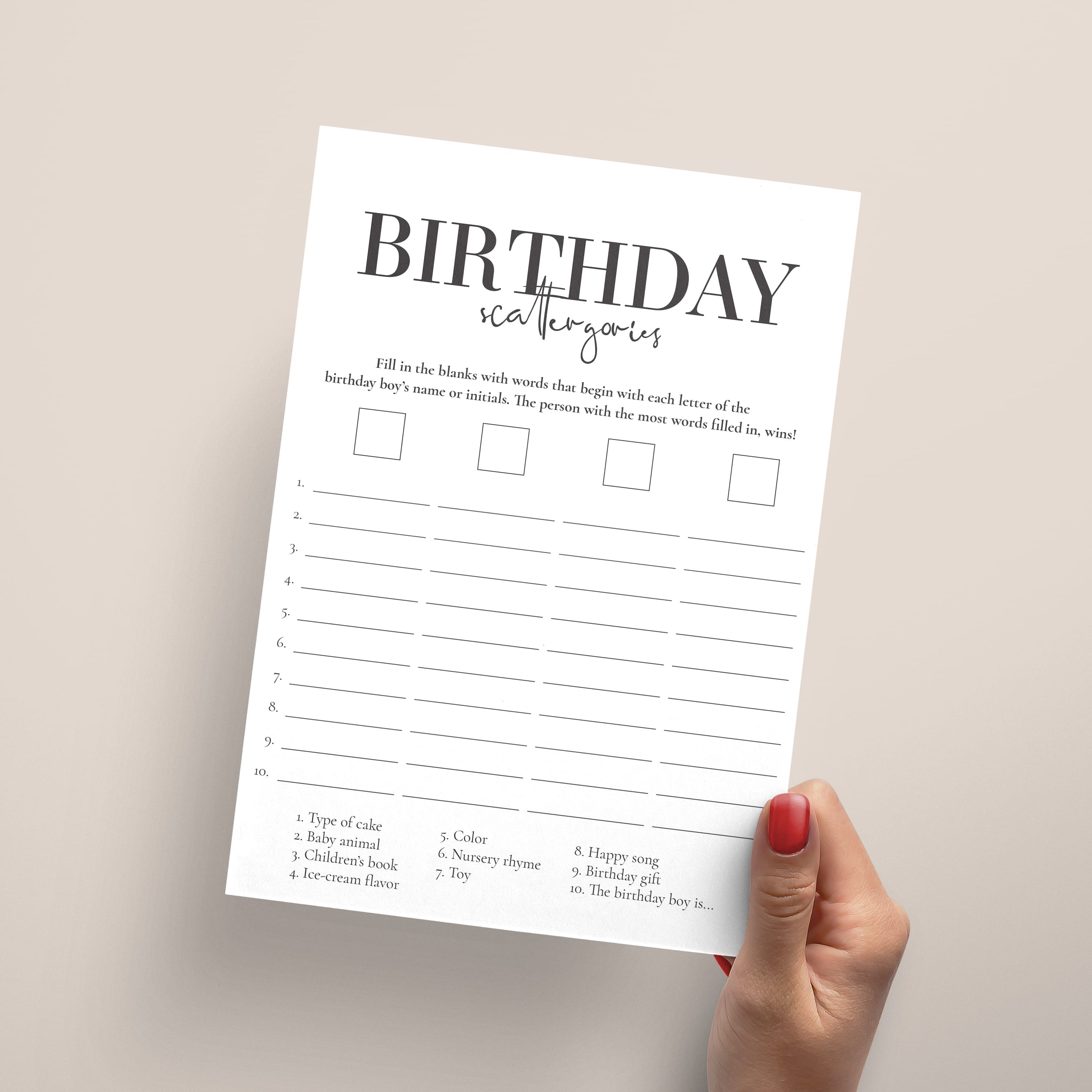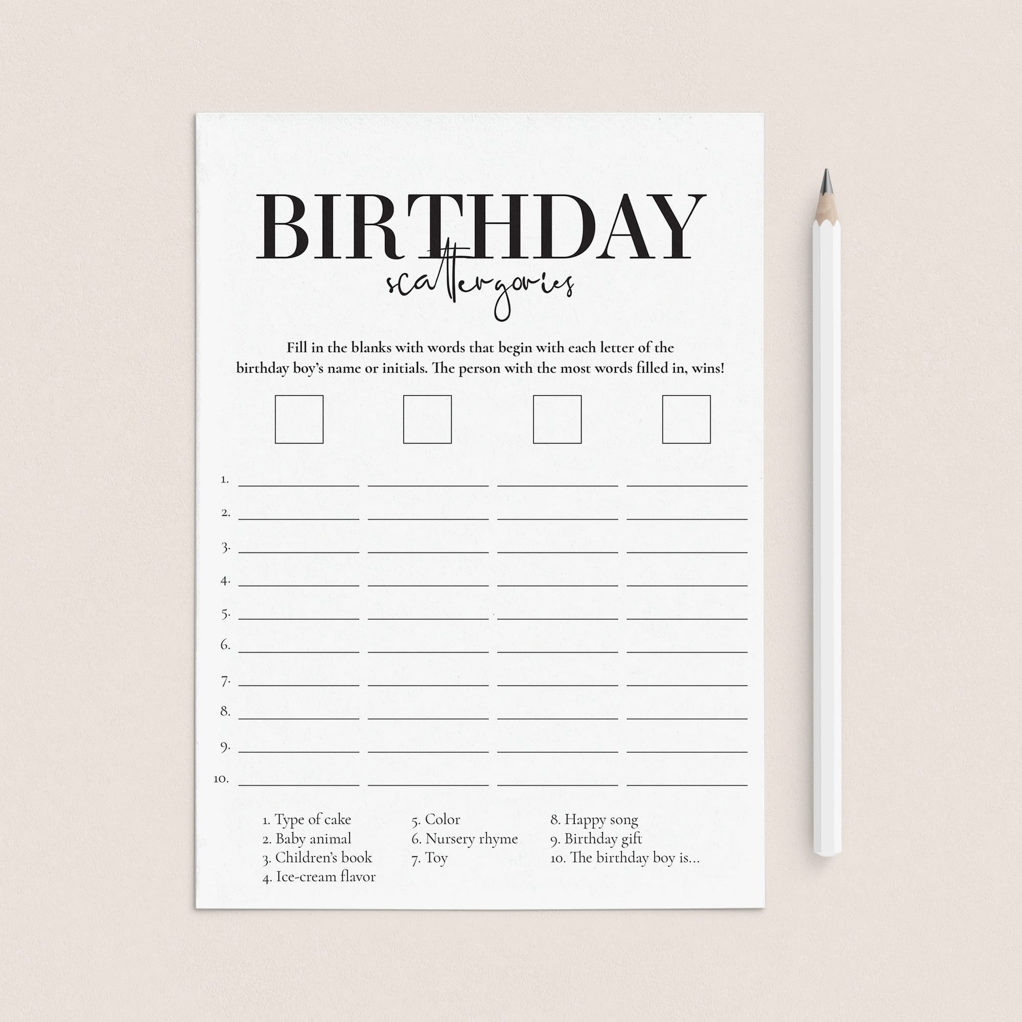 How to play the Birthday Scattergories game? Simply hand out a game sheet and a pen to your guests. Let them fill in the letters of your boy's name (or his initials) in the squares. Then they will have to come up with as many words related to the categories at the bottom of the sheet. The difficulty is that the words must begin with the letters in the squares. The person that gets the most answers filled in within the set time, wins!