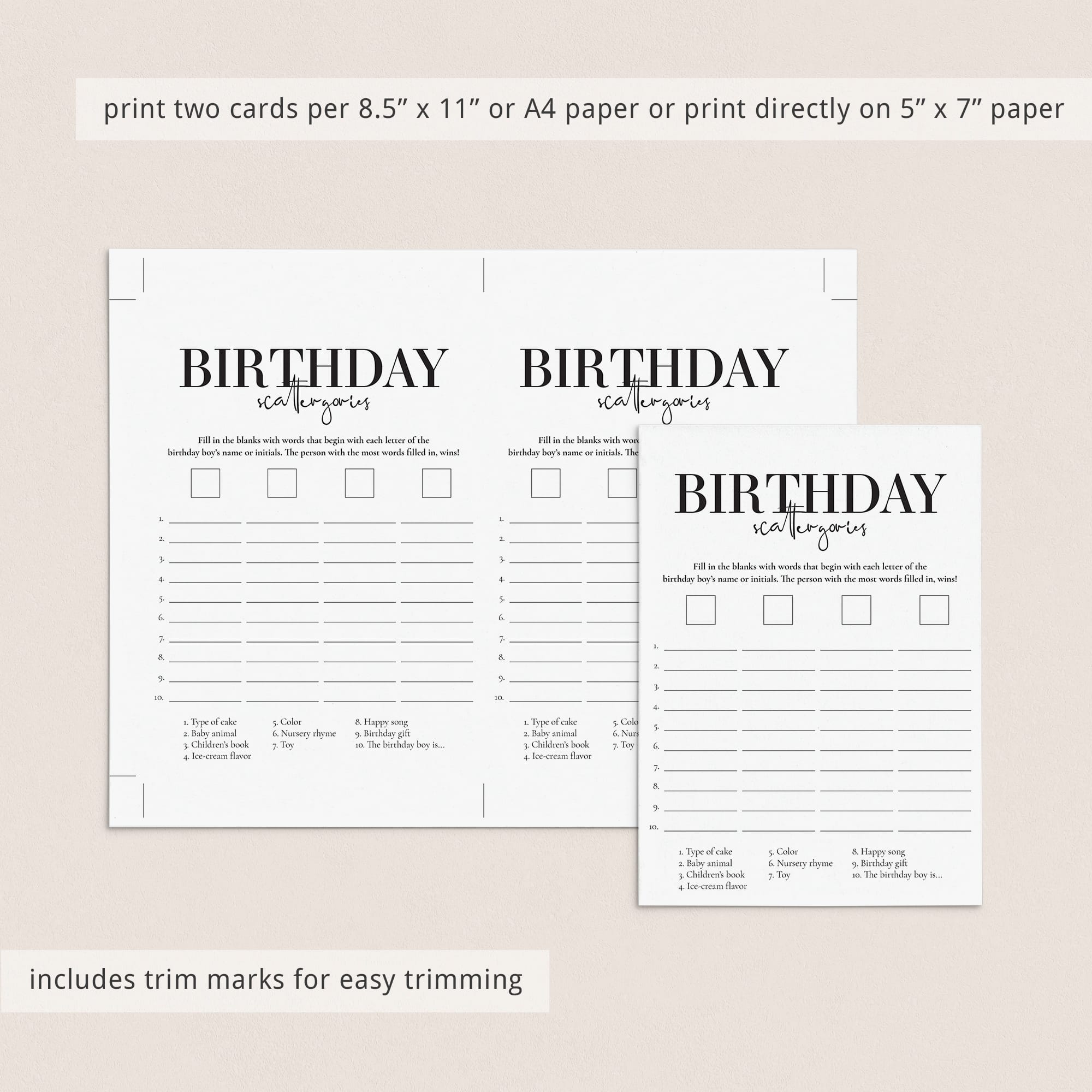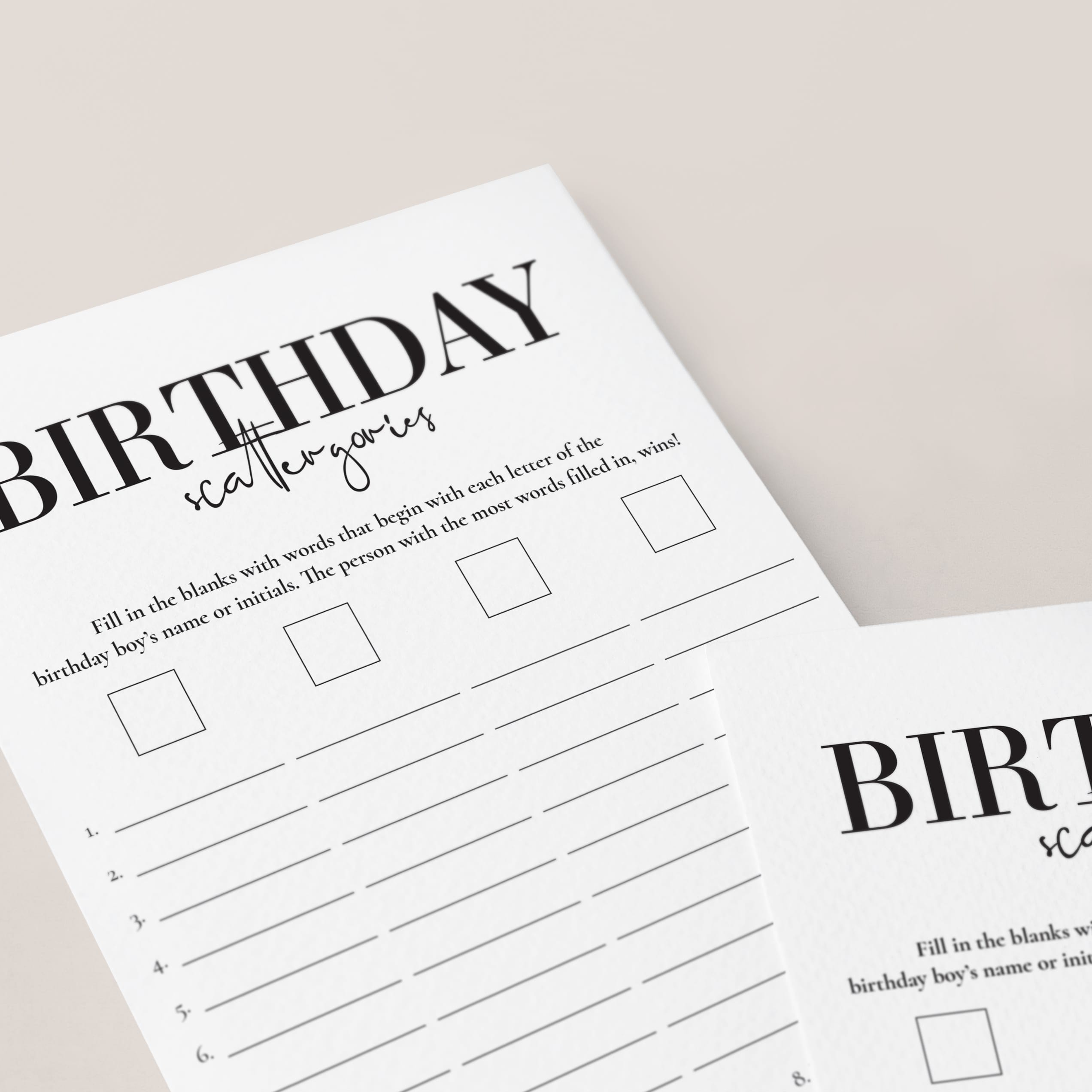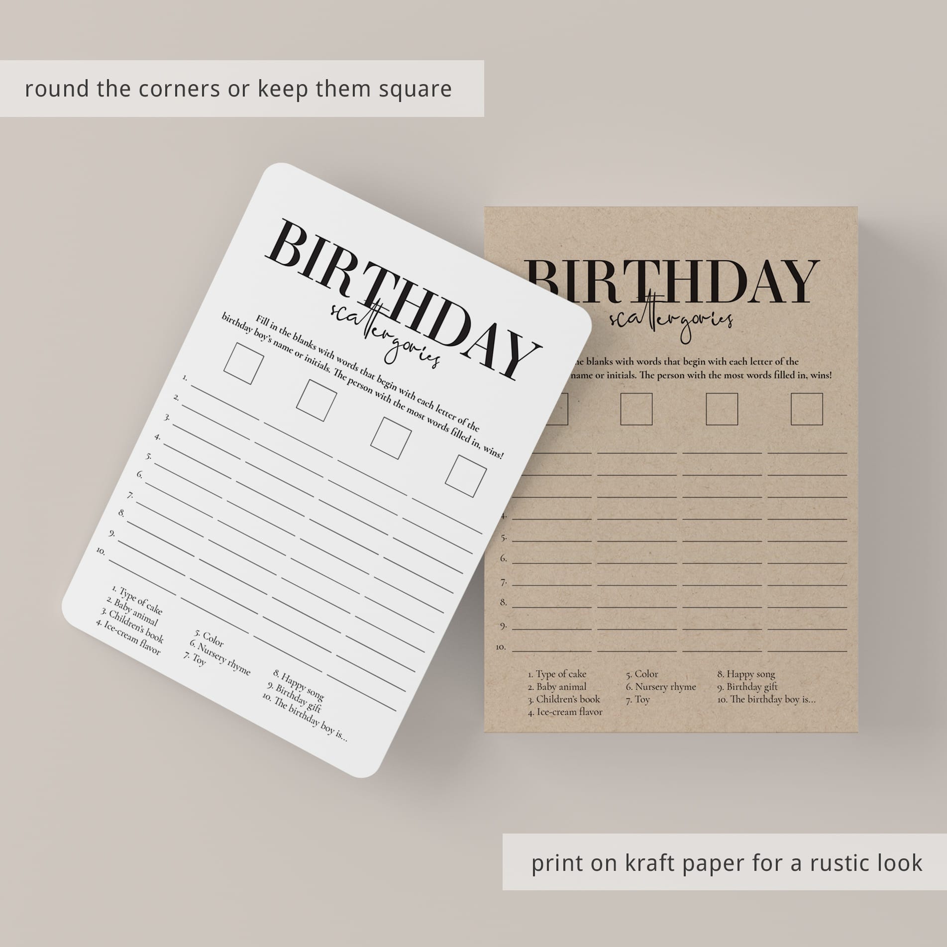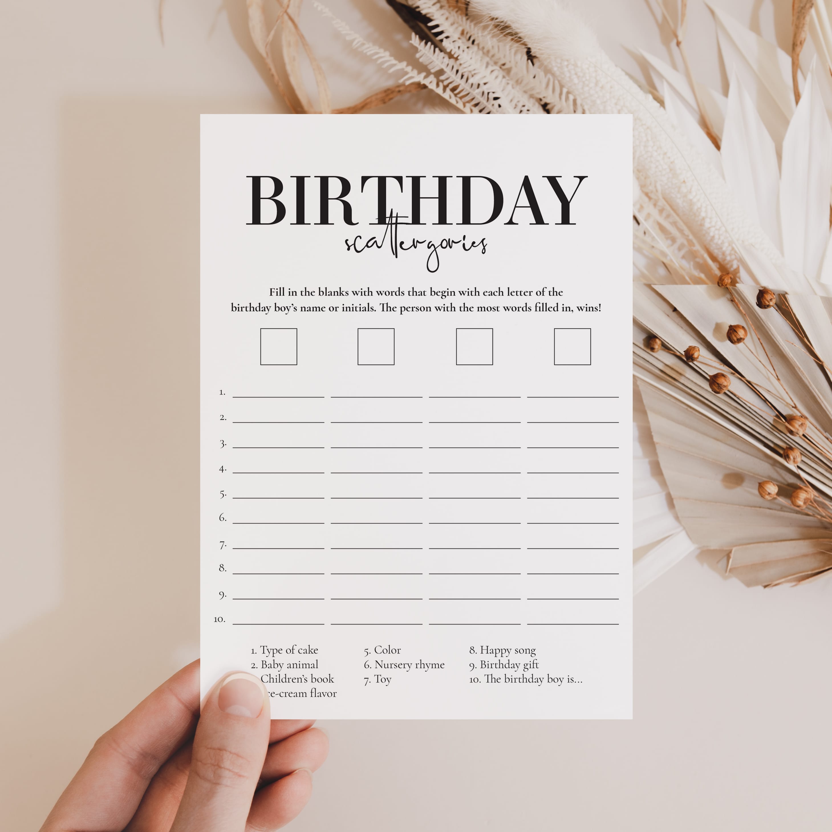 How to play the Birthday Scattergories game? Simply hand out a game sheet and a pen to your guests. Let them fill in the letters of your boy's name (or his initials) in the squares. Then they will have to come up with as many words related to the categories at the bottom of the sheet. The difficulty is that the words must begin with the letters in the squares. The person that gets the most answers filled in within the set time, wins!