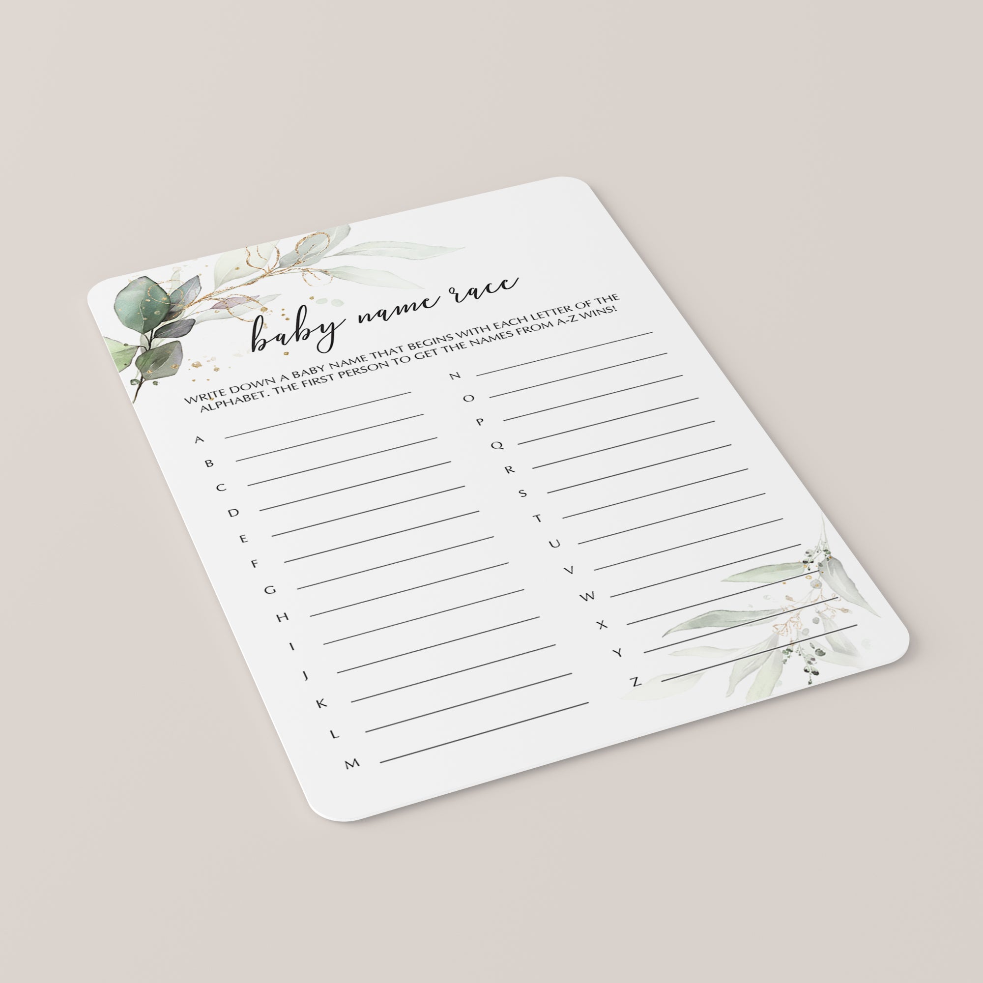 How many baby names do you know? Play Baby Name Race with this elegant baby shower Baby Names Game. It is the perfect addition to a greenery and gold themed baby shower.
