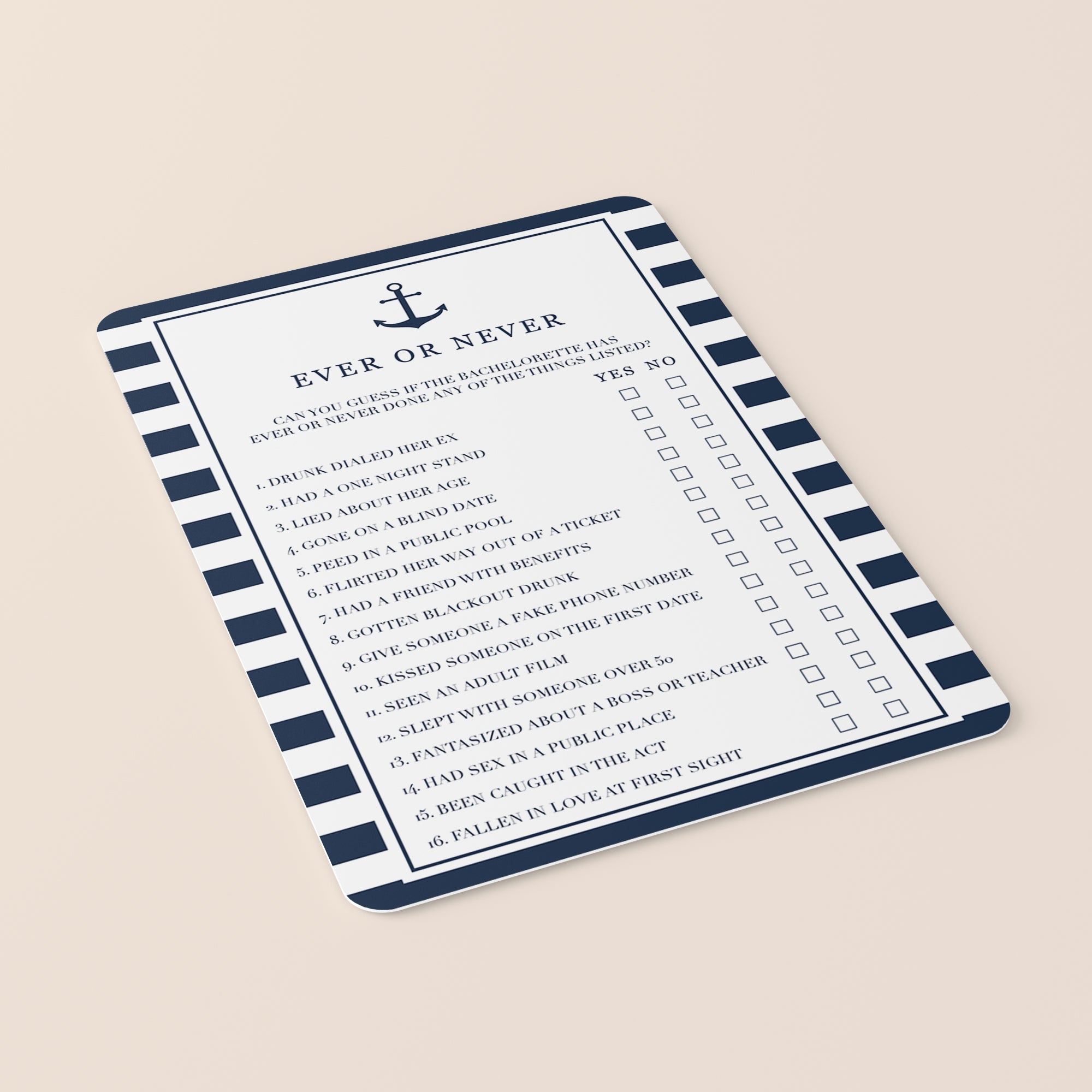 Are you looking for a fun bachelorette party game for your nautical theme bachelorette party? Play Ever or Never! Can you guess if the bachelorette has ever fantasized about her boss? Play this funny game to find out!